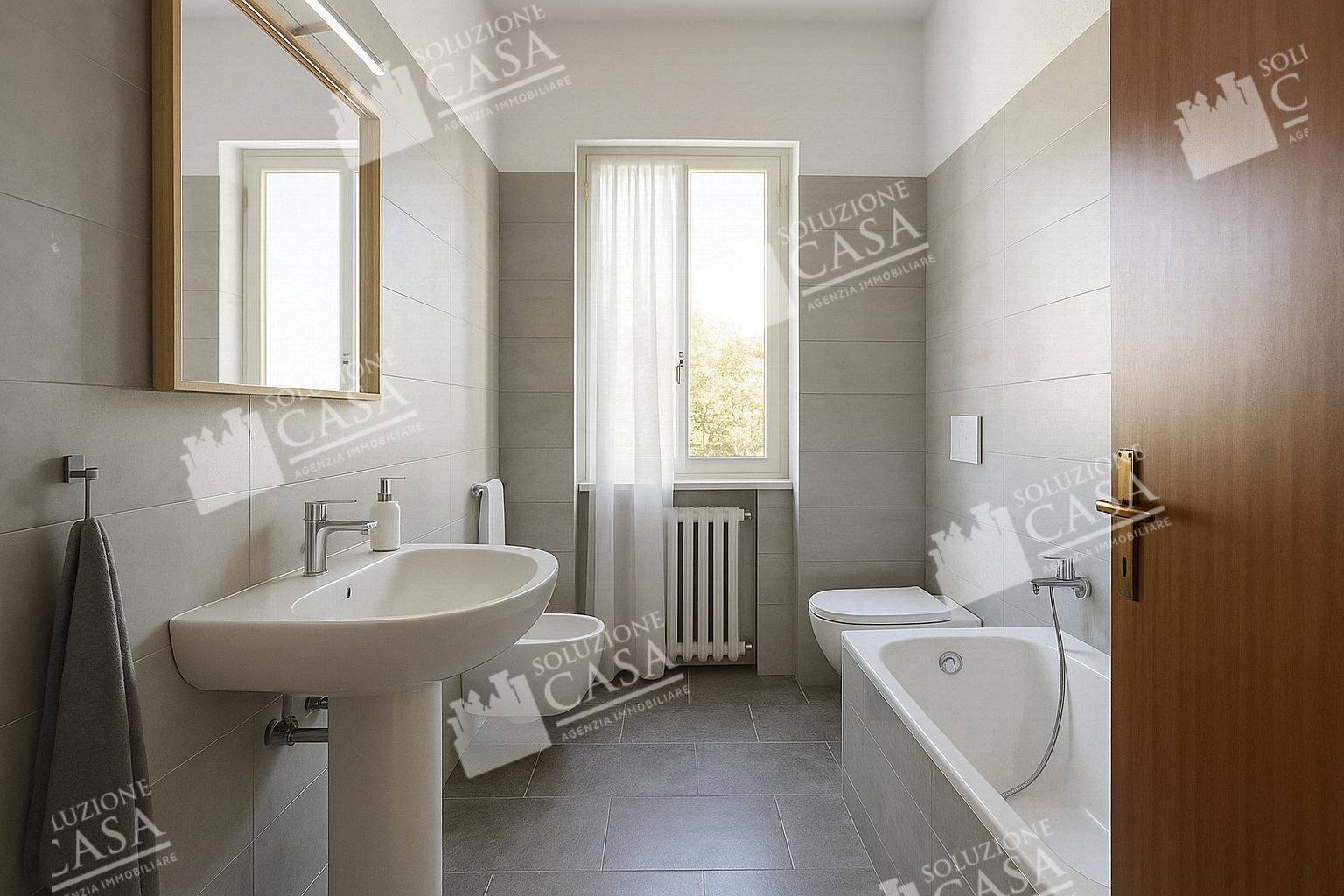 Bagno finestrato con impianti funzionanti (foto generate con AI). Completano la propriet un garage privato, comodo per il parcheggio o per il rimessaggio, e una grande cantina, ideale come spazio di deposito.