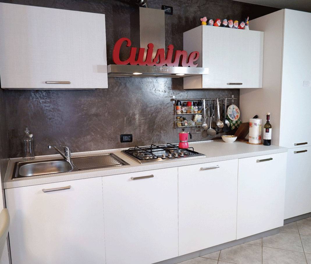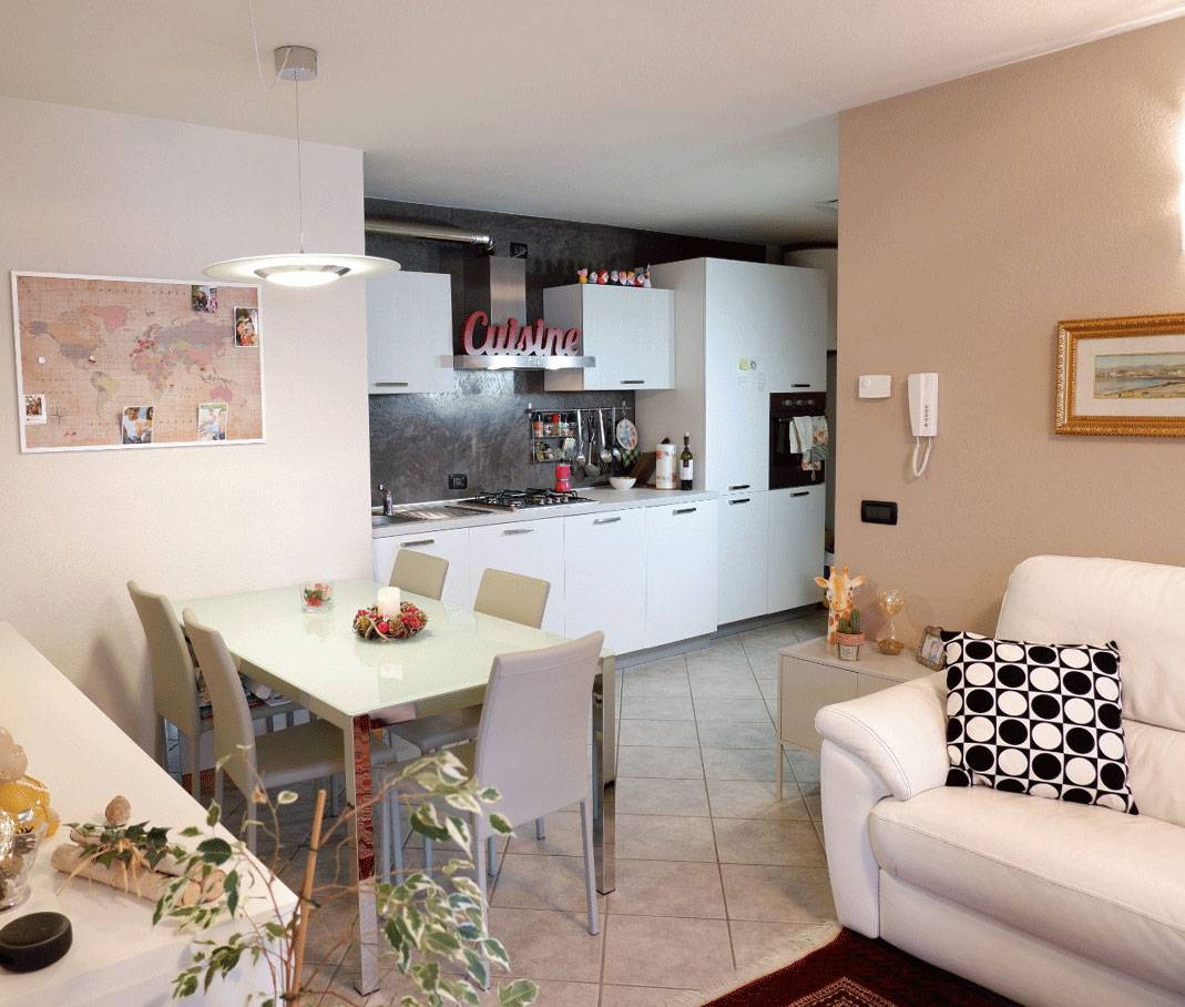 L'appartamento composto da un ampio soggiorno con cucina a vista, due camere da letto e un bagno.