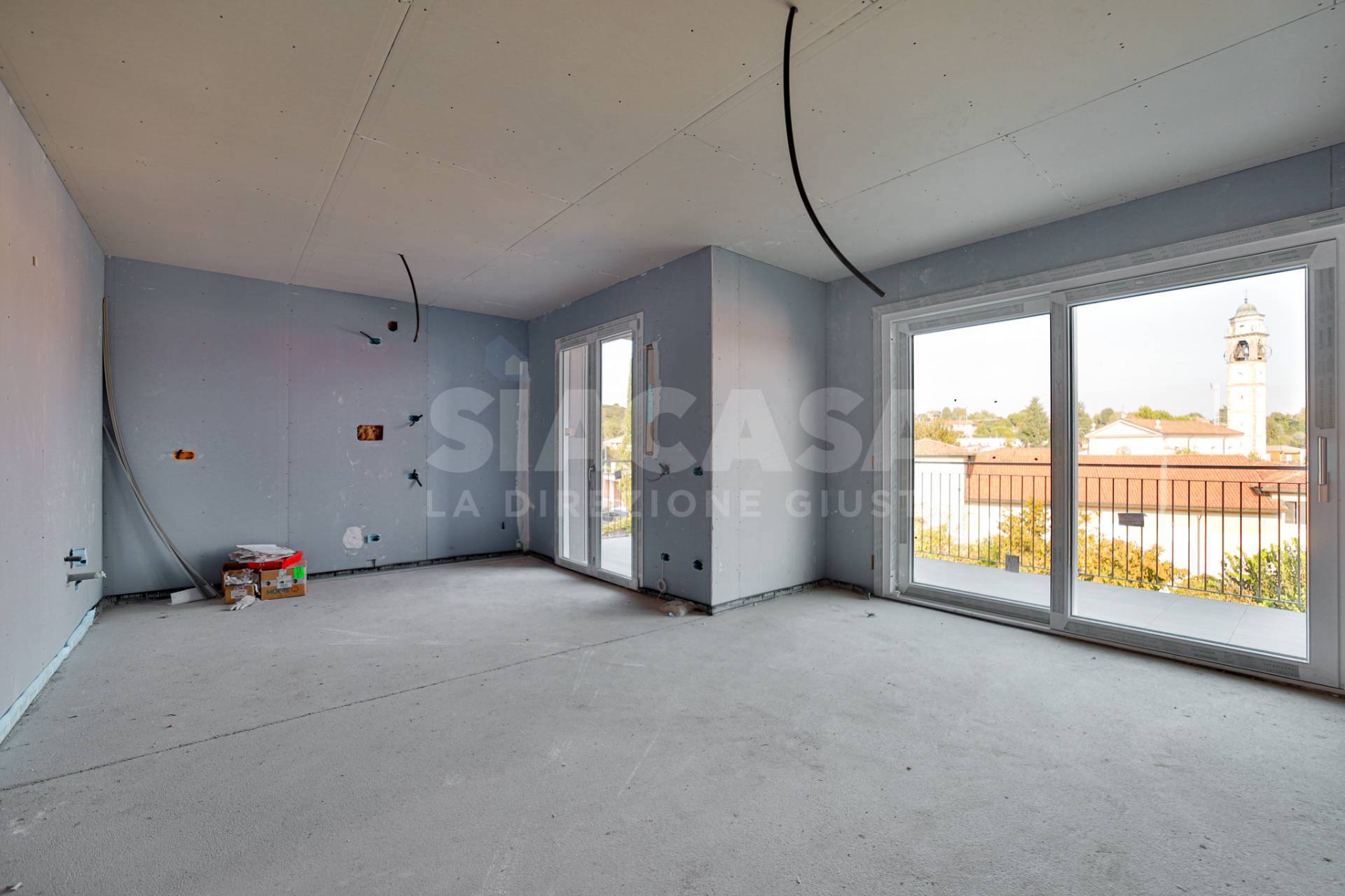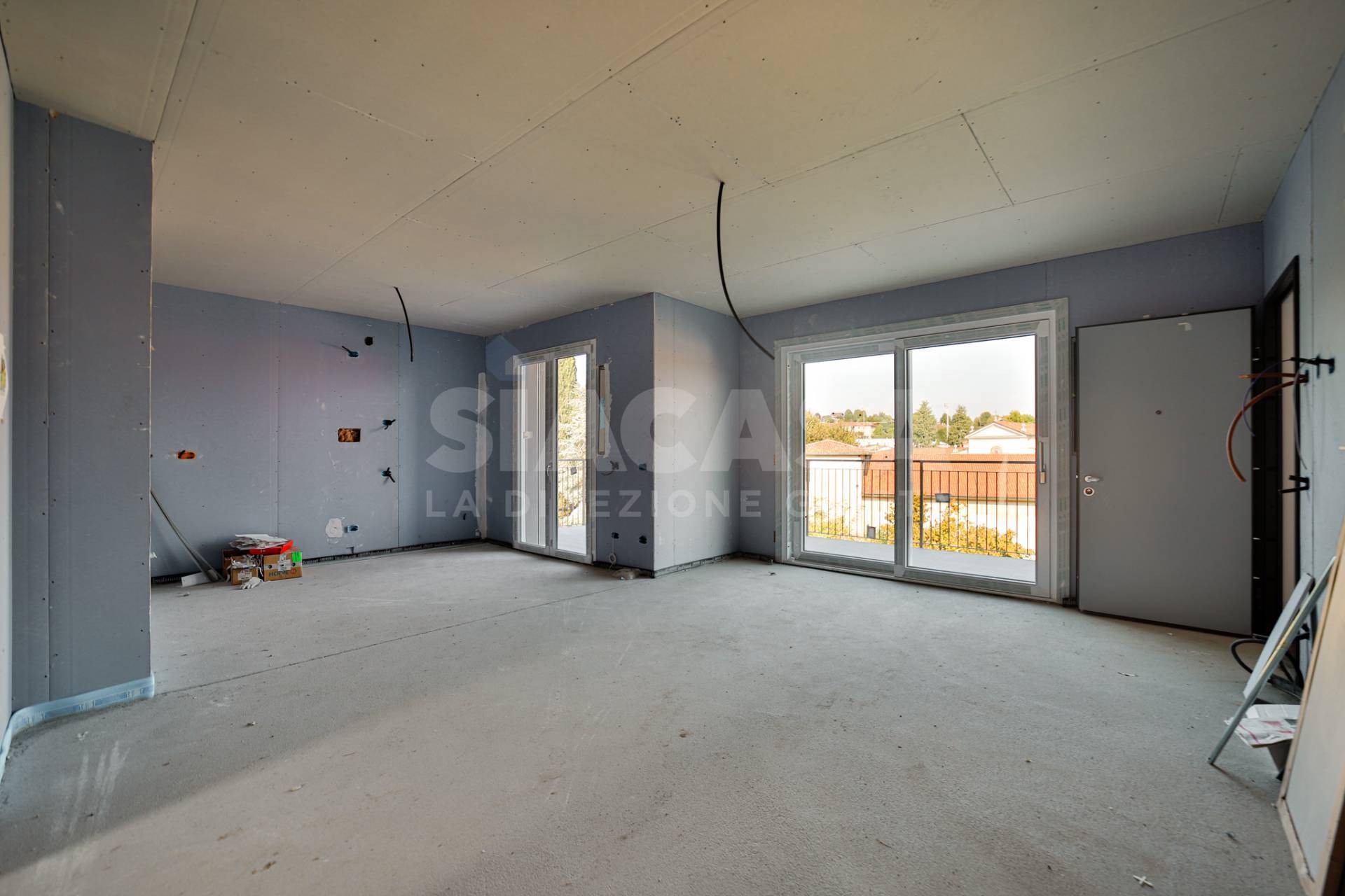 Lingresso apre su un ampio soggiorno con cucina a vista, facilmente separabile per ottenere una cucina abitabile.