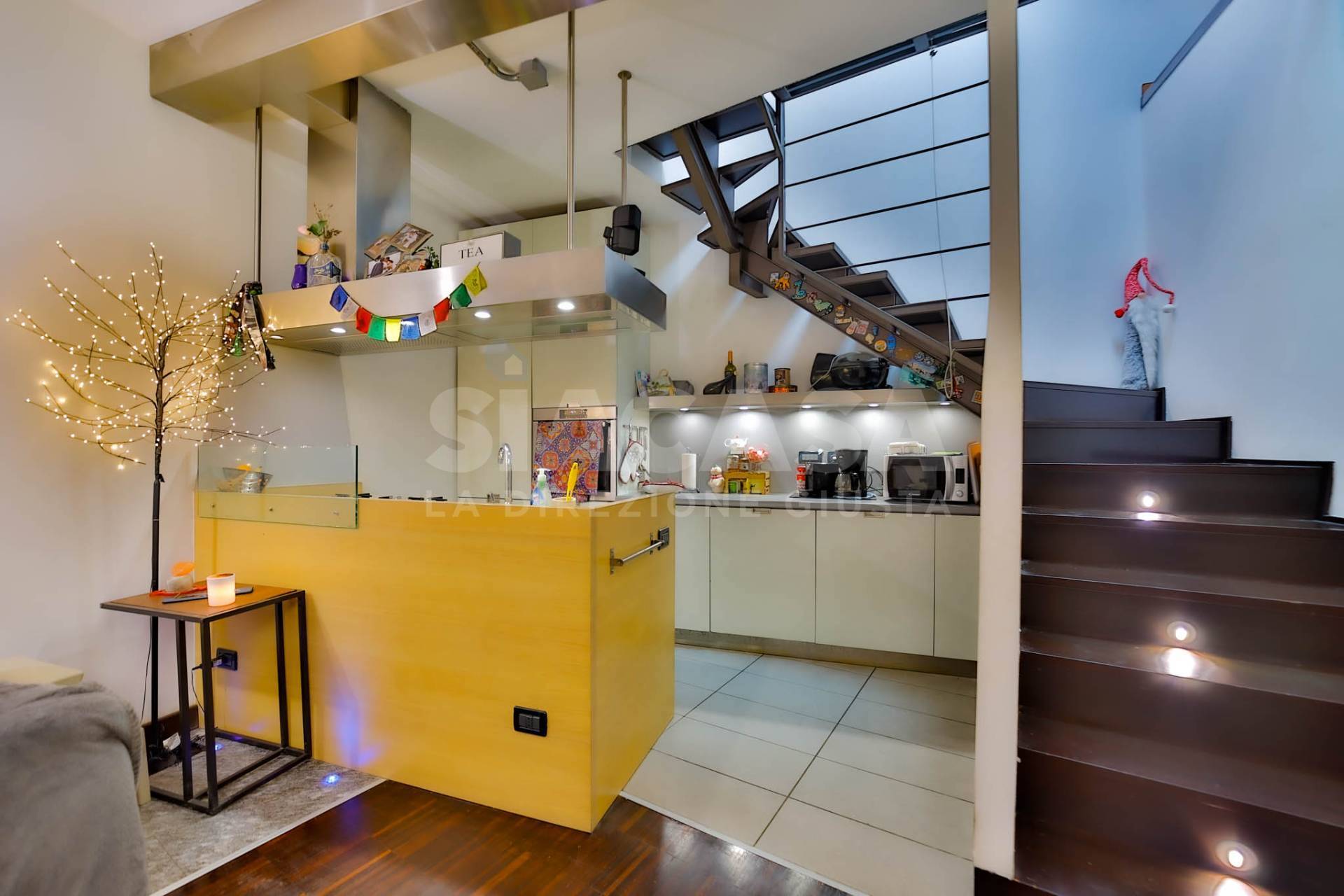 Al piano terra si apre un ampio soggiorno con cucina a vista, uno spazio conviviale e scenografico valorizzato da una scala a vista di design che conduce al piano mansardato e diventa elemento architettonico distintivo della zona giorno.