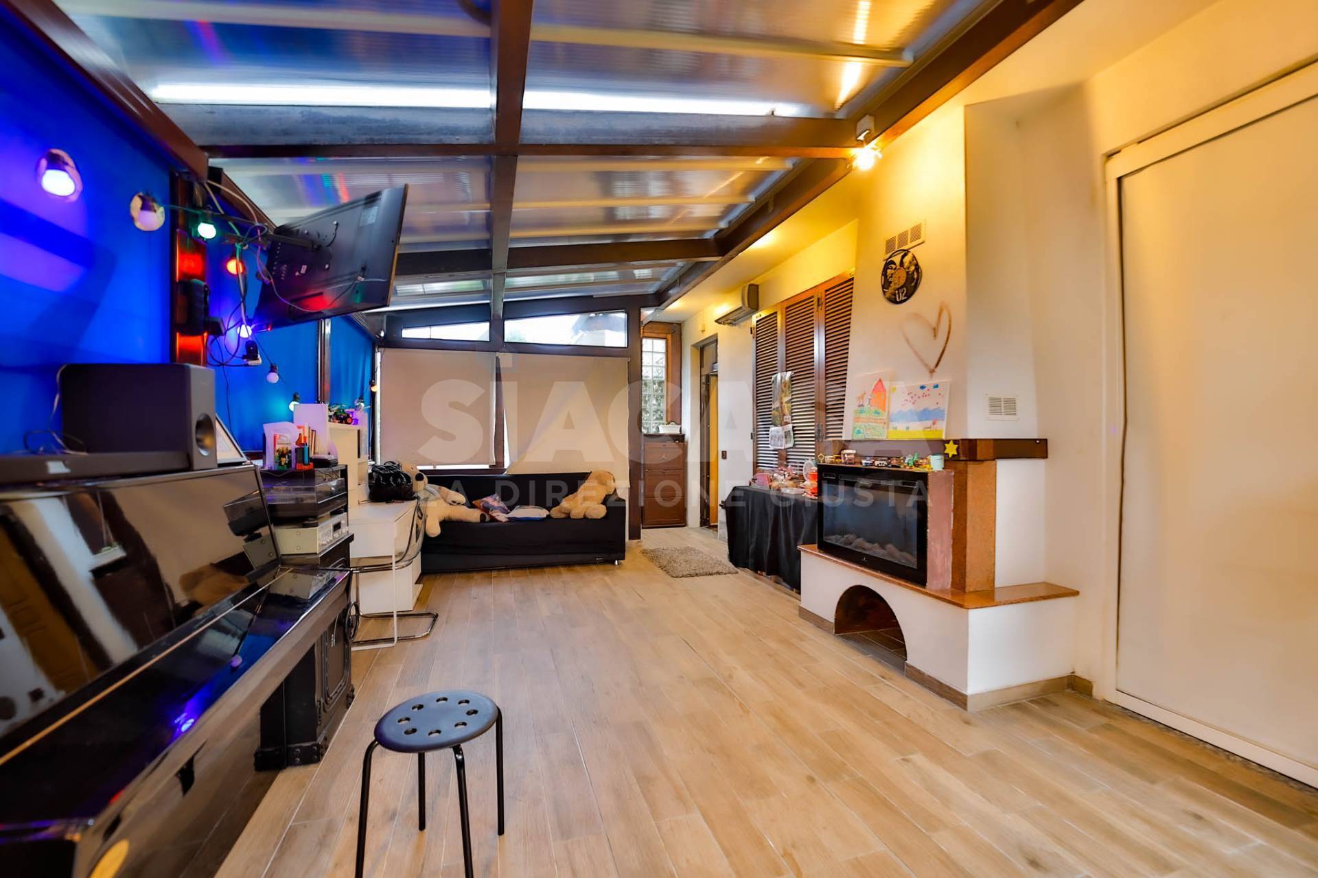 Adiacente alla zona giorno si sviluppa lampio portico coperto di 56 mq, completamente chiuso a veranda: uno spazio straordinariamente versatile, ideale come living aggiuntivo, zona relax o ambiente conviviale da vivere in ogni stagione.