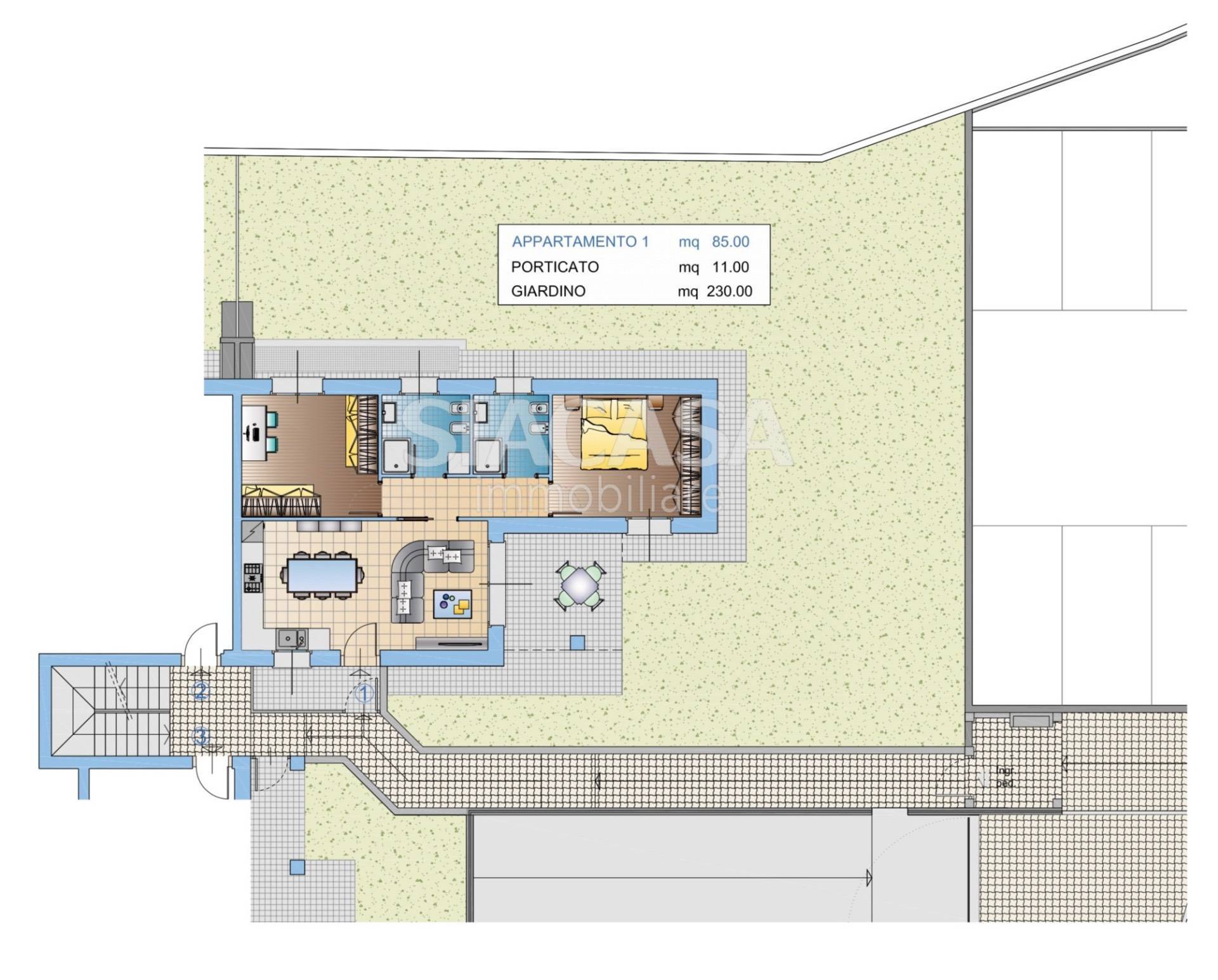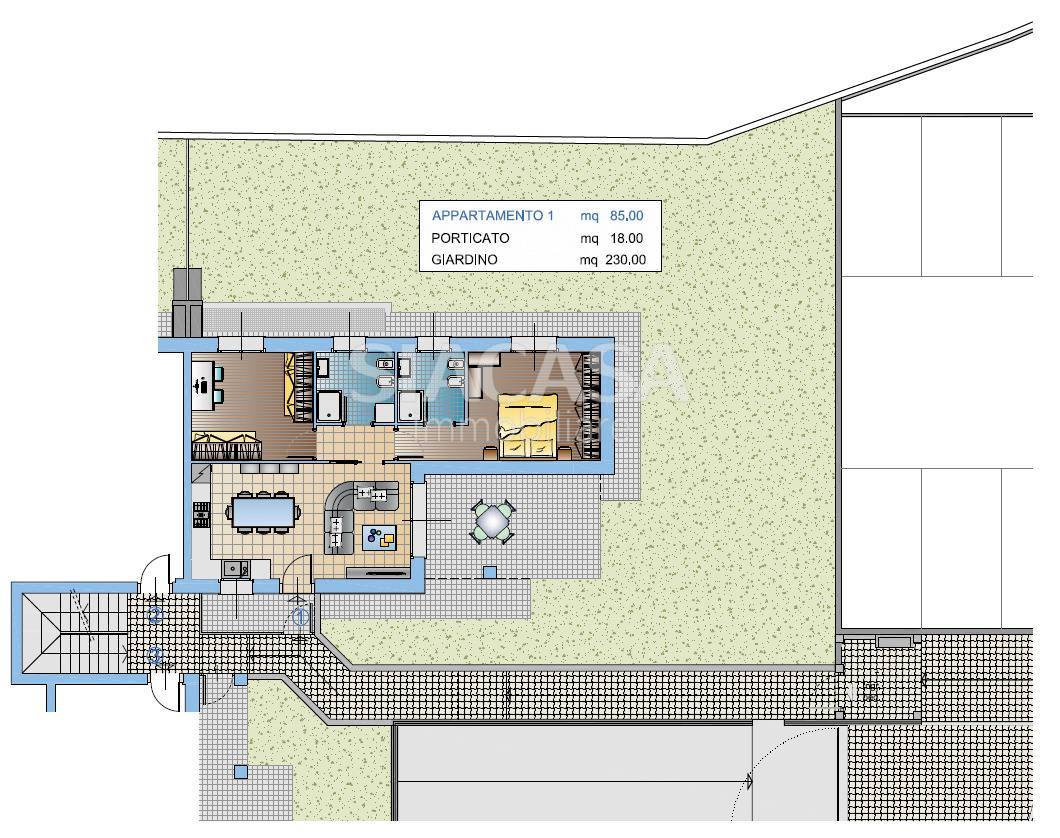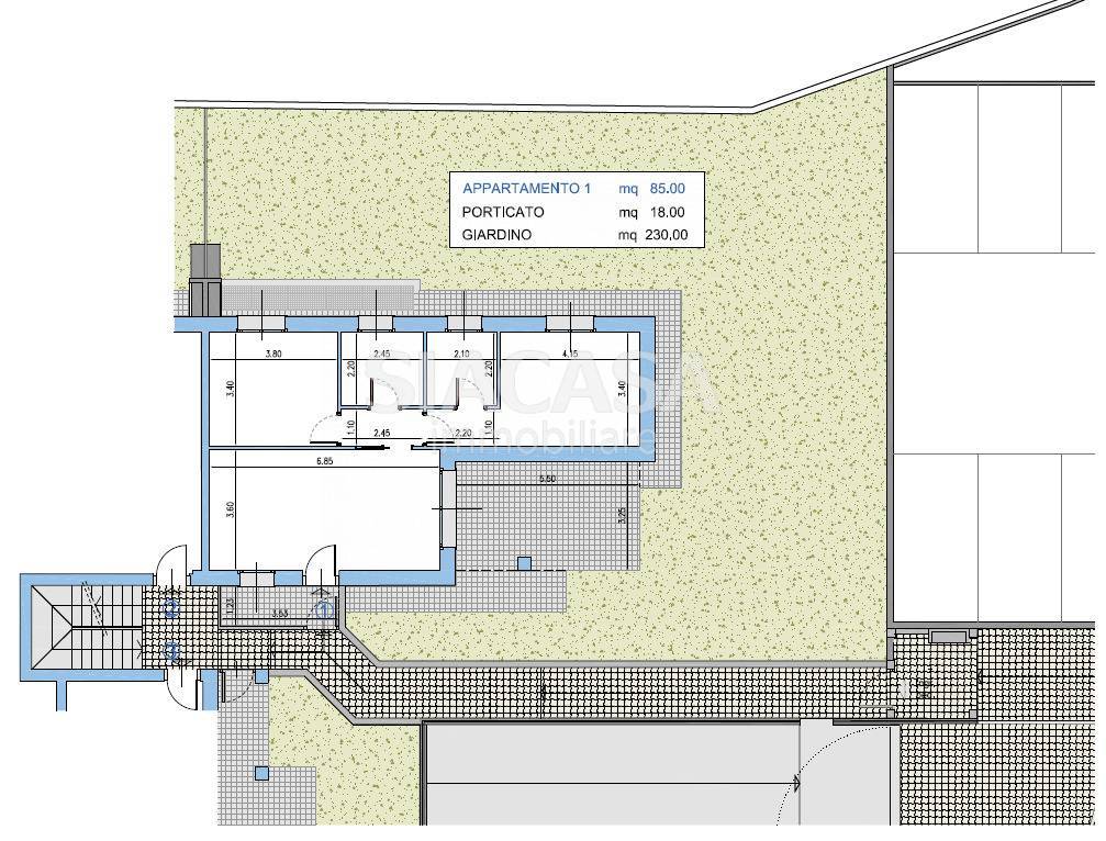 APPARTAMENTO PIANO TERRA 1 RESIDENZA SOLE E LUNA Trilocale con giardino su tre lati 85 mq interni + 230 mq di verde privato L'appartamento si sviluppa su una superficie interna di 85 mq, con una distribuzione funzionale degli spazi e divisioni interne completamente personalizzabili, per adattarsi alle esigenze di chi lo abiter.