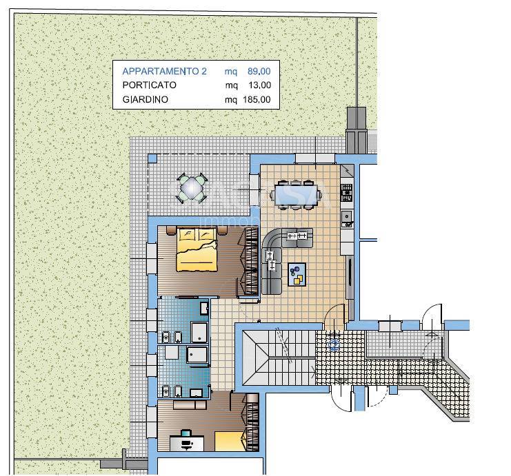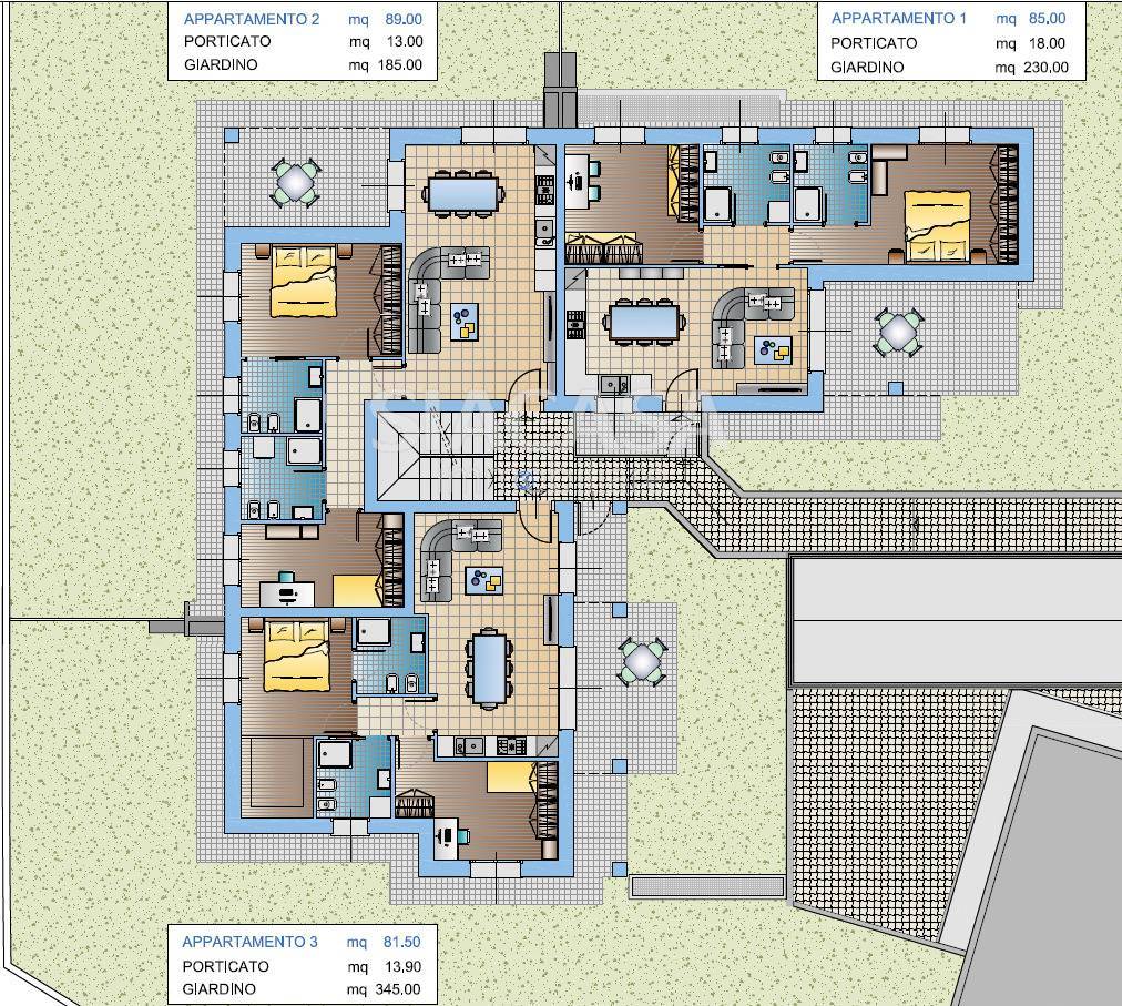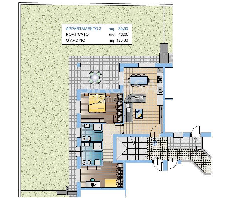 APPARTAMENTO PIANO TERRA 2 RESIDENZA SOLE E LUNA Trilocale con ampio giardino privato 89 mq interni + 185 mq di verde esclusivo Con una superficie interna di 89 mq, lappartamento offre spazi generosi e ottimamente distribuiti, tutti personalizzabili secondo le esigenze dellacquirente, grazie alla possibilit di modificare le divisioni interne.
