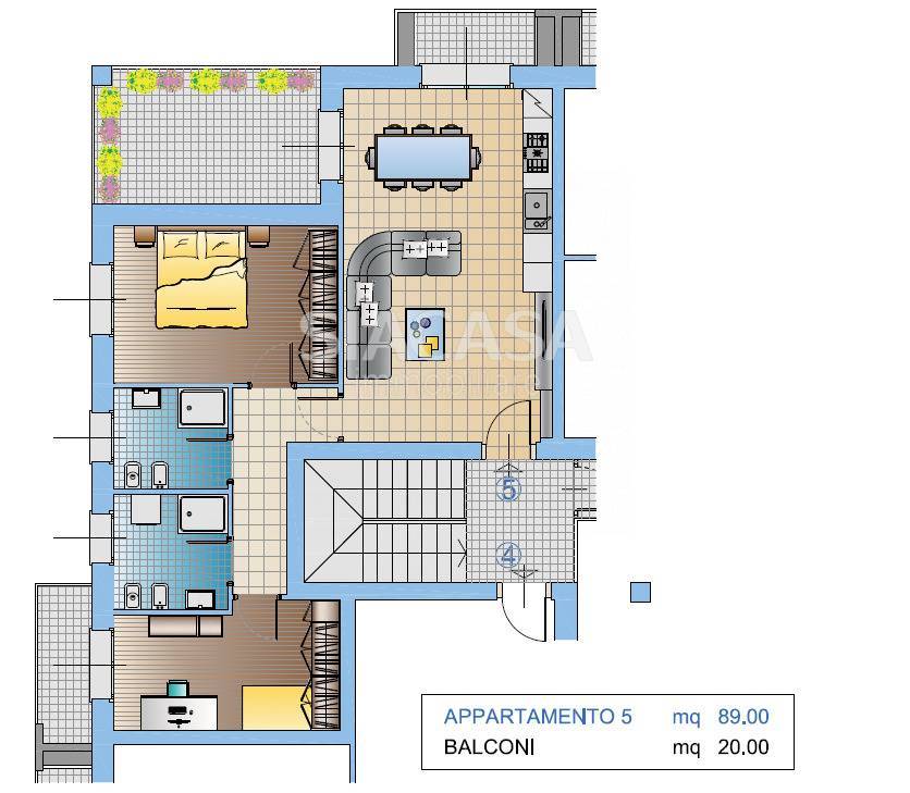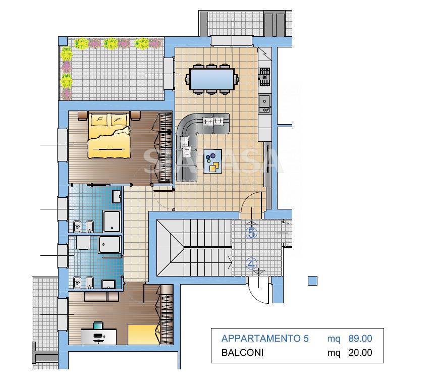 APPARTAMENTO PIANO PRIMO 5 RESIDENZA SOLE E LUNA Trilocale con terrazzo e balcone 89 mq interni + 20 mq di sfoghi esterni Situato al primo e ultimo piano, libero su tre lati, lappartamento si sviluppa su 89 mq interni, con esposizione nord, est e ovest, che assicura una piacevole alternanza di luce durante tutta la giornata e un clima sempre equilibrato in ogni ambiente.