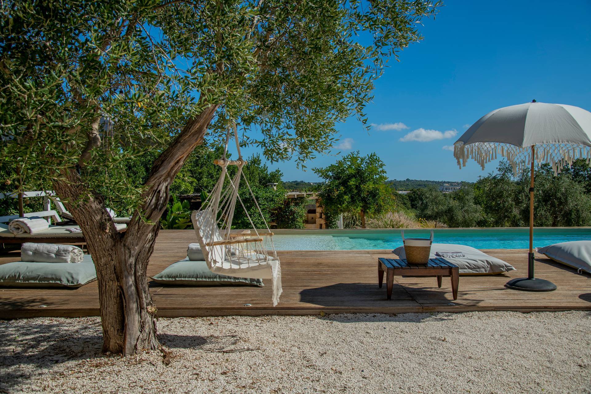 Immerso nella bellissima campagna della Valle D'Itria, proponiamo in vendita,Trullo e casolare in pietra con piscina, scala romana e area solarium con sabbia.
