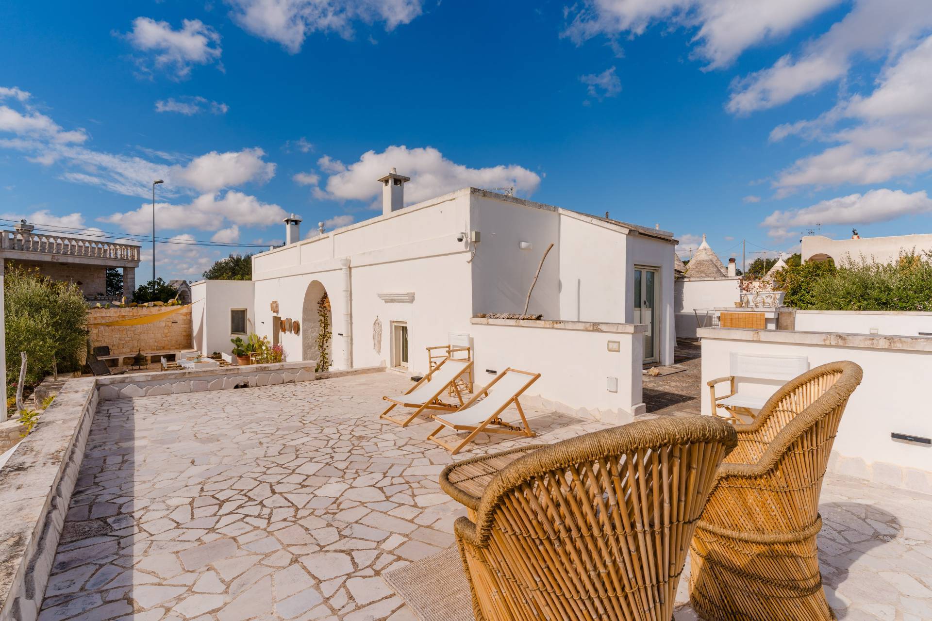 La scelta tecnica ed estetica, per valorizzare questi antichissimi trulli, stata quella di utilizzare solo materiali naturali, come la pietra, la calce, rendendo gli ambienti molto accoglienti e di grande suggestione! L'esterno, caratterizzato da ampi spazi ombreggiati, gode di viste panoramiche impareggiabili sulla Valle D'Itria.