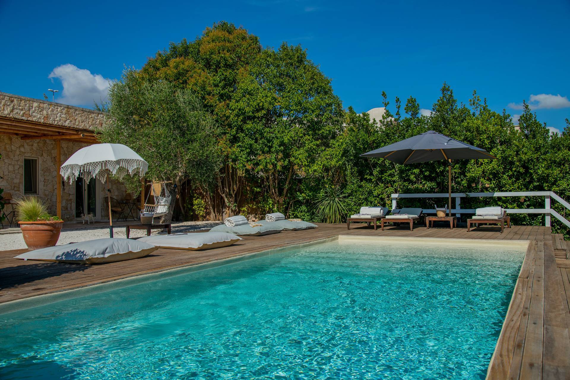 Dal corridoio si accede alla zona notte composta da due camere matrimoniali con accesso autonomo sulla piscina, una terza camera da letto e un comodo bagno.