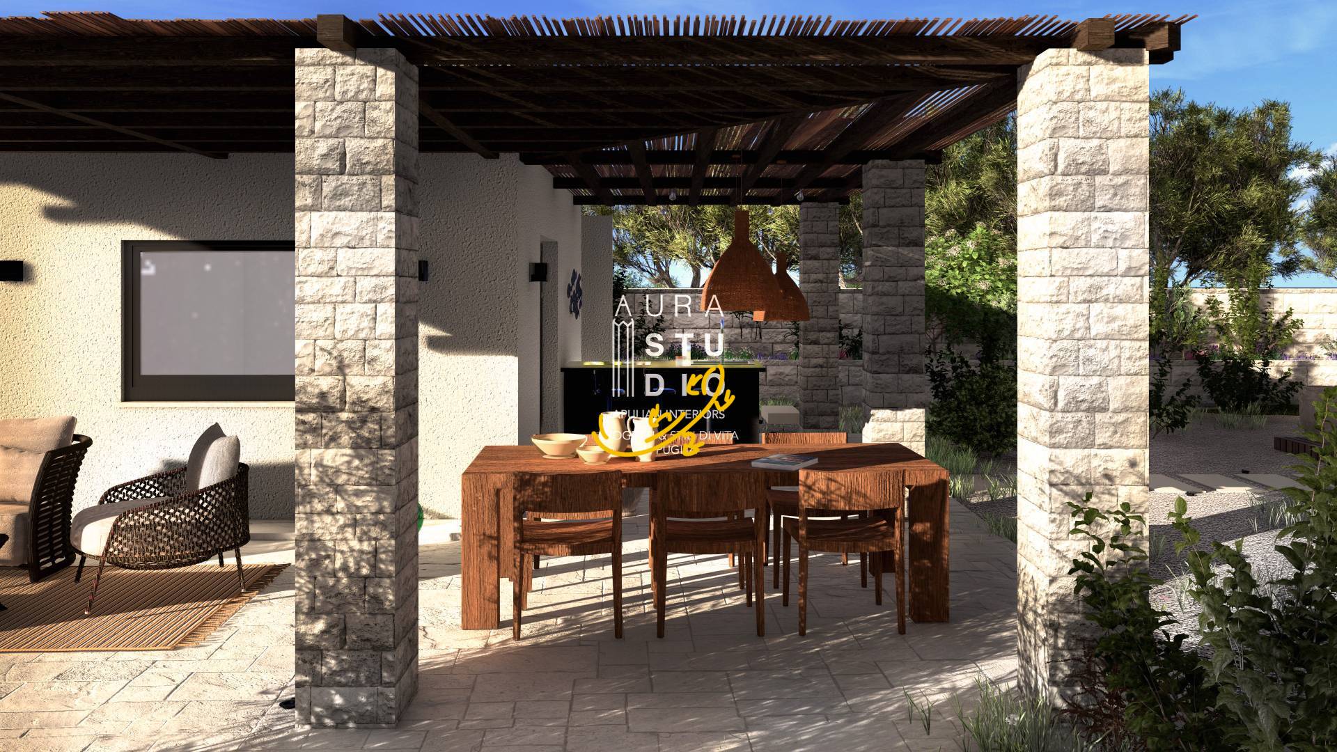 Questo spazio all'aperto includer una cucina esterna, un grande tavolo e una zona relax.