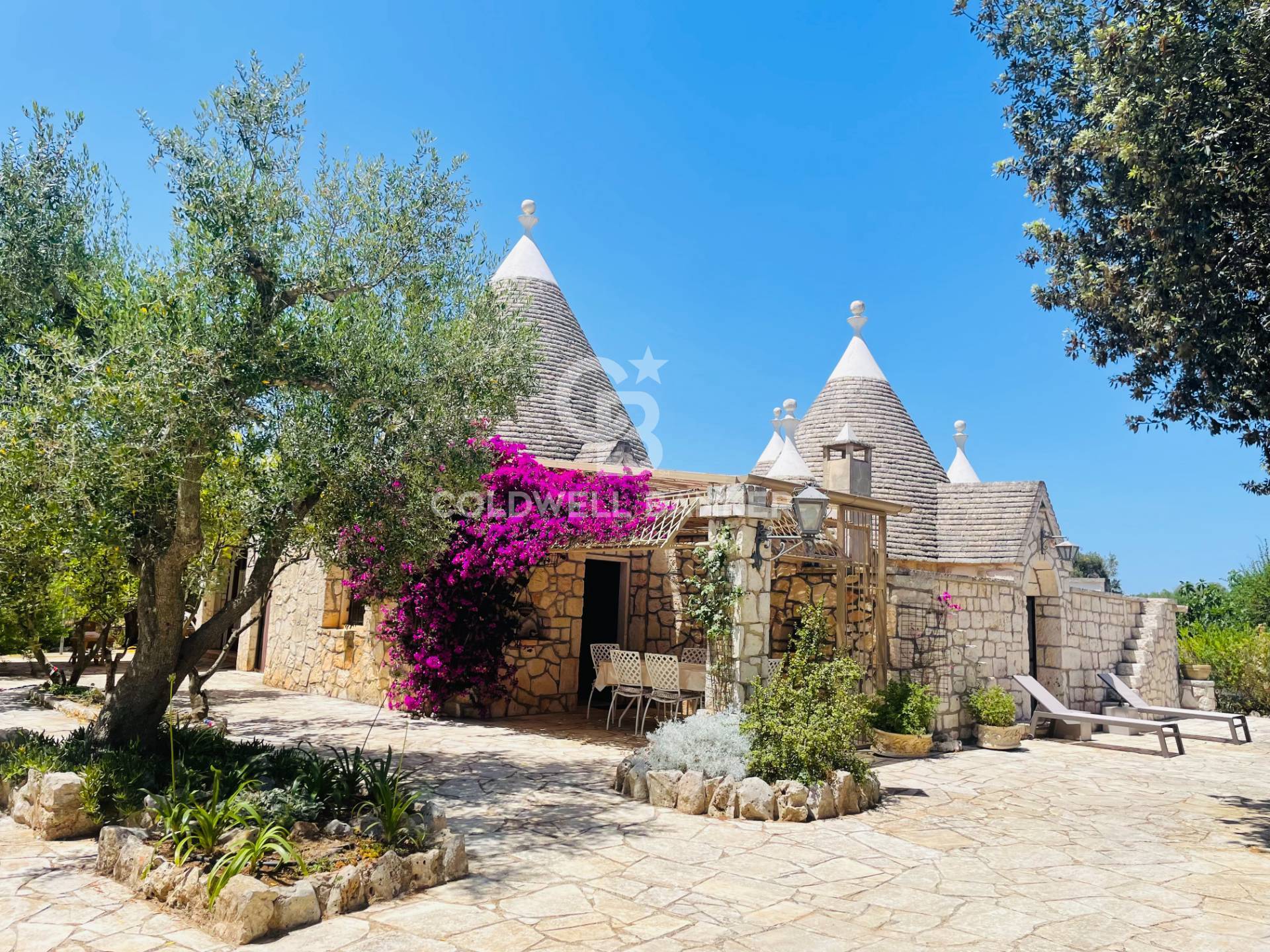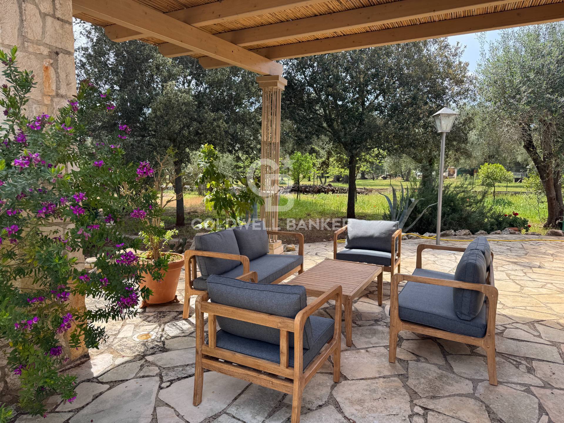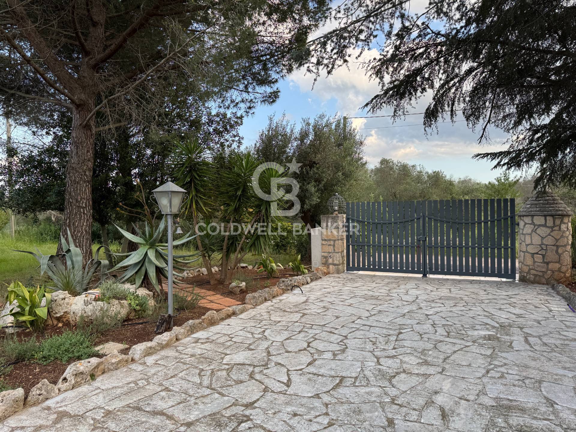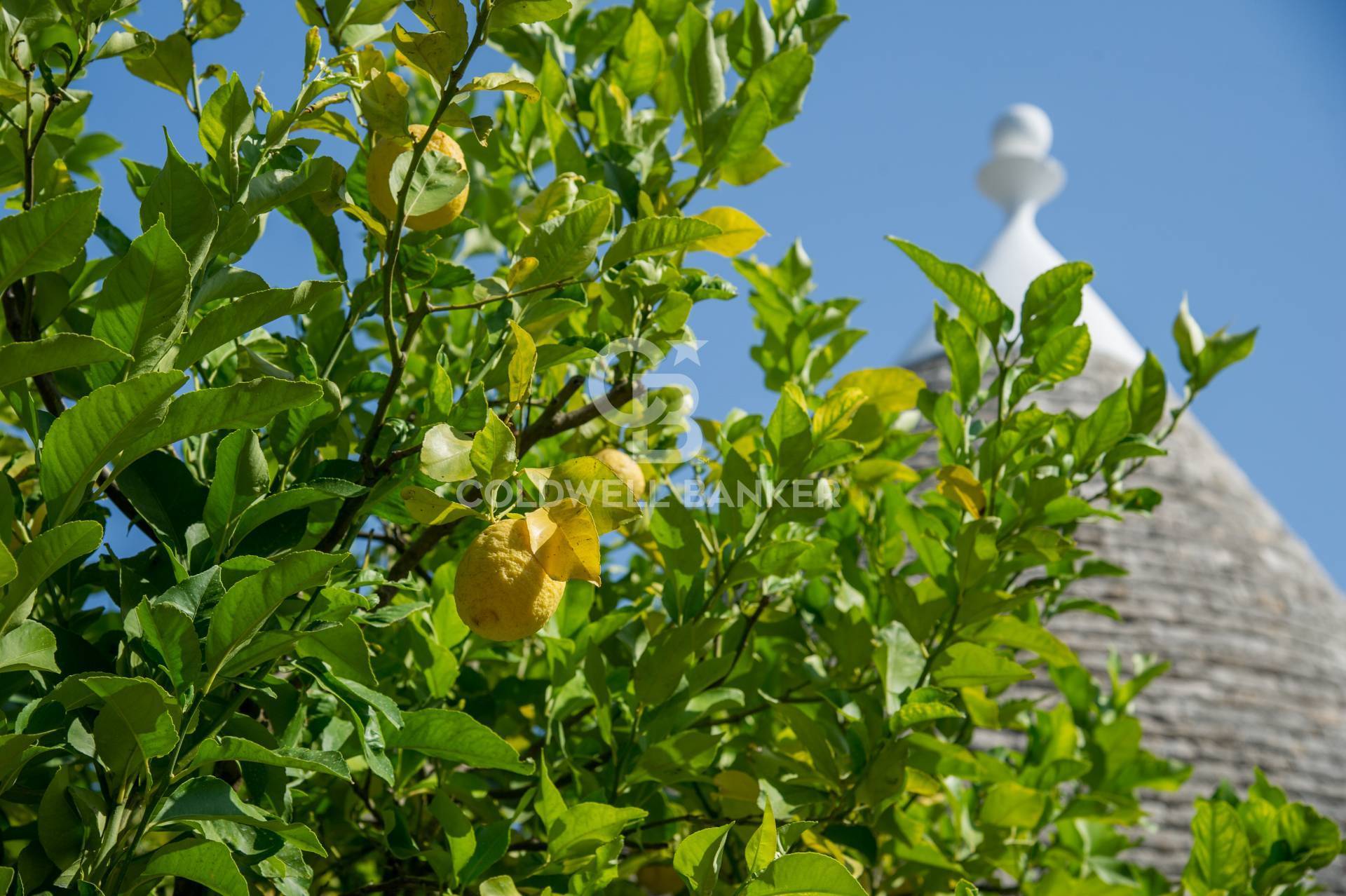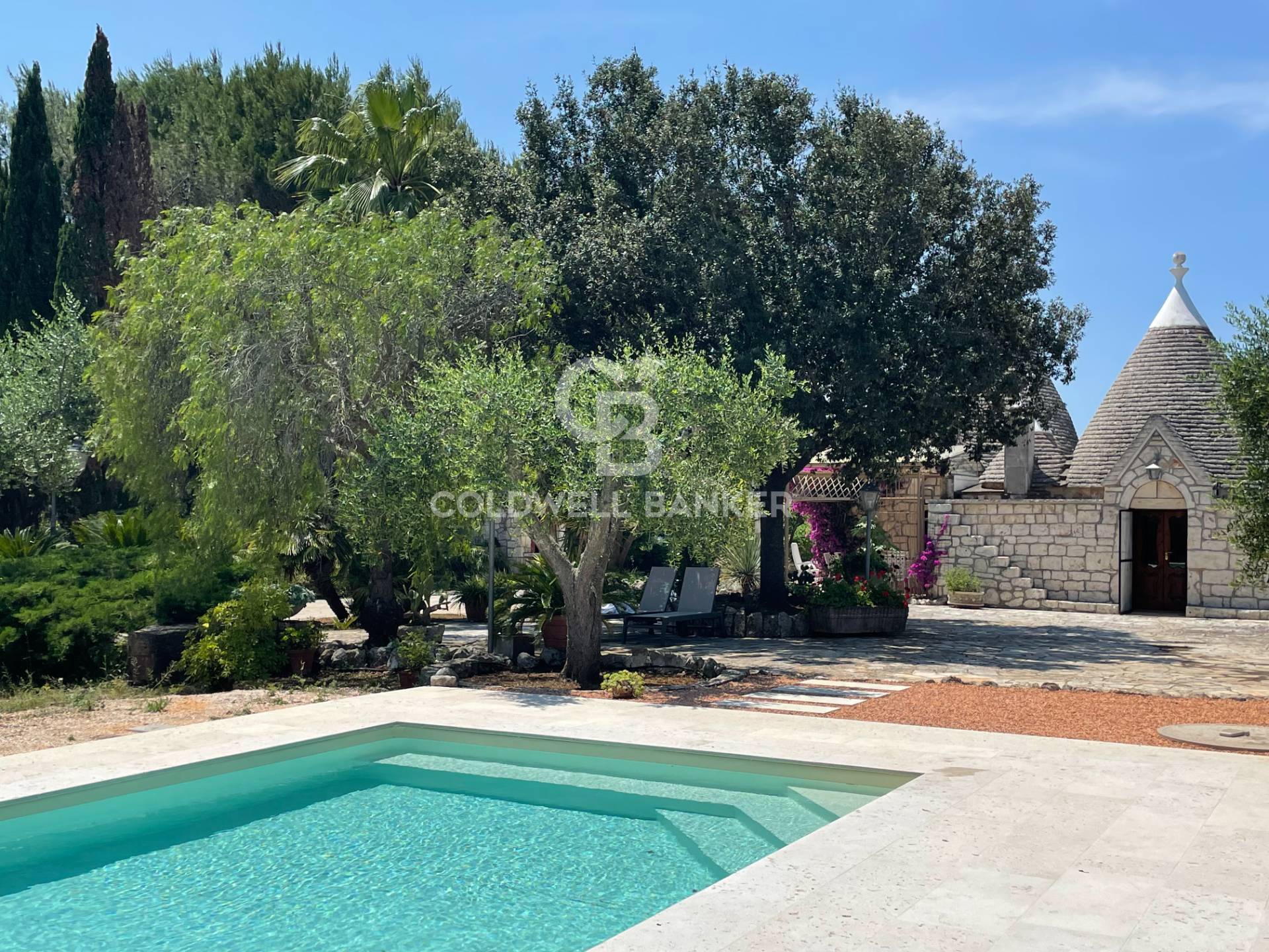 Il trullo, assieme a fresche pergole, suggestivi piazzali in pietra e angoli incorniciati da siepi e piante fiorite, si erge in mezzo a un giardino lussureggiante dove primeggiano 40 olivi produttivi di 50 anni, molti dei quali attorniano la bellissima piscina e rappresenta un vero e proprio mosaico di piante e fiori scelti con cura per creare un'oasi di pace e relax unica e suggestiva; Insomma un vero e proprio paradiso mediterraneo dove spiccano lecci, sughero, carrubi, mirto, melograno, querce, corbezzolo, profumati limoni e una rigenerante e fresca pineta oltre a piante grasse che aggiungono un tocco di rusticit e originalit.