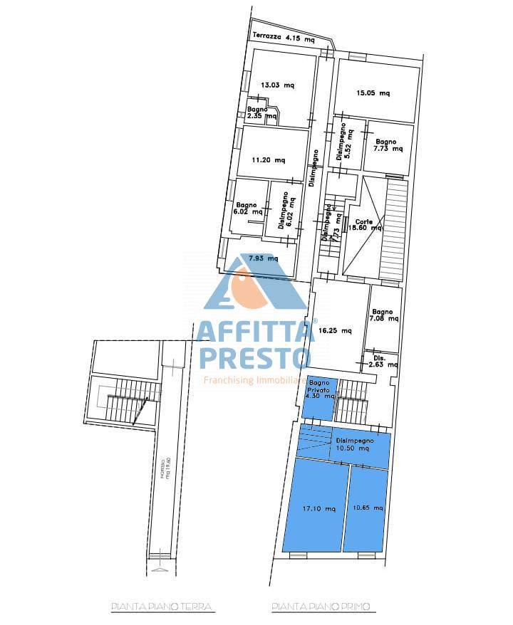 Si accede all'ufficio al primo piano tramite scala interna ed e' composto da : disimpegno, n.2 stanze con bagno.