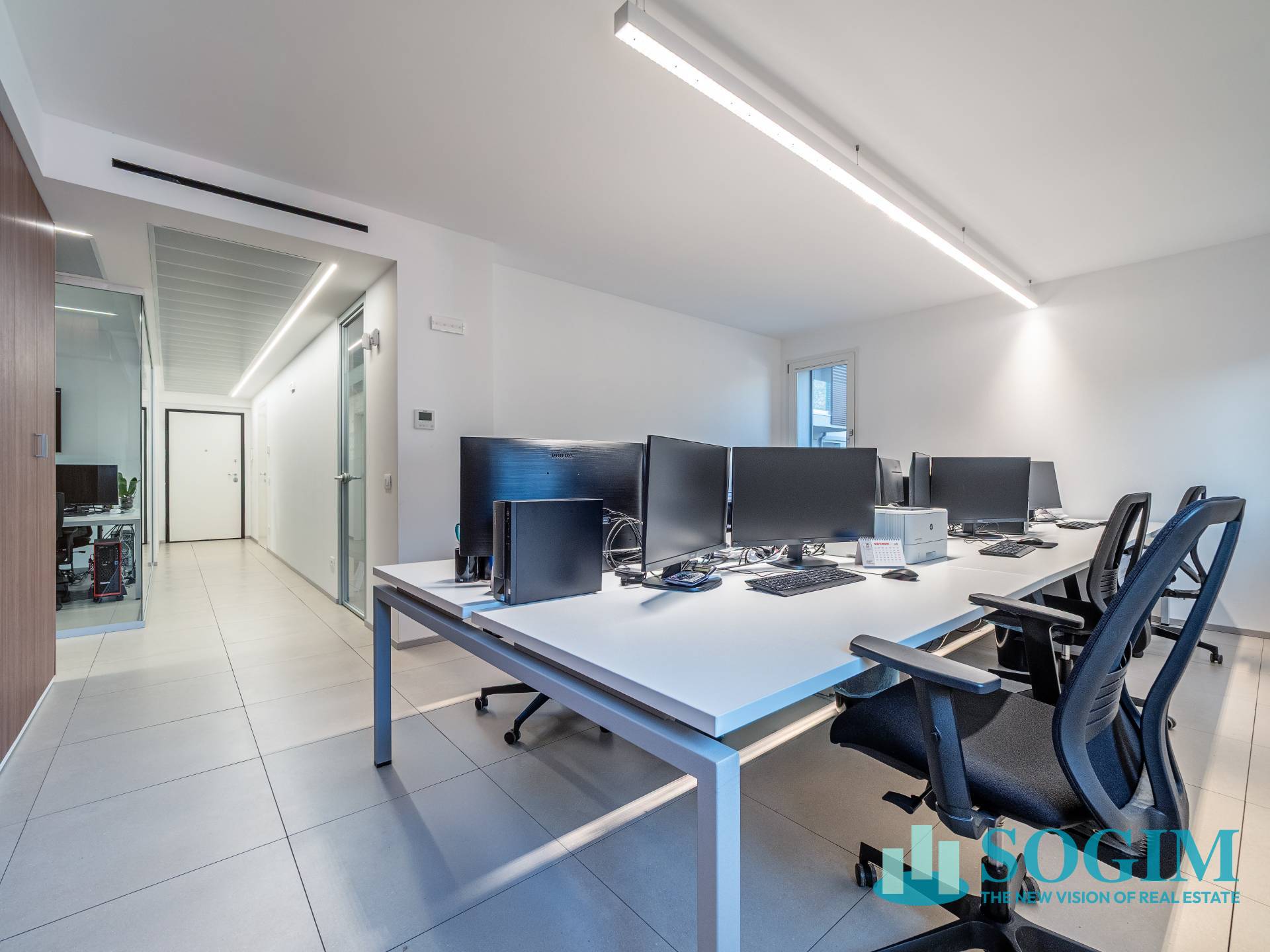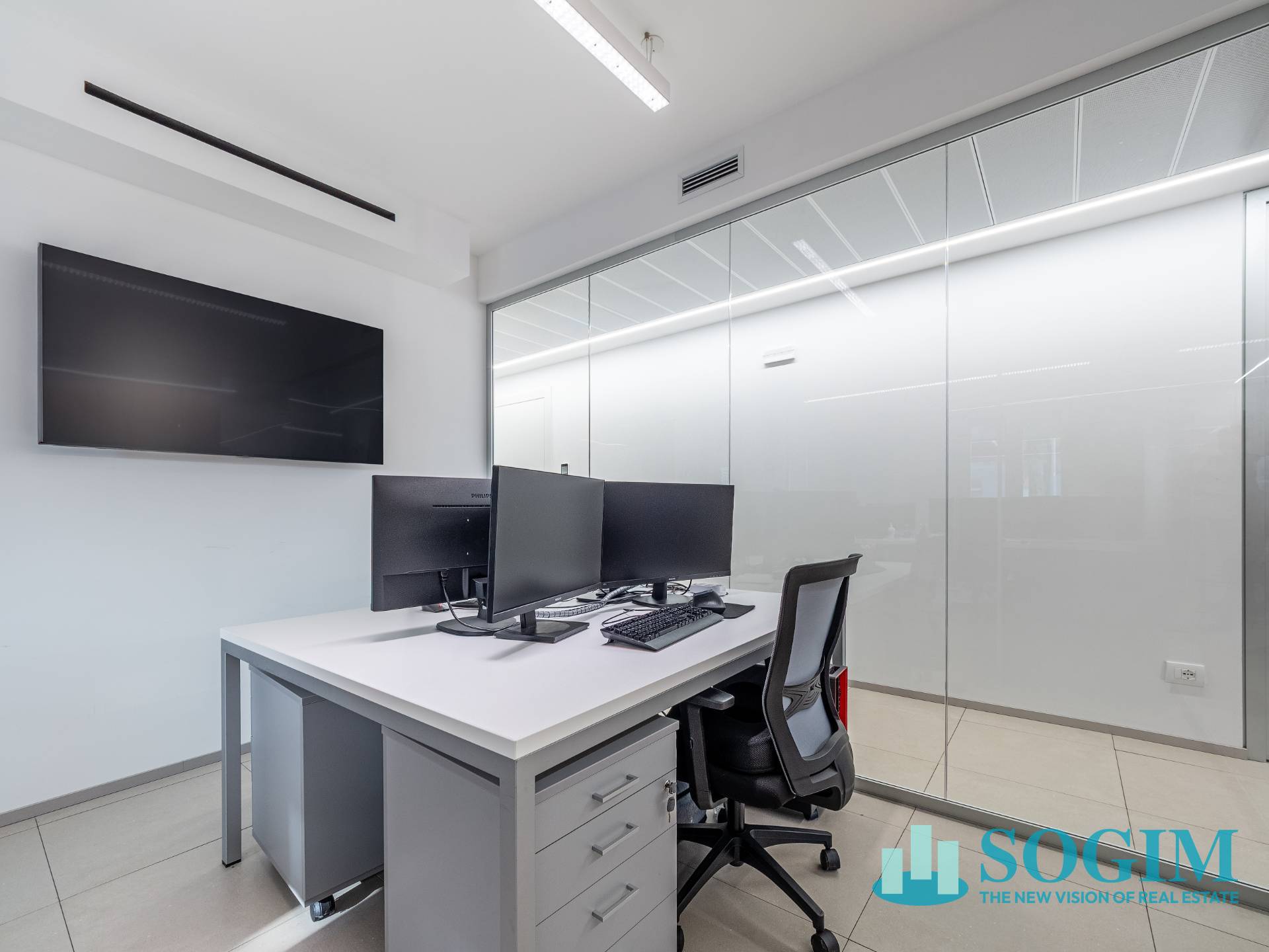 Superato l'ingresso sono presenti 3 sale ufficio, un'altra sala riunioni, un comodo ripostiglio, 3 servizi e una funzionale cucina/zona snack.