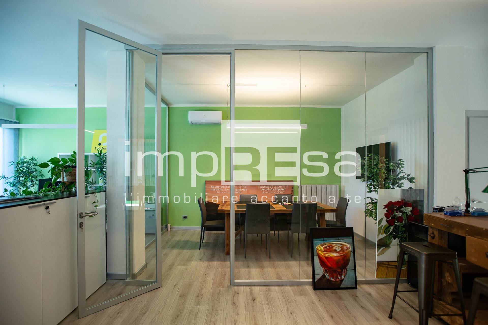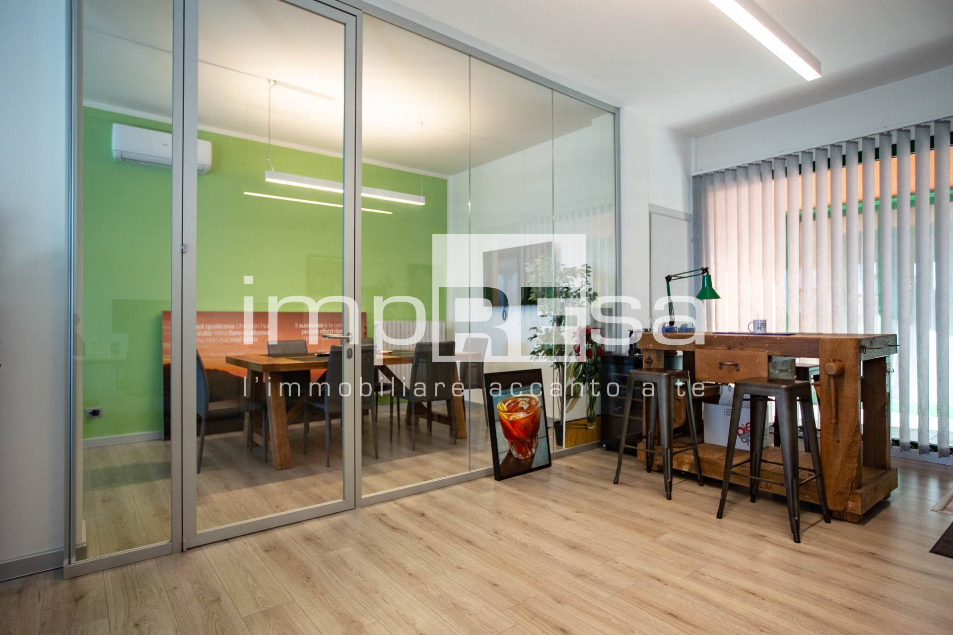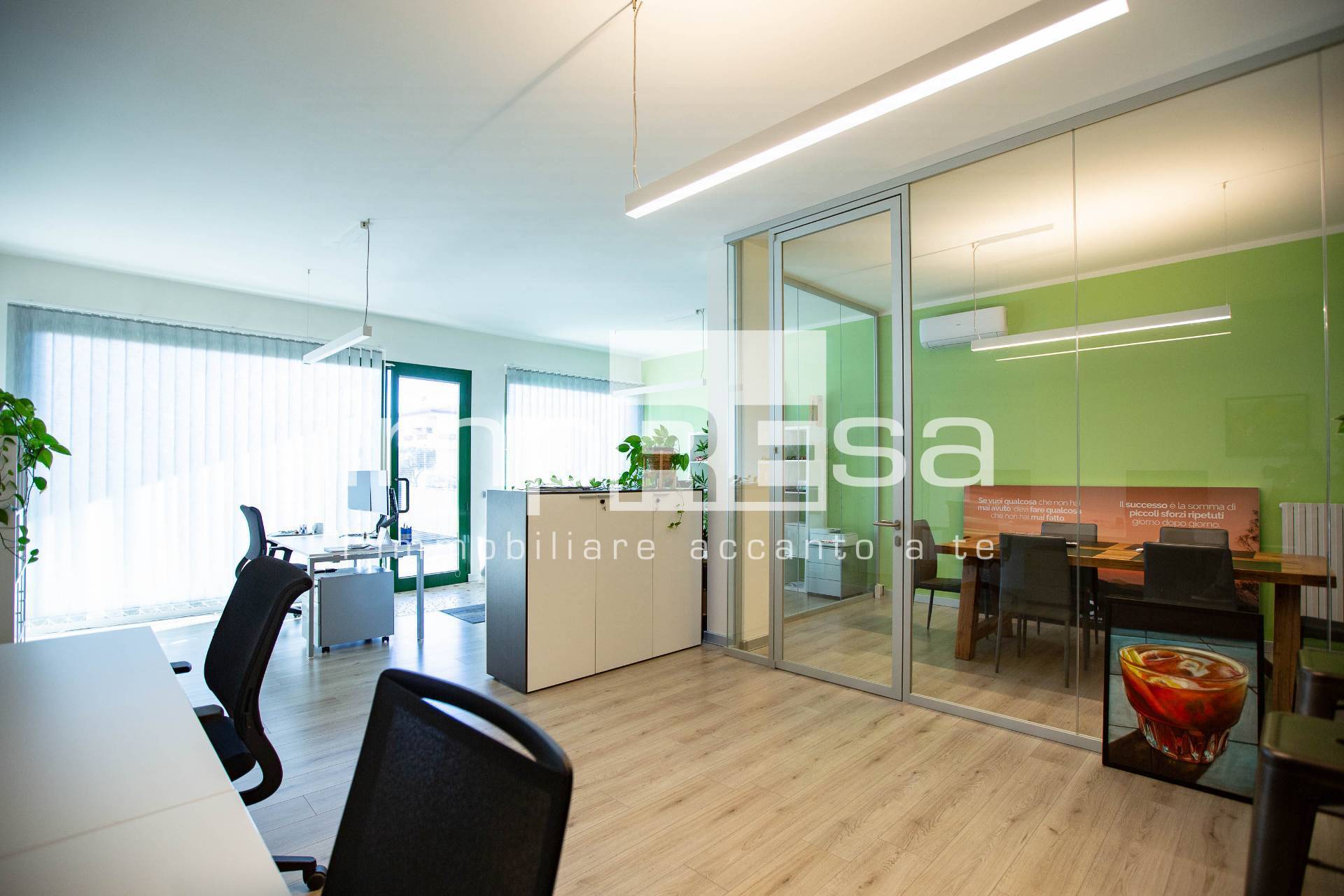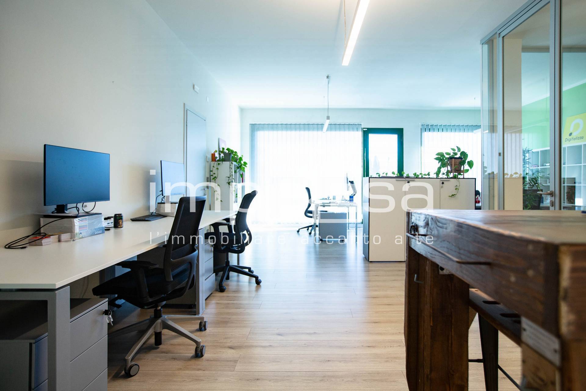 L'ufficio si presenta con un ampio open space dove sono disposte le varie postazioni lavorative, una sala riunioni con vetrine moderne ed eleganti ed un bagno accessoriato di circa 6 mq. A completare, l'immobile dispone di un magazzino di circa 50 mq utile per poter riporre attrezzi o materiali in modo ordinato e organizzato.