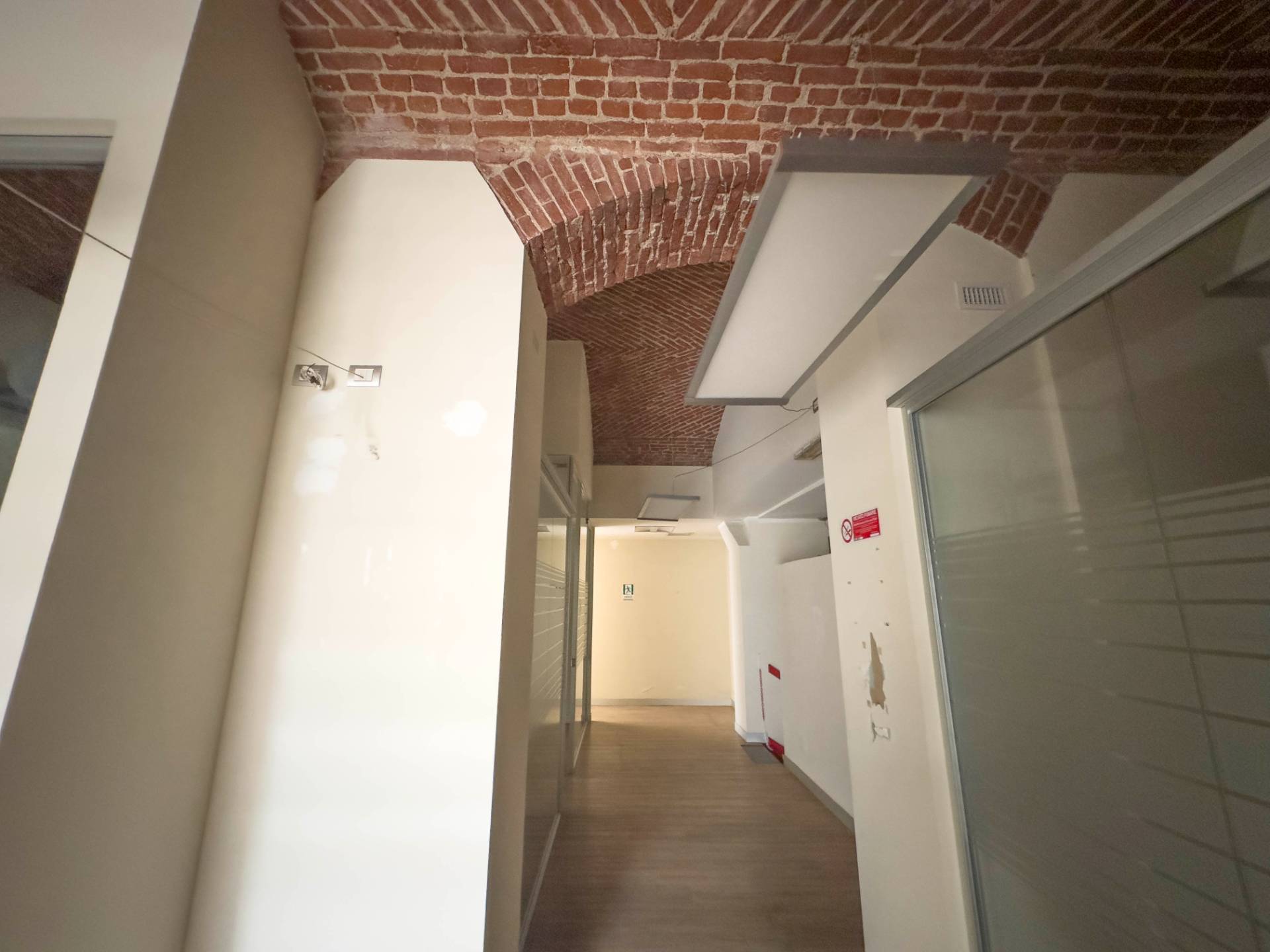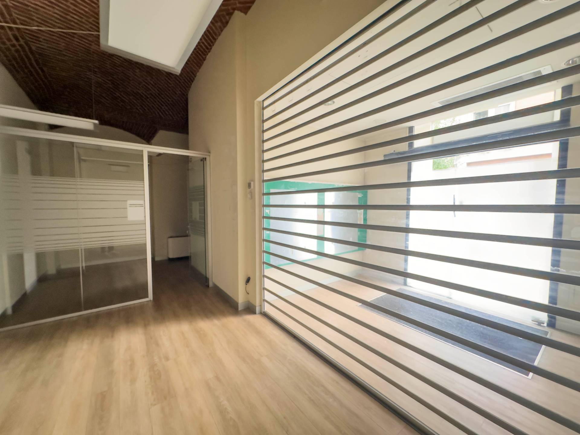 Al piano terreno circa 100 mq con 5 vetrine con stanze divise da pareti vetrate e un bagno.