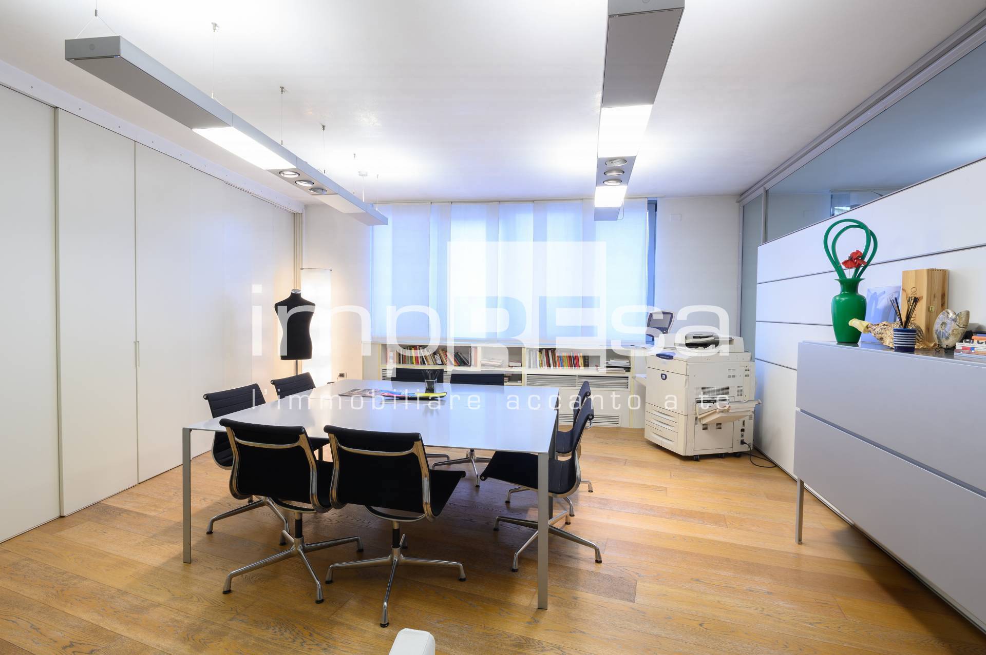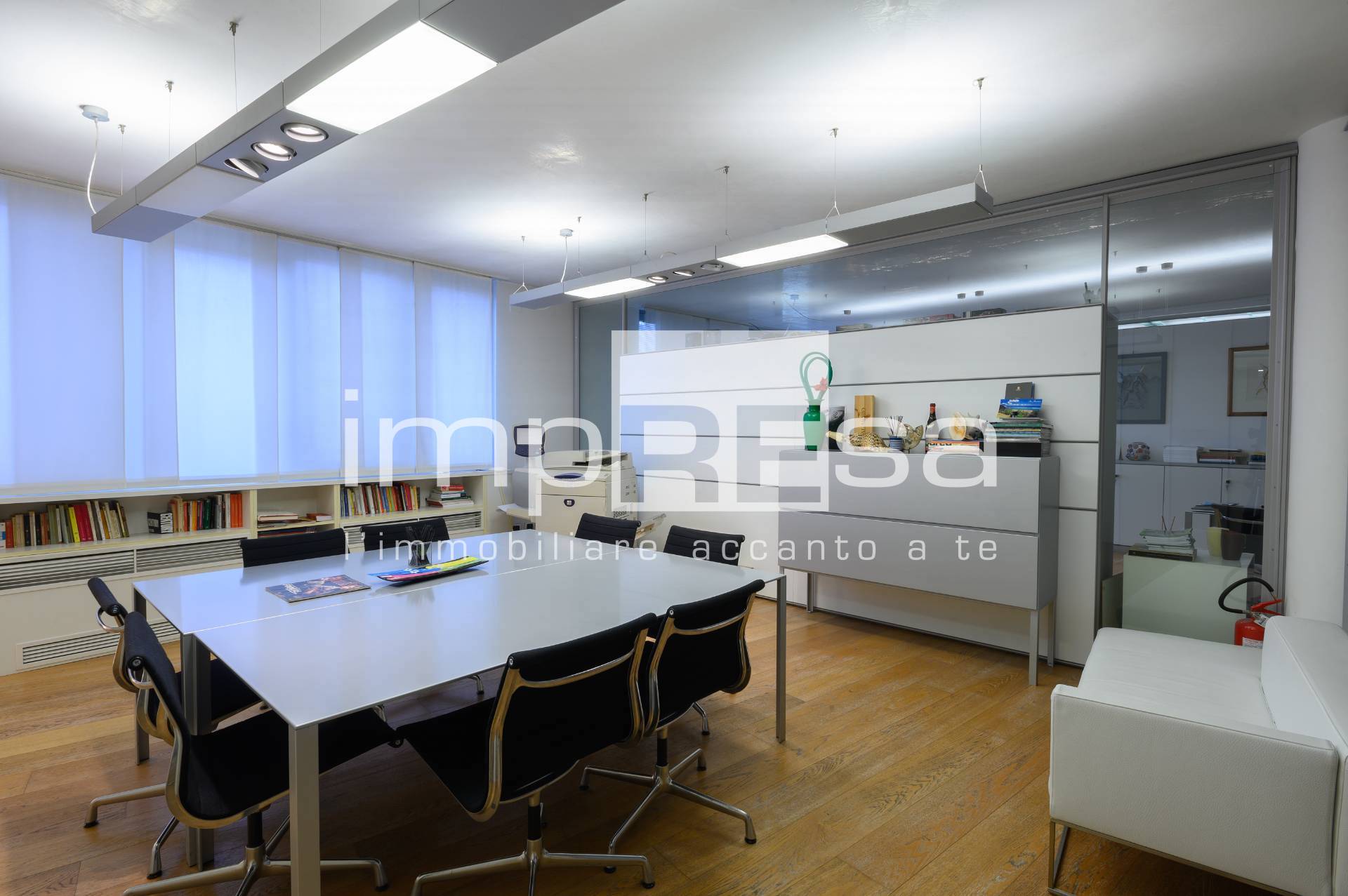 Gli spazi interni sono attualmente divisi in pi zone di lavoro con pareti amovibili; Dispone di un garage di oltre 30 mq al piano interrato.
