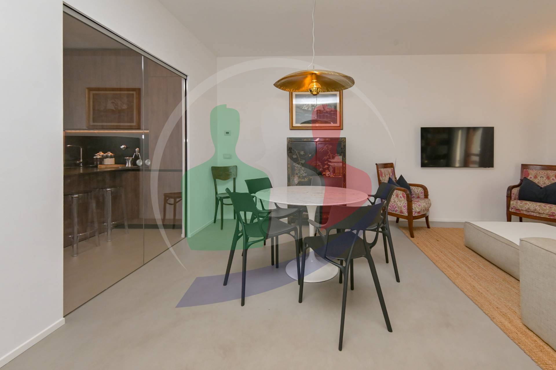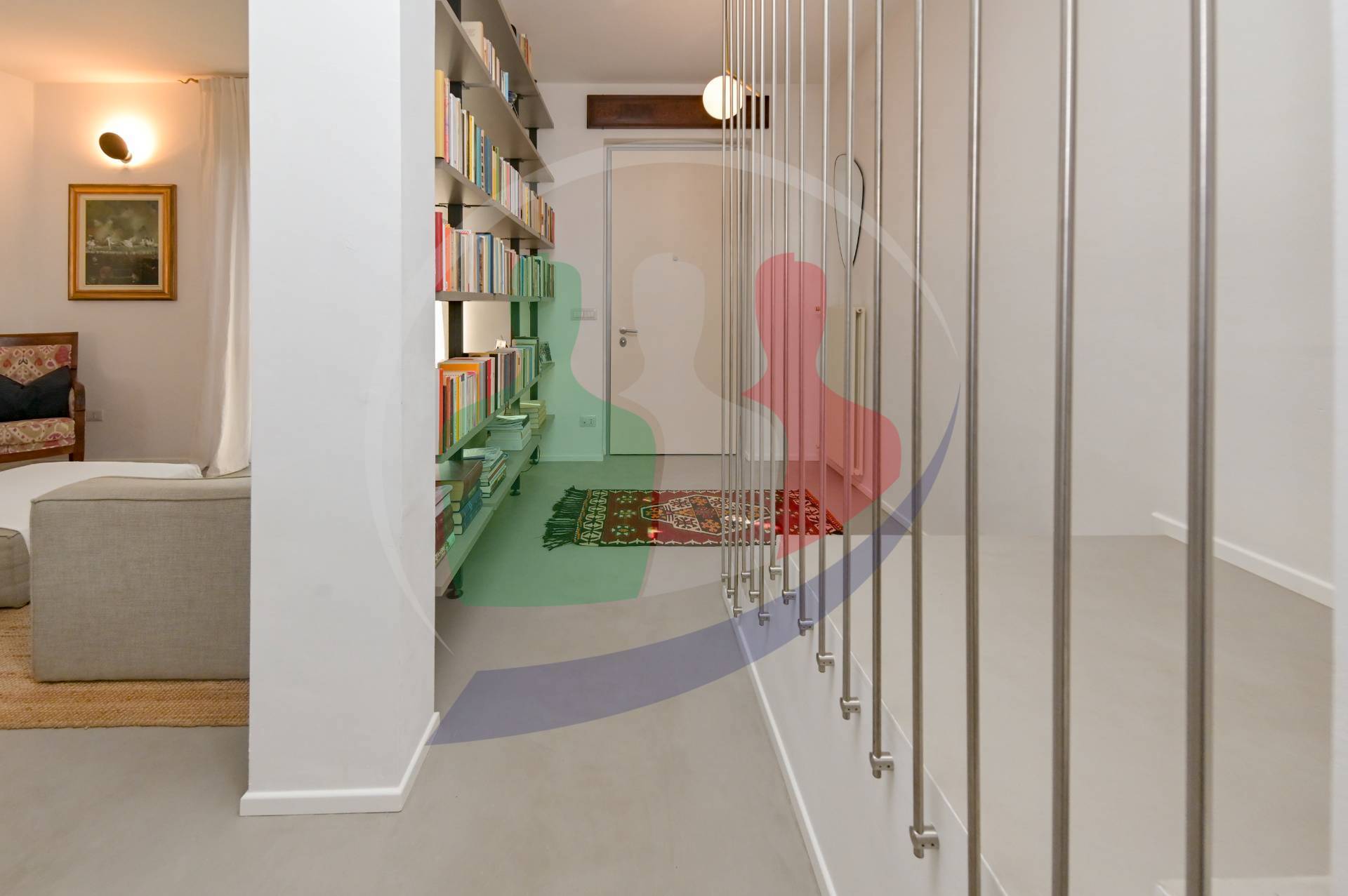 Descrizione: Siamo accolti da un ingresso che ci lascia intravedere, attraverso una libreria, il salotto e la zona conviviale dedicata al pranzo.