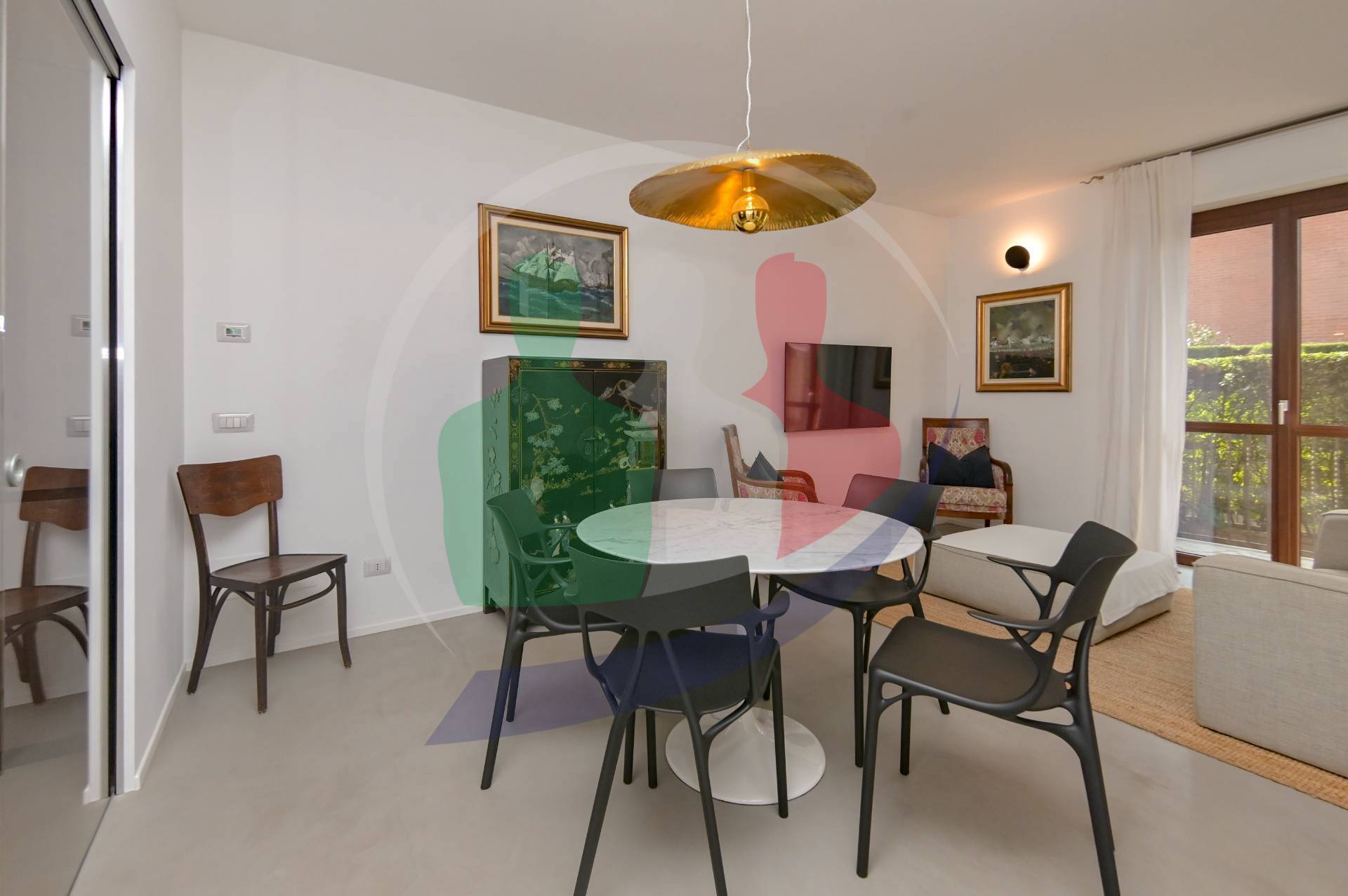 Due porte scorrevoli in cristallo dividono la sala da pranzo dalla cucina abitabile con accesso sul terrazzo ampio e confortevole grande circa 15 mq dove posizionare un tavolo per colazioni e pranzi piacevoli, protetto da una tenda parasole.