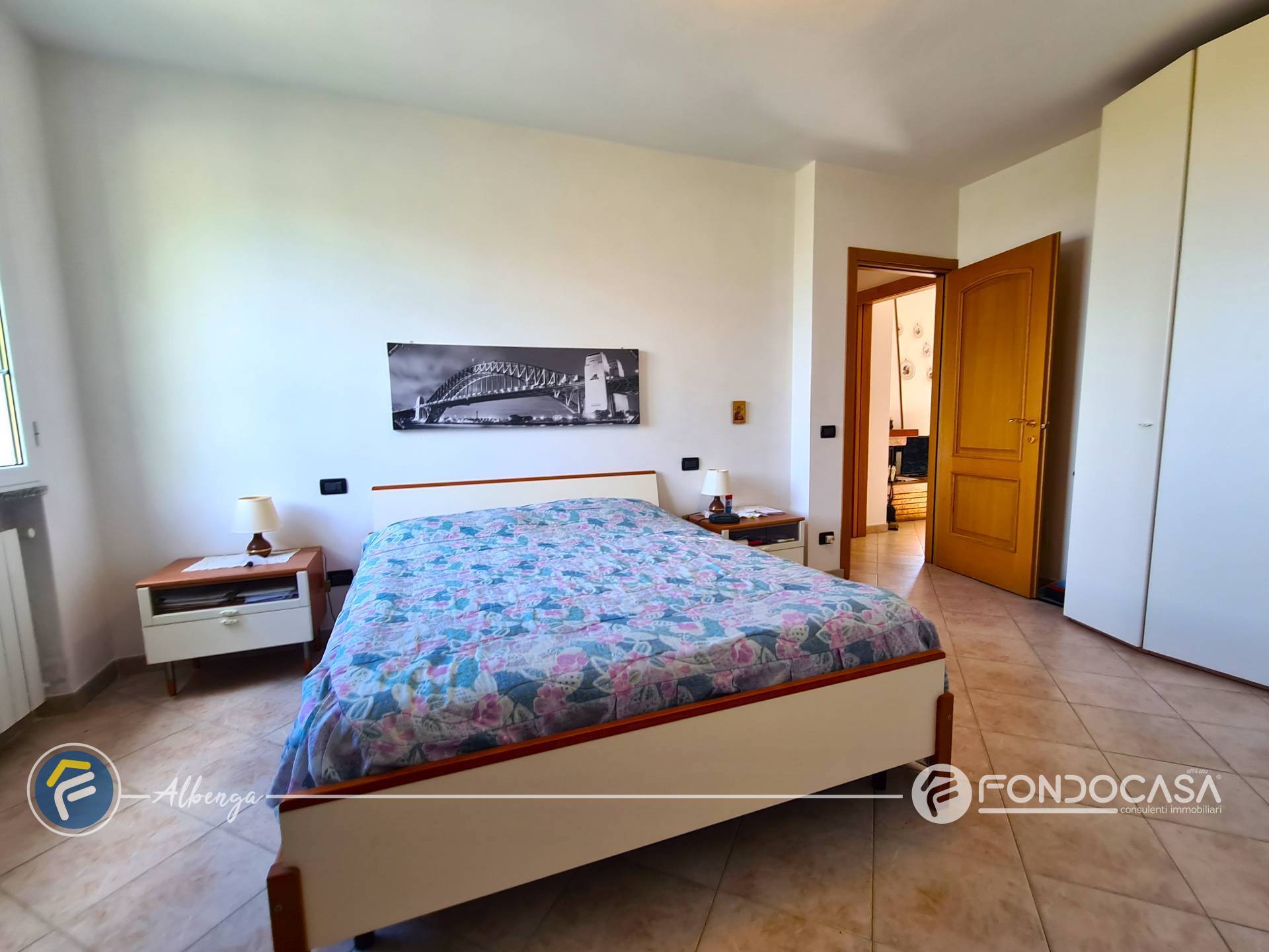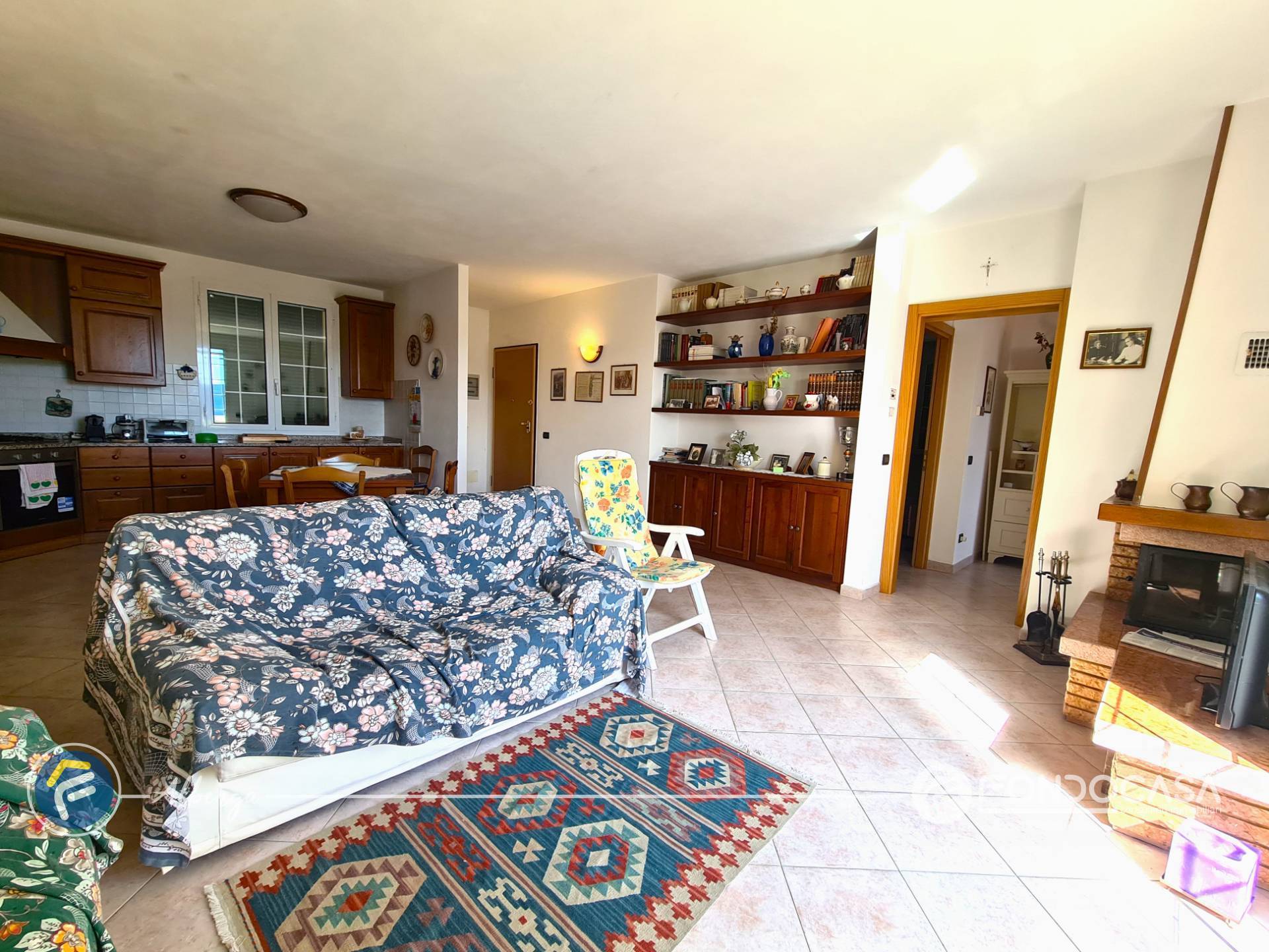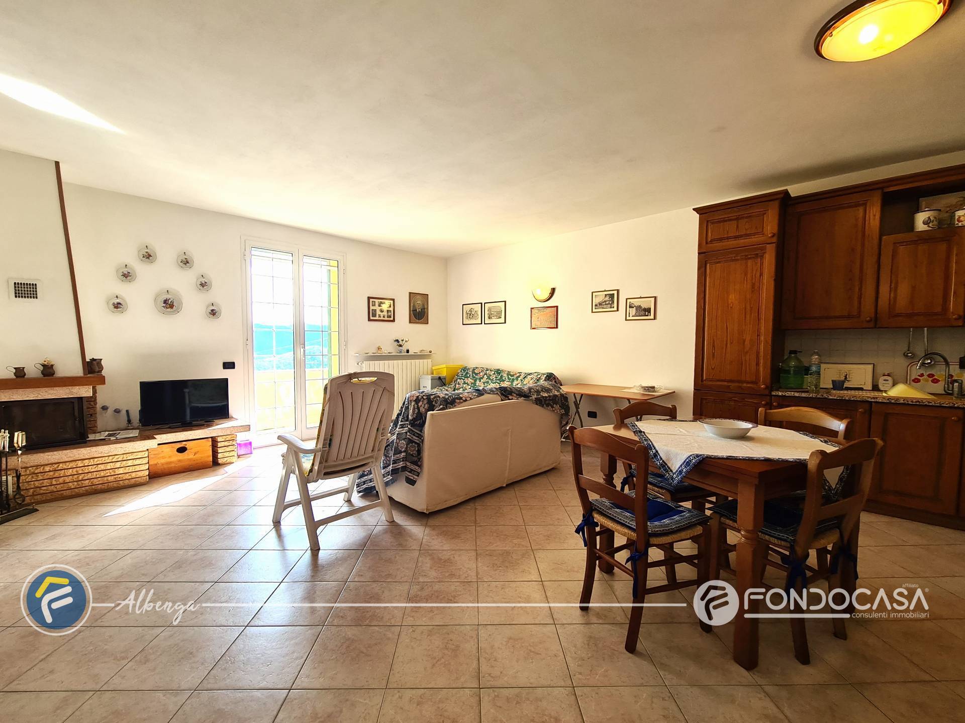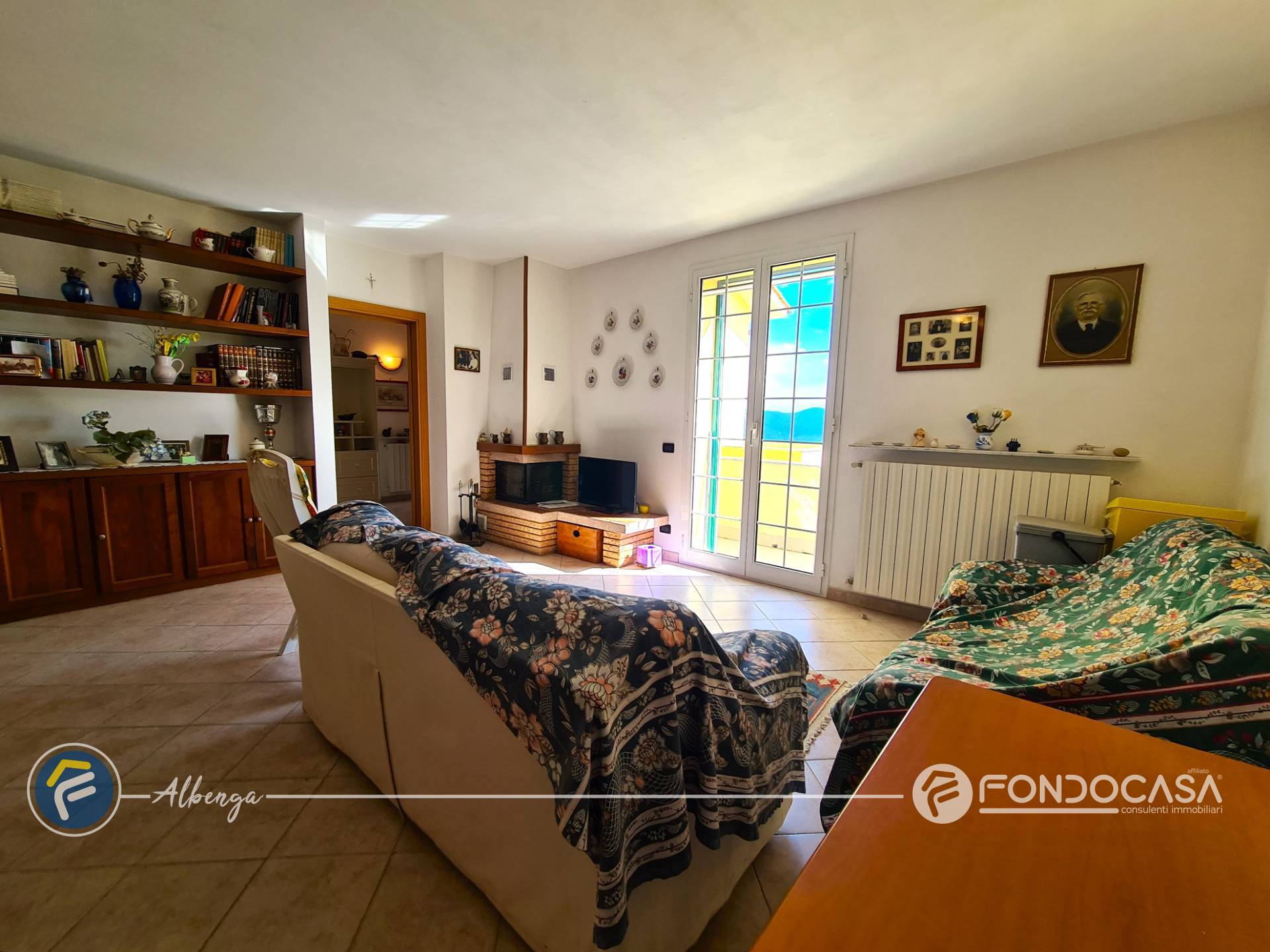 Un appartamento composto da ampio salone con caminetto a legna, cucina a vista, disimpegno, due camera matrimoniale, bagno finestrato con vasca e doccia, due terrazze ed ampio locale sottotetto.