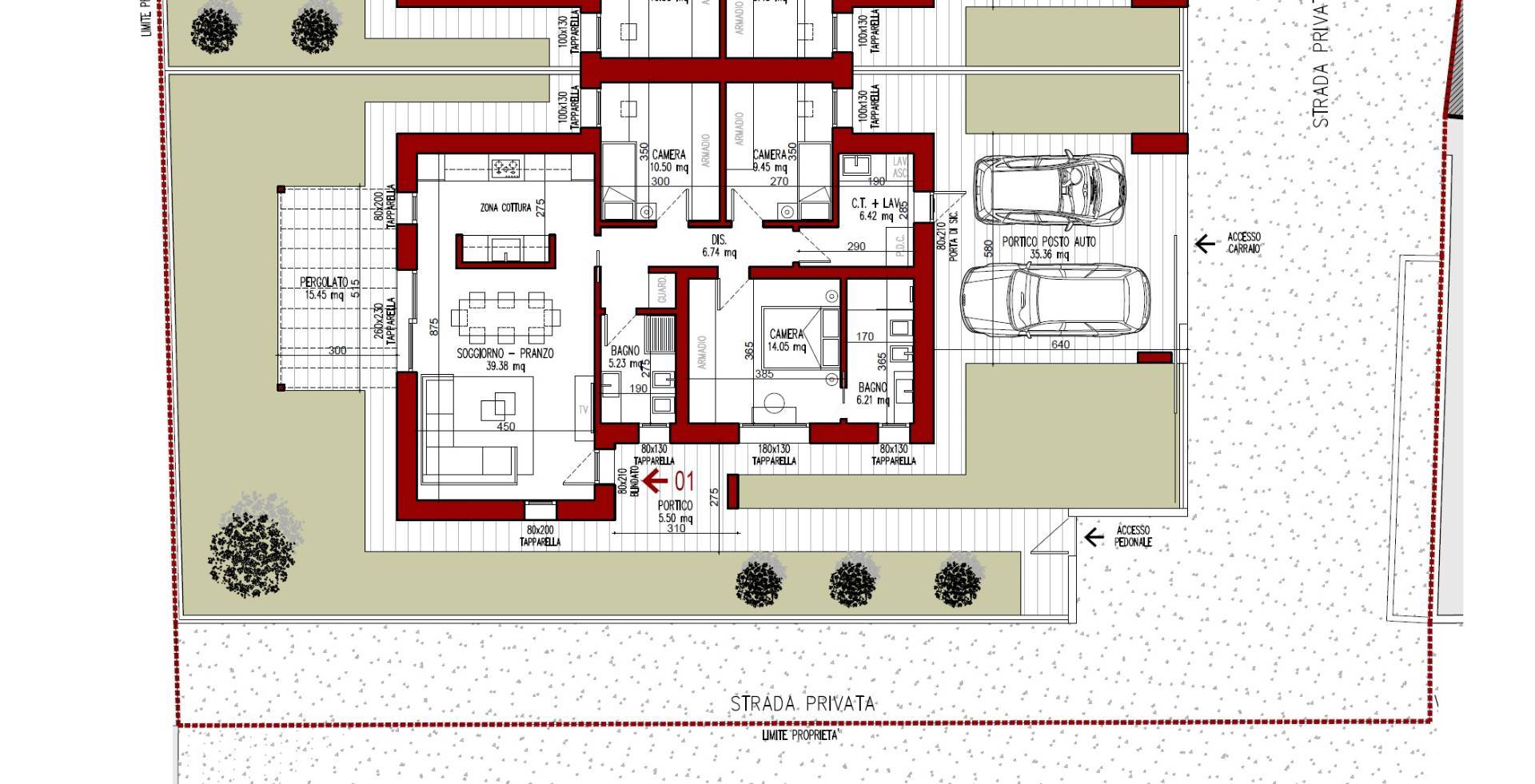 Ampia zona giorno con cucina a vista, portico abitabile su giardino privato, disimpegno notte, camera matrimoniale con bagno, due camere singole, bagno con antibagno, locale centrale termica con lavanderia, due posti auto coperti.
