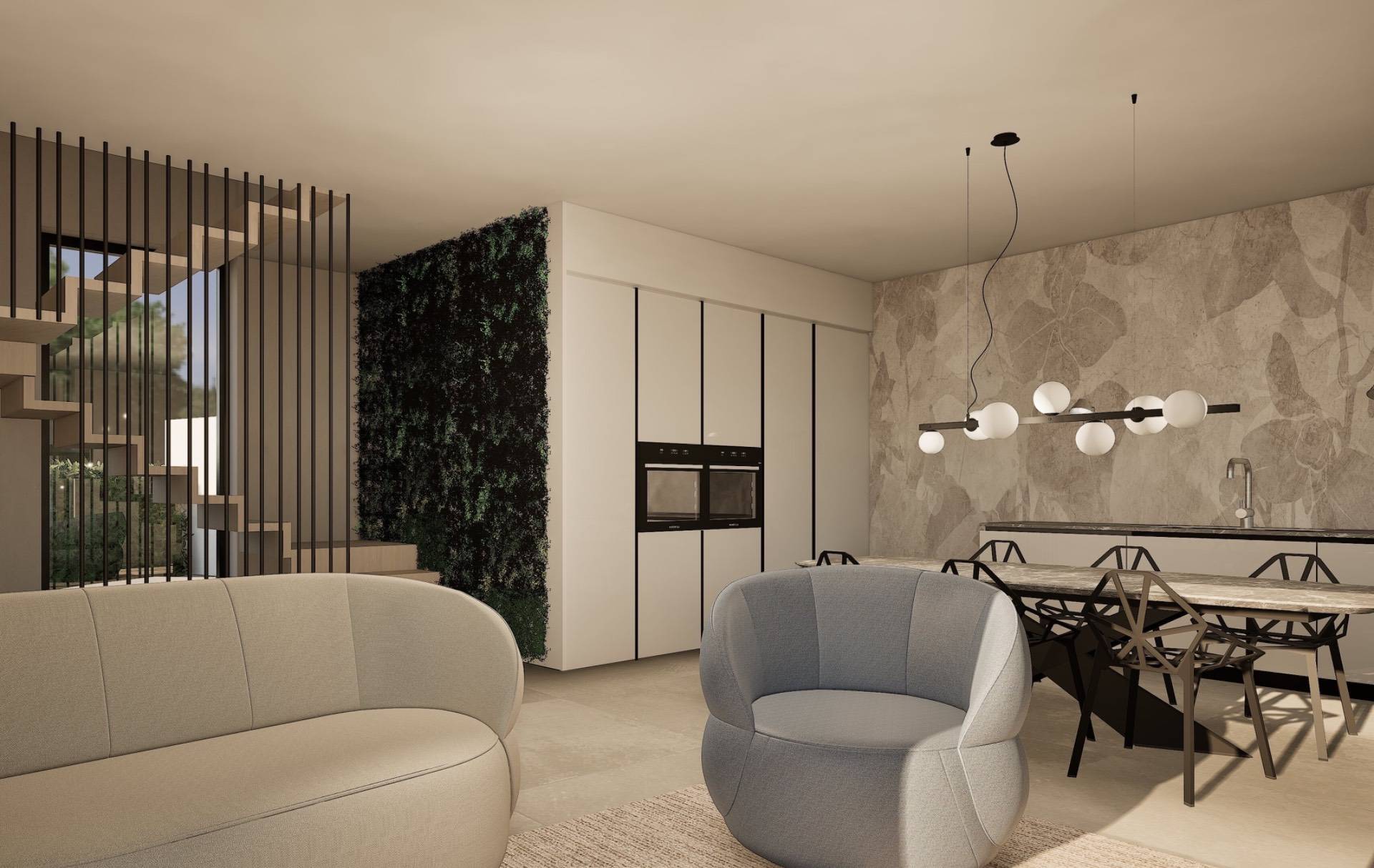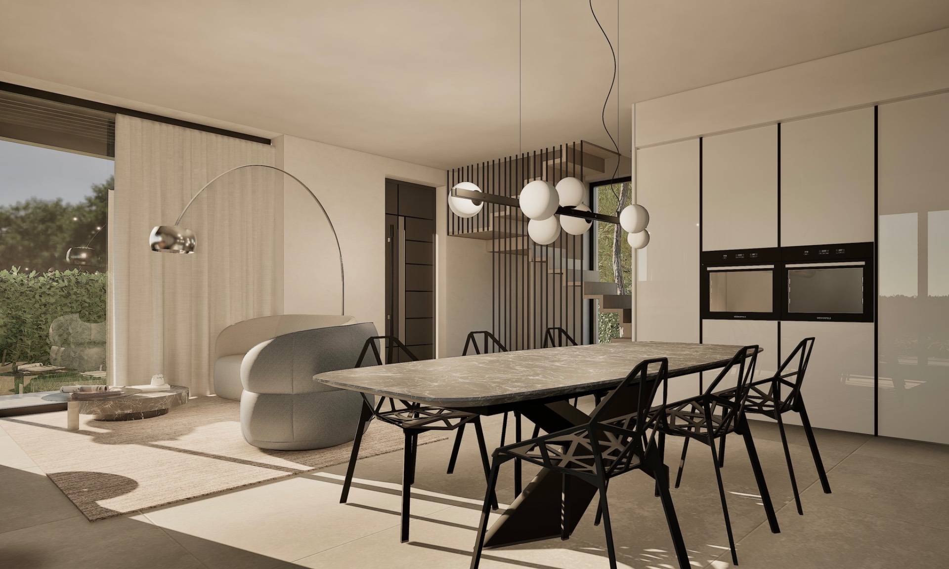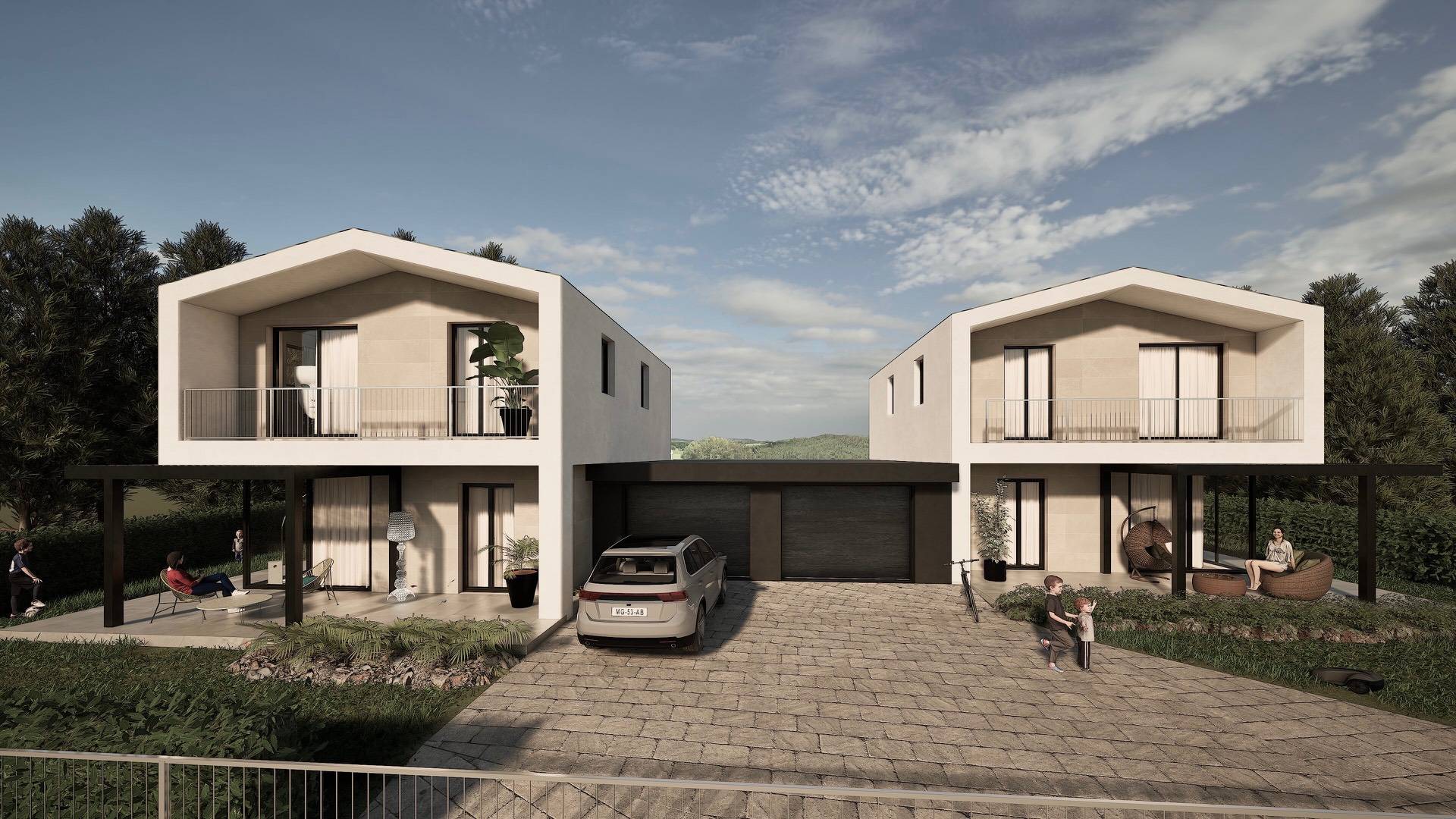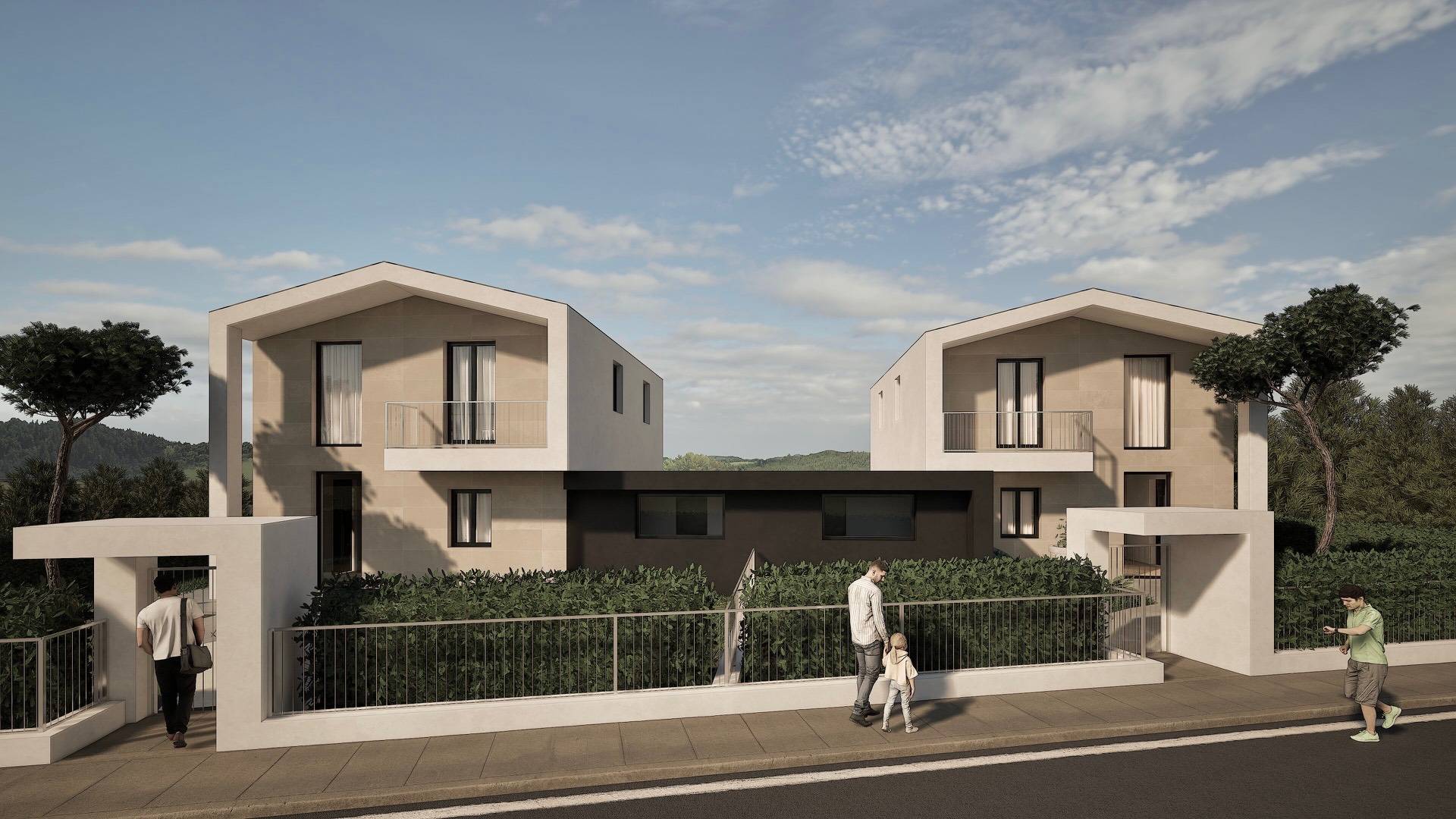 Attualmente vengono proposte diverse soluzioni architettoniche da quella pi classica a una pi moderna e innovativa, mantenendo la zona giorno, cucina con un bagno al piano terra e le tre camere da letto, bagno al primo piano oltre al giardino privato di oltre 500 mq da dividere tra le due villette gemelle che verranno costruite.