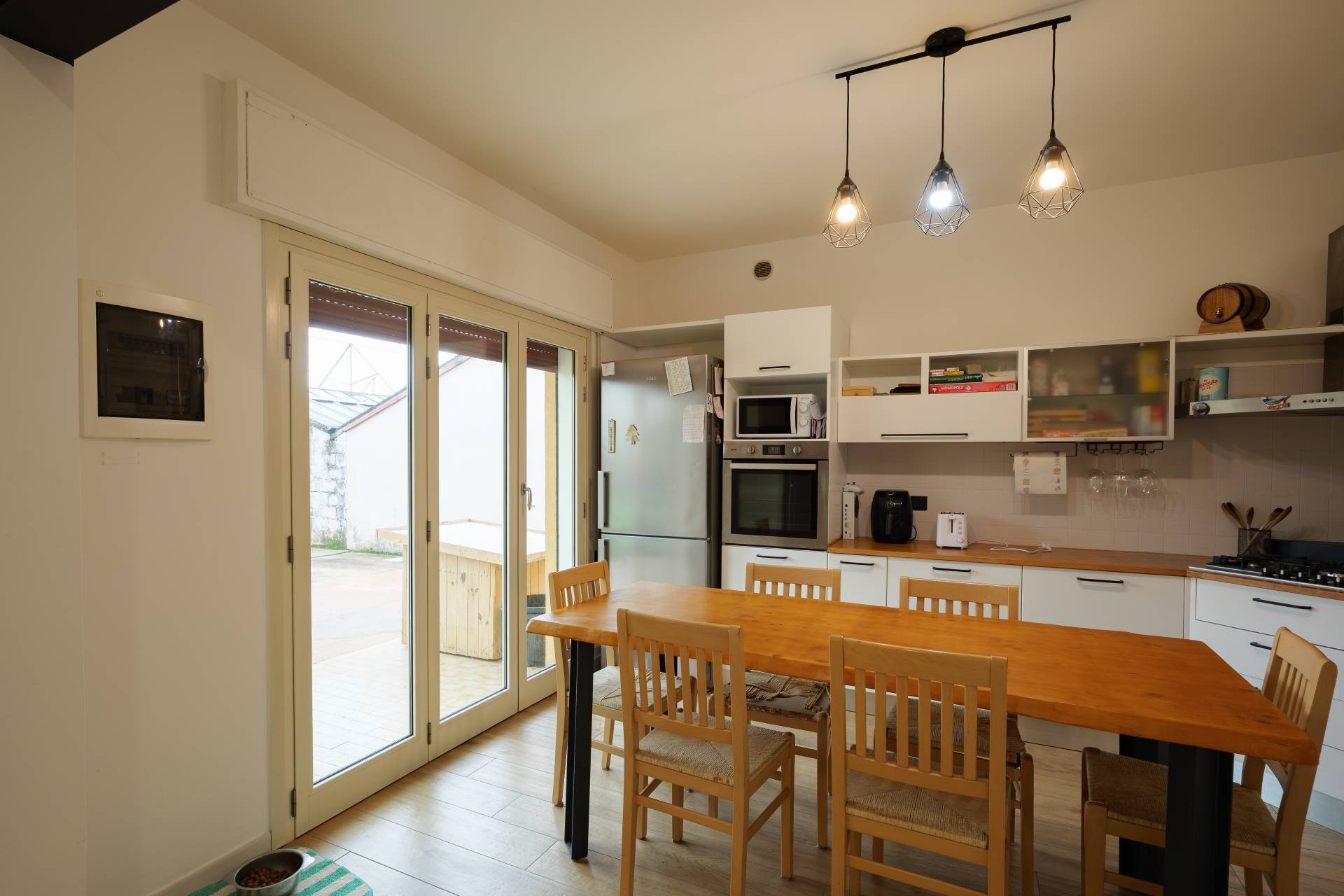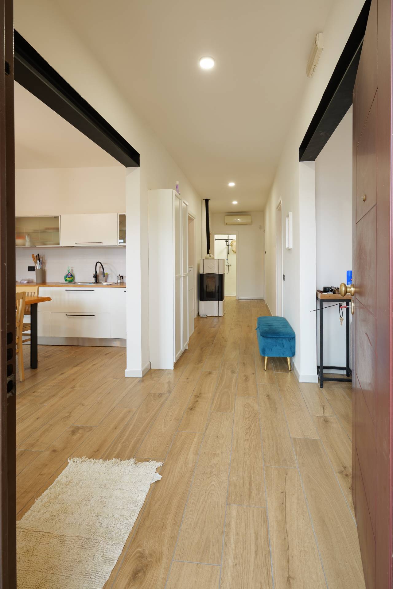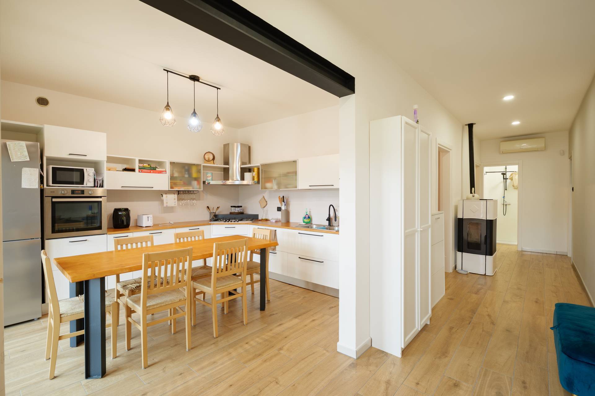 Internamente si compone di ingresso, luminoso living, cucina a vista (che si pu chiudere/separare), disimpegno dove presente la stufa a pellet con l'impianto canalizzato, 3=(tre camere) e 2=(due) bagni.