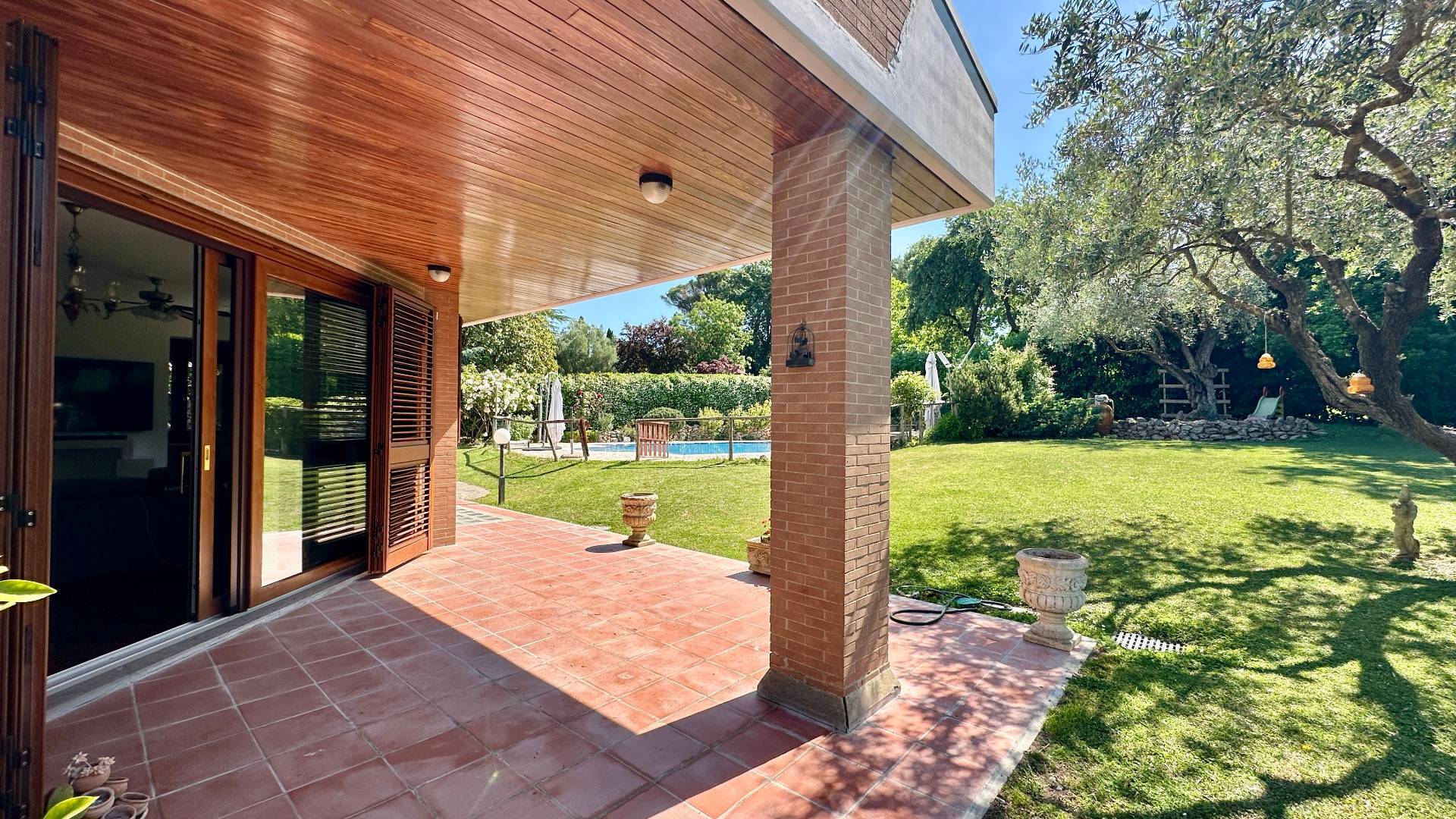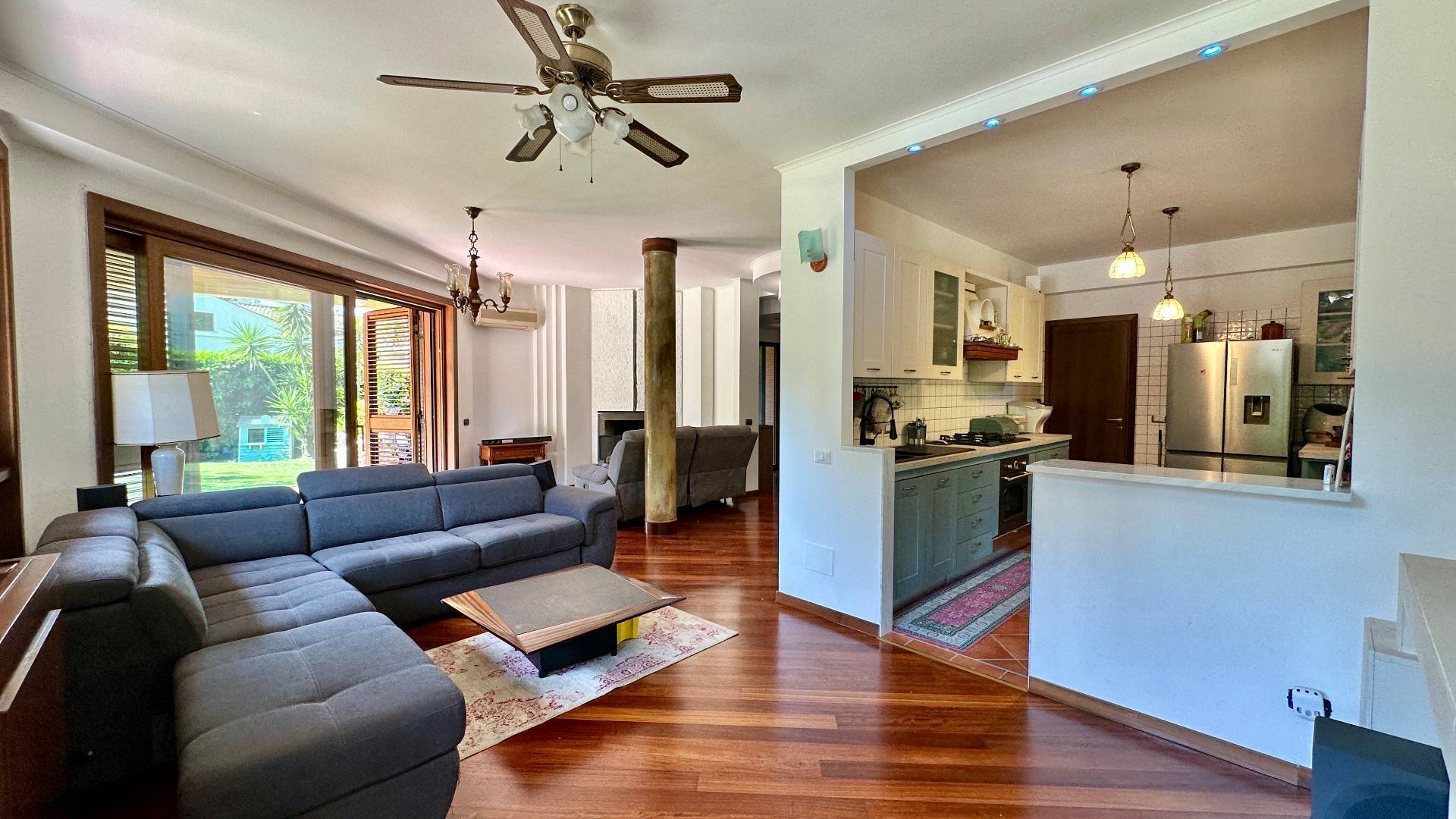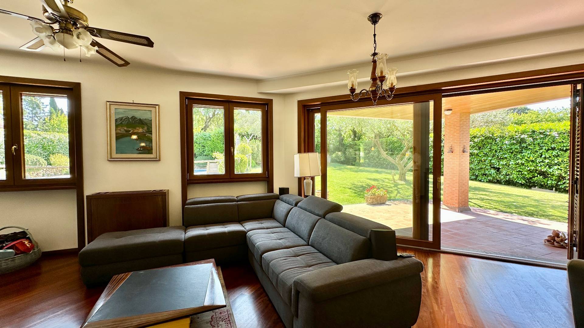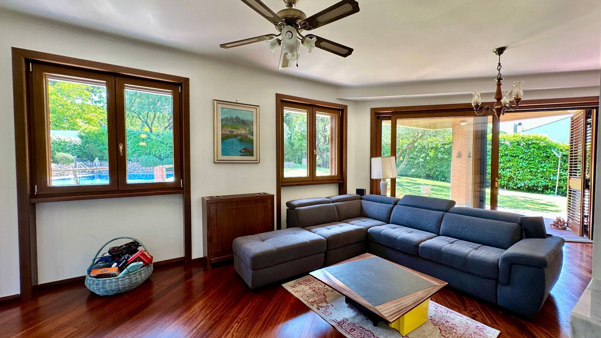 Entrando ci accoglie il salone con camino che con ampie vetrate crea continuit con lo spazio esterno e la piscina dove un grande patio offre la possibilit di trascorrere momenti di convivialit tutto l'anno. Una cucina attrezzata con spazio adiacente dedicato al pranzo ottimamente organizzato con forno per le pizze completa questa zona living.