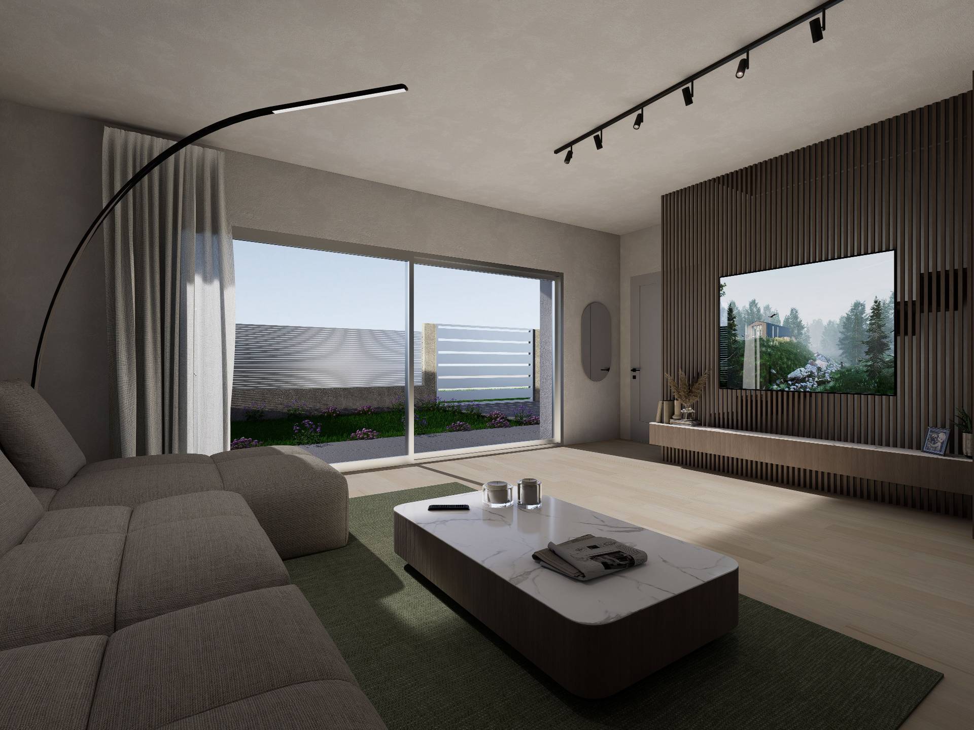 Ingresso su luminosa zona living con cucina in open space di oltre 44 m calpestabili, accesso tramite porta finestra di ben 4 metri lineari all'area esterna dotata di pergola.
