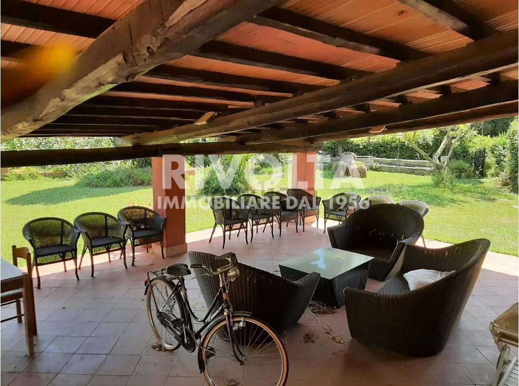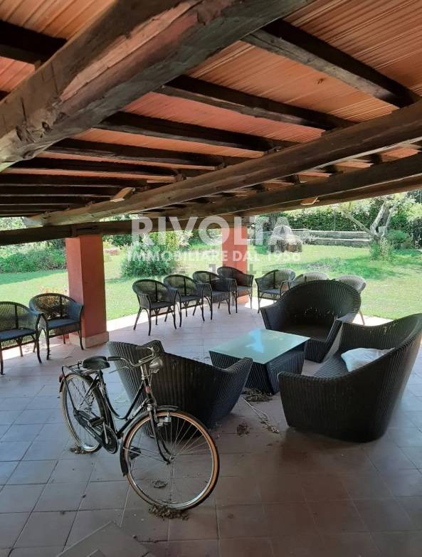 La veranda accogliente di mq 100 attrezzata con un tavolo in muratura per pranzi all'aperto circondata da uno splendido prato all'inglese.