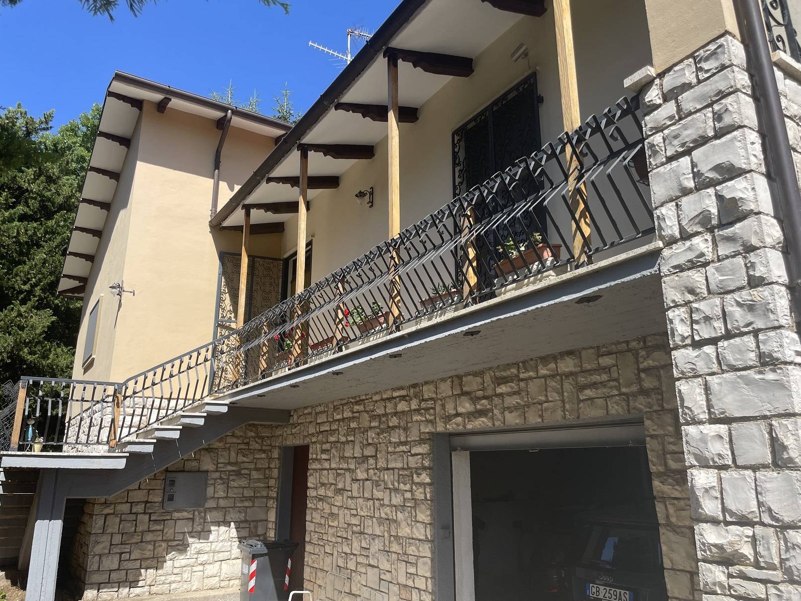 Piano primo: ingresso, luminoso soggiorno con camino e balcone panoramico, cucina abitabile con secondo camino e terrazzino, tre camere da letto (una con balcone), bagno e pratico ripostiglio.