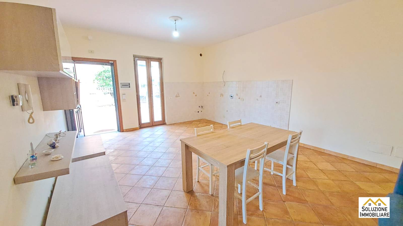 Al piano terra troviamo salone con angolo cottura, grande camera da letto, servizio con finestra, ampio patio e giardino di mq 40. Al piano primo troviamo una mansarda con due camerette, disimpegno, servizio con doccia finestrato, un balcone e un ampio terrazzo.