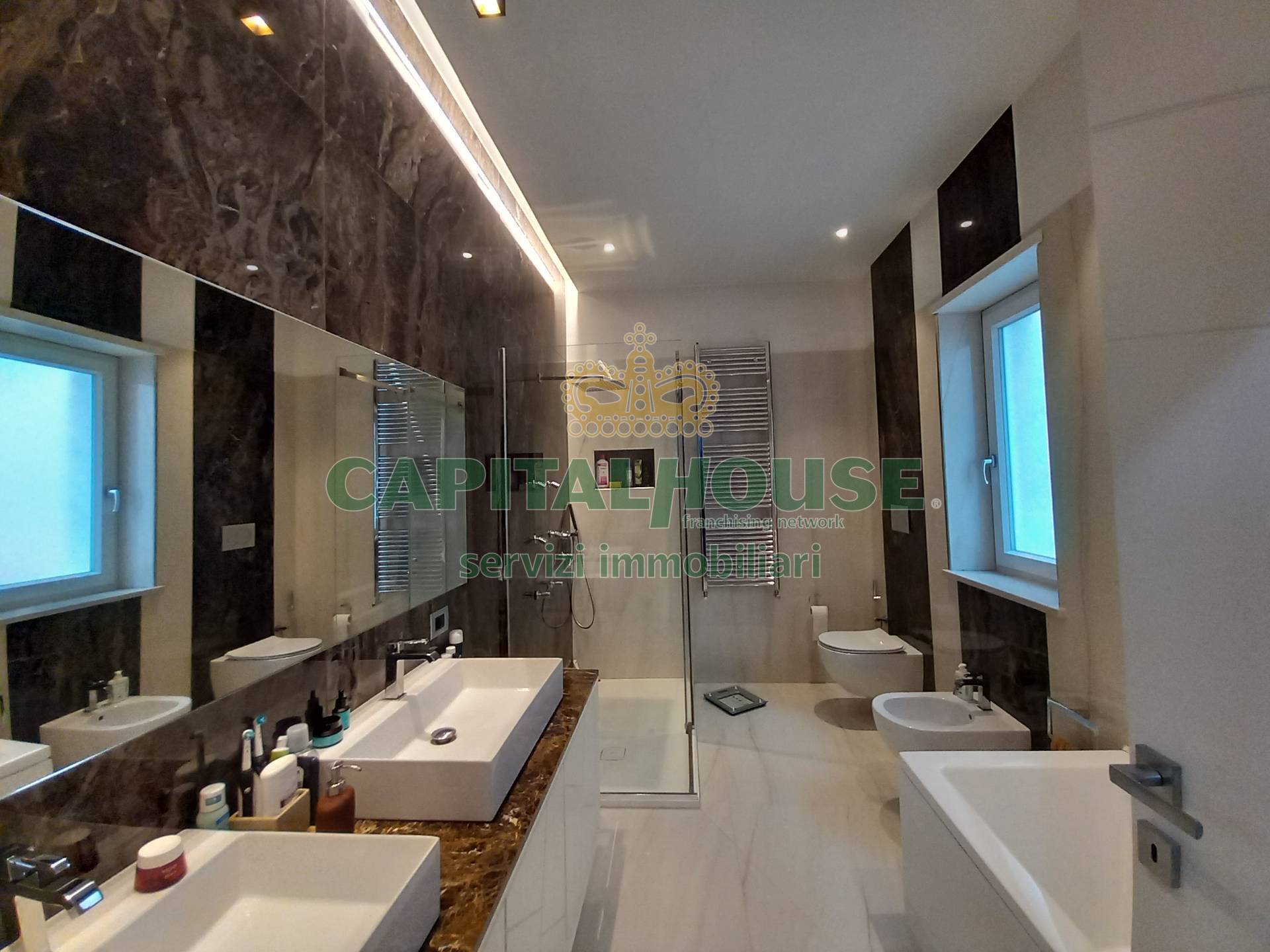 La zona notte, ben separata, include una camera matrimoniale con cabina armadio e un lussuoso bagno dotato di vasca e doccia idromassaggio, oltre a due ulteriori camere e un secondo bagno e lavanderia.