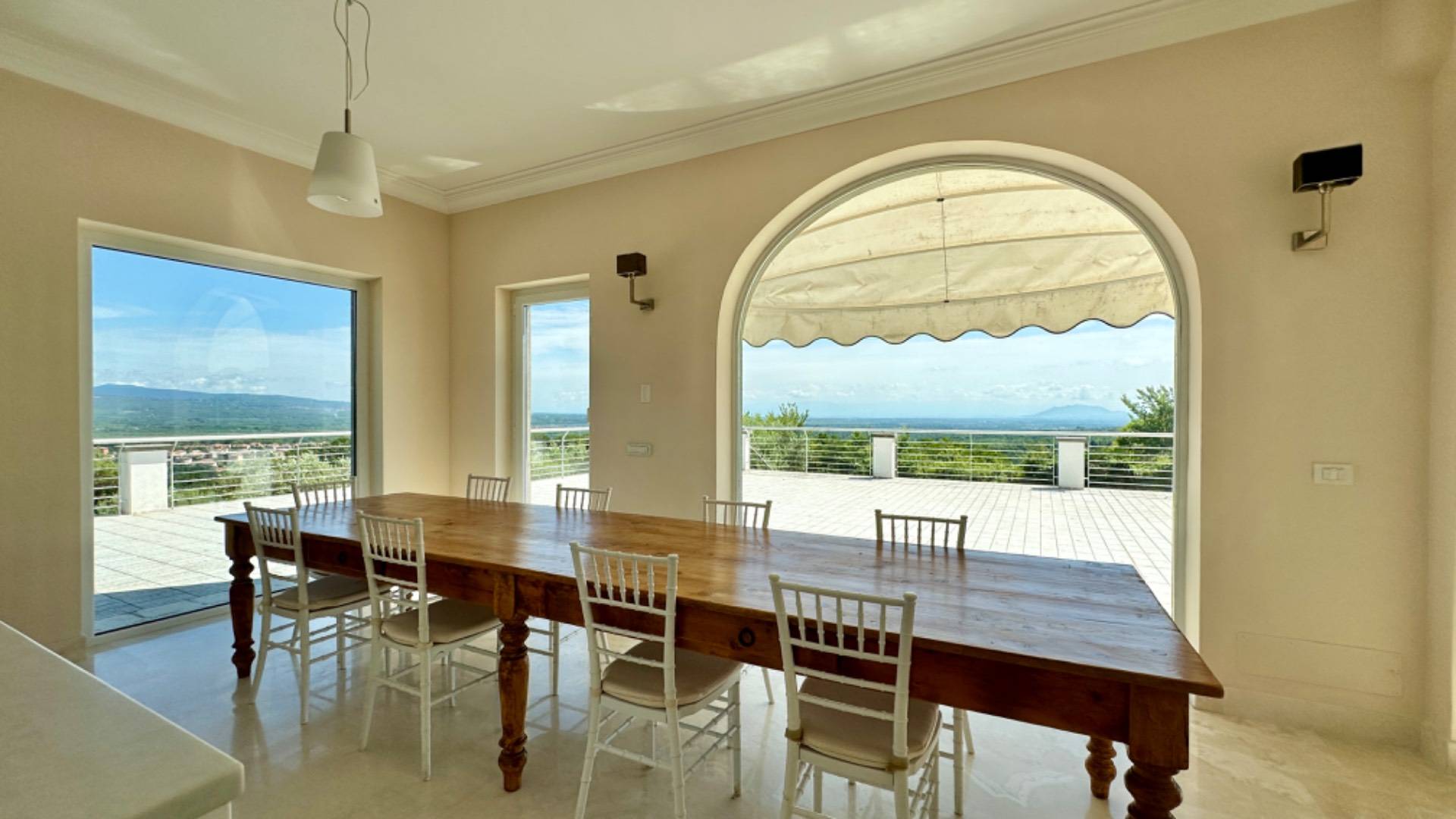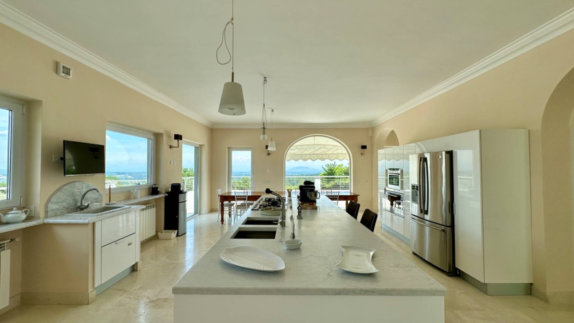 Entrando ci colpiscono gli spazi aperti ma allo stesso tempo molto bene organizzati, la zona dedicata al living con camino e al pranzo che con grandi vetrate crea continuit con l' esterno e la cucina con isola centrale completa in ogni dettaglio anch'essa con affacci spettacolari.