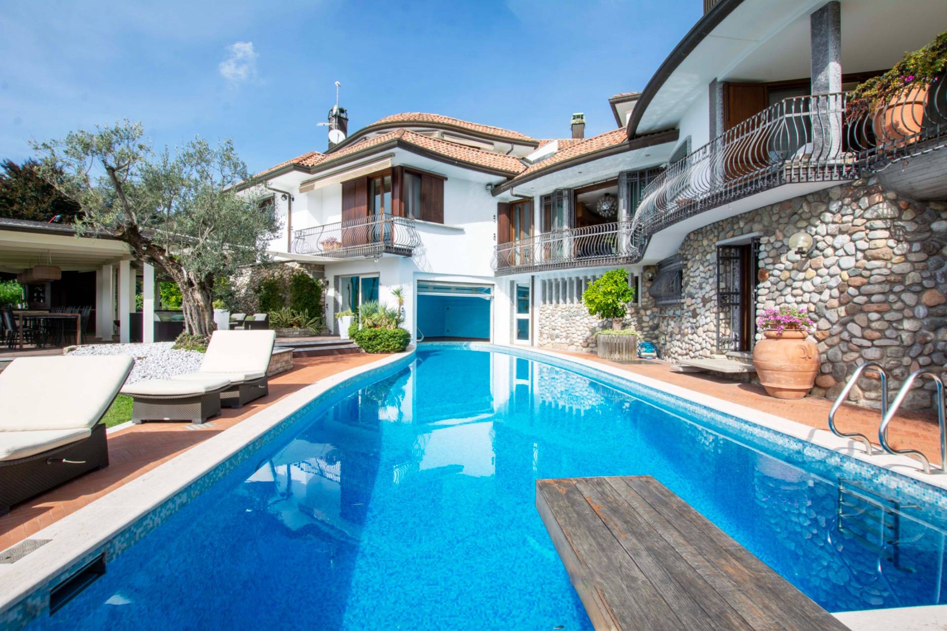 Inoltre, sul prato all'inglese, si trova una fantastica vasca idromassaggio con vista panoramica sul lago. Il cuore della propriet una spettacolare piscina con trampolino e una jacuzzi, immerse in un paesaggio che si fonde perfettamente con lambiente circostante Comodit e Posizione La propriet dotata di un ampio garage e di ulteriori posti auto esterni.