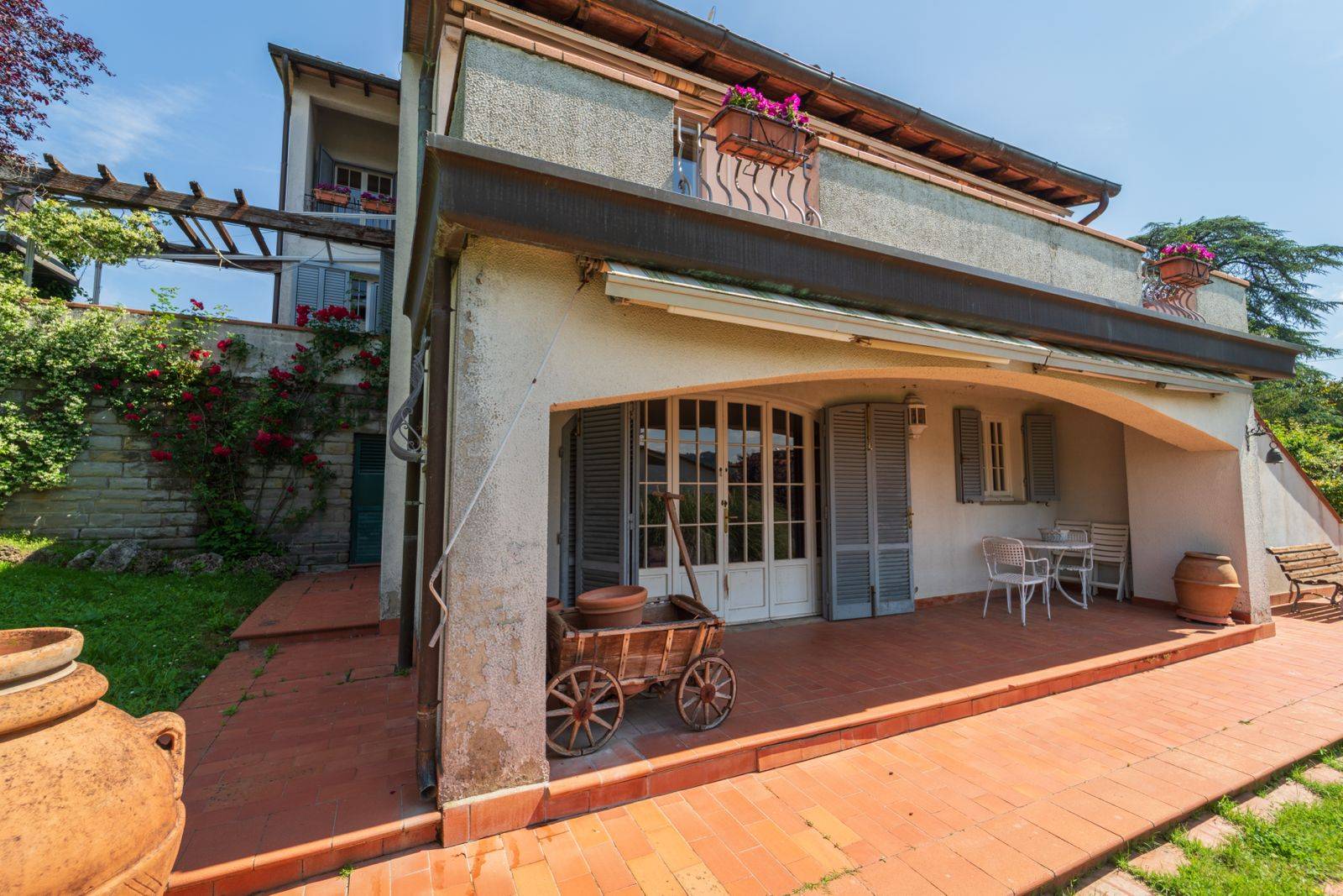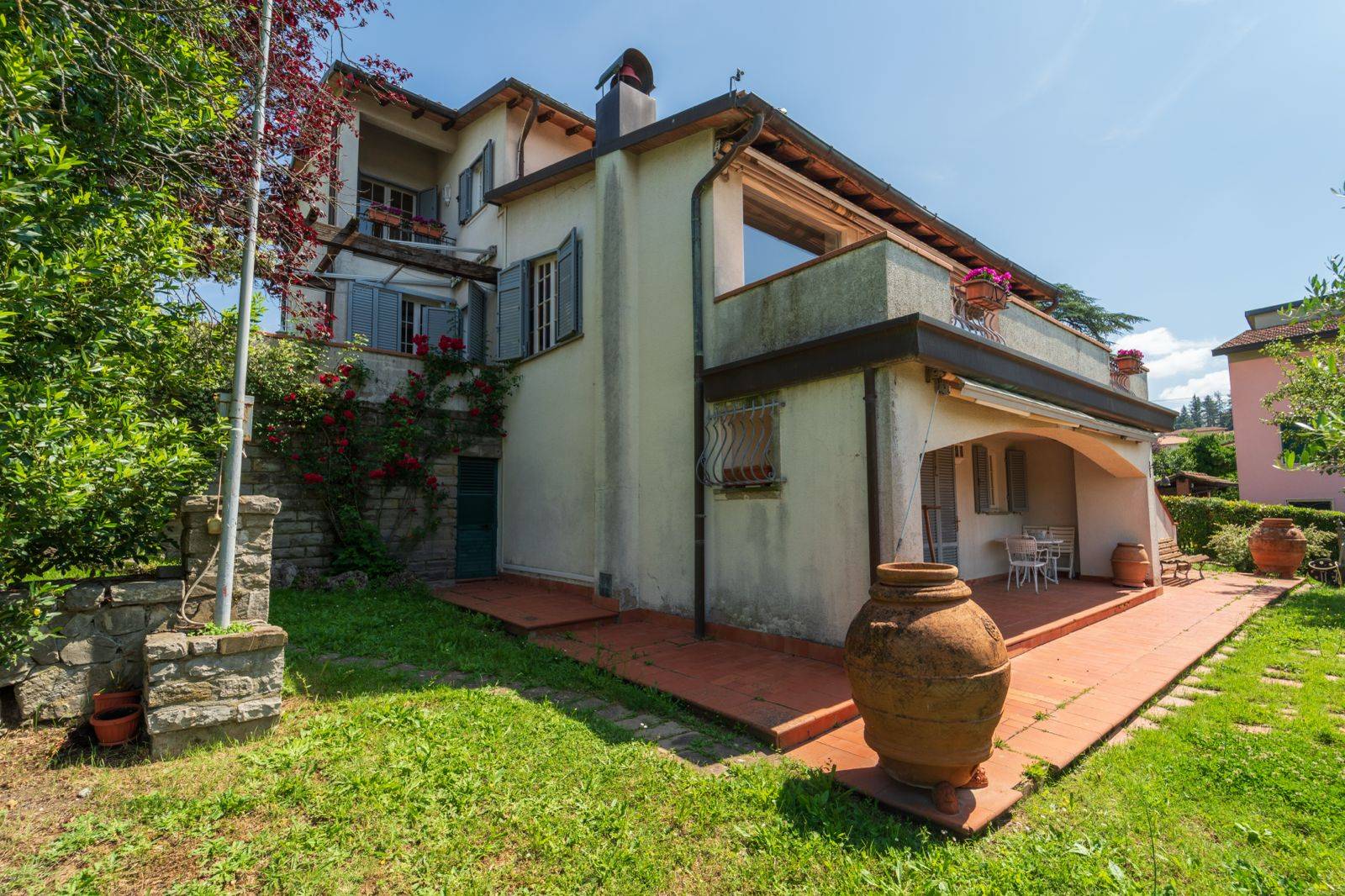 bibbiena - centro paese vendesi immobile di lusso - ubicato in posizione strategica - a due passi dal centro storico e nelle immediate vicinanze dei servizi principali - la villa e' sviluppata su 3 livelli e cosi' composta: piano terra - ingresso su ampio disimpegno, salone con terrazzo panoramico e uscita su loggia con pergolato - corridoio, cucina, dispenza e angolo cottura in muratura; piano primo - grande disimpegno, tre camere e due bagni; piano seminterrato - lavanderia con passabiancheria, bagno, cantina con accesso esterno, ampia taverna con camino e uscita sul giardino.