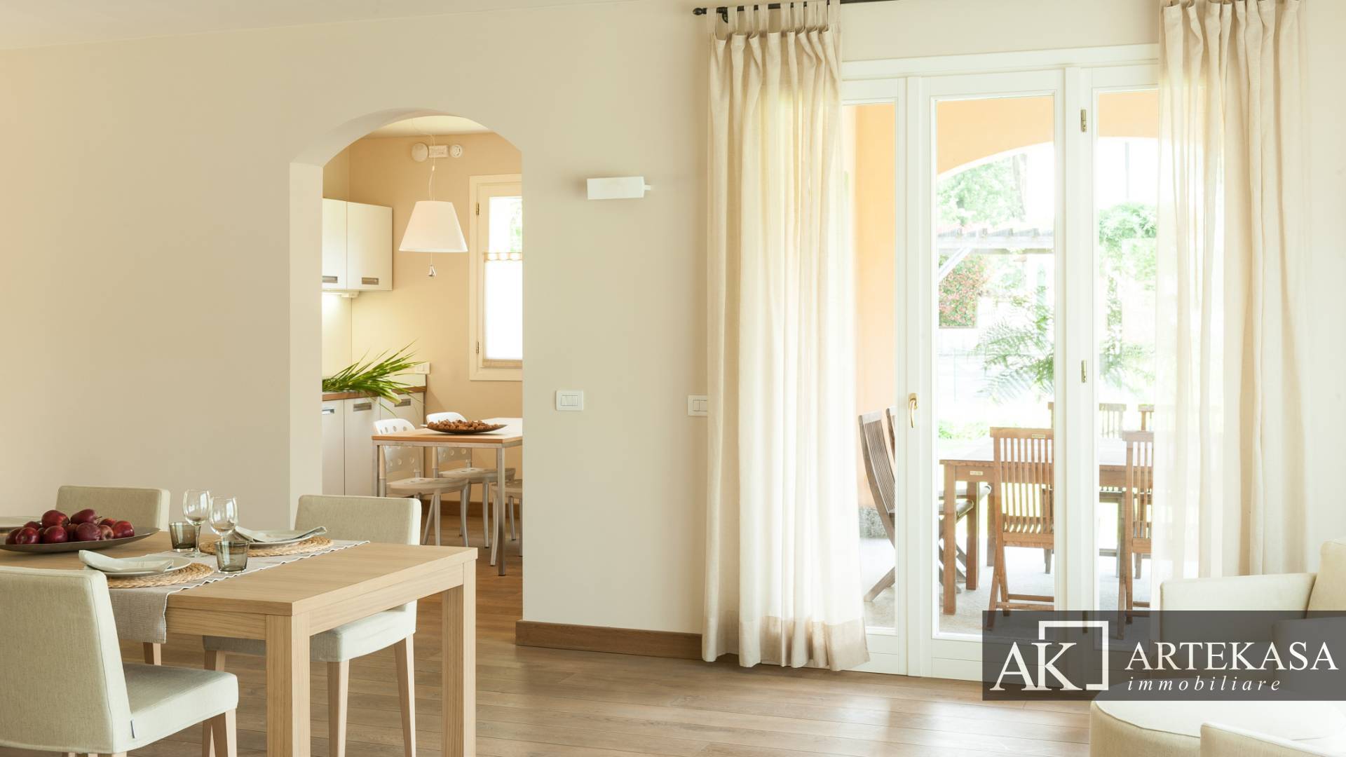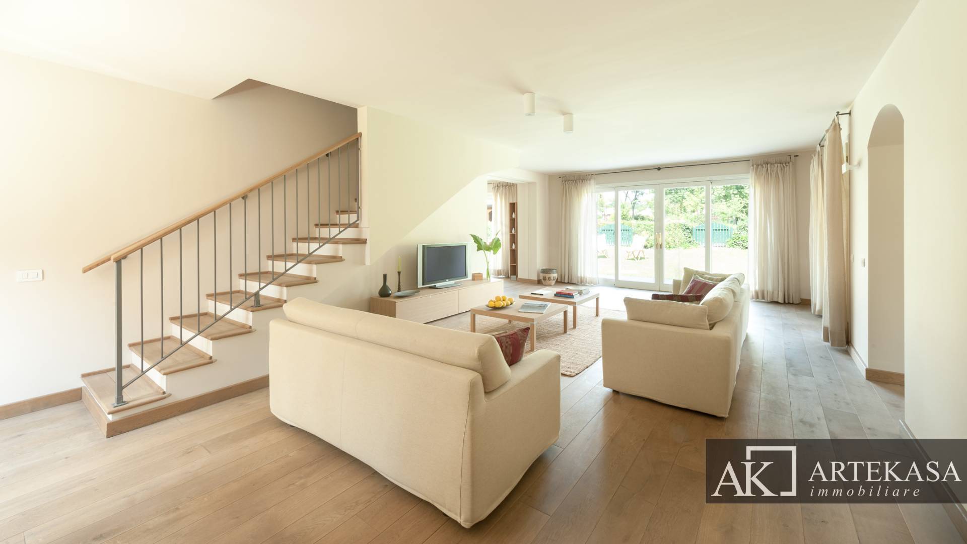 Inserito in questo meraviglioso contesto sorge il Petit Village un piccolo complesso, composto da una ventina di ville dove troviamo, UNICA, questa bellissima villa indipendente di 365 mq distribuita su due livelli con giardino privato di ca 1.100 mq. Al piano terra ampio soggiorno, grande sala da pranzo, cucina abitabile che si affaccia sul porticato, studio / ufficio con accesso al secondo portico e due bagni giorno.
