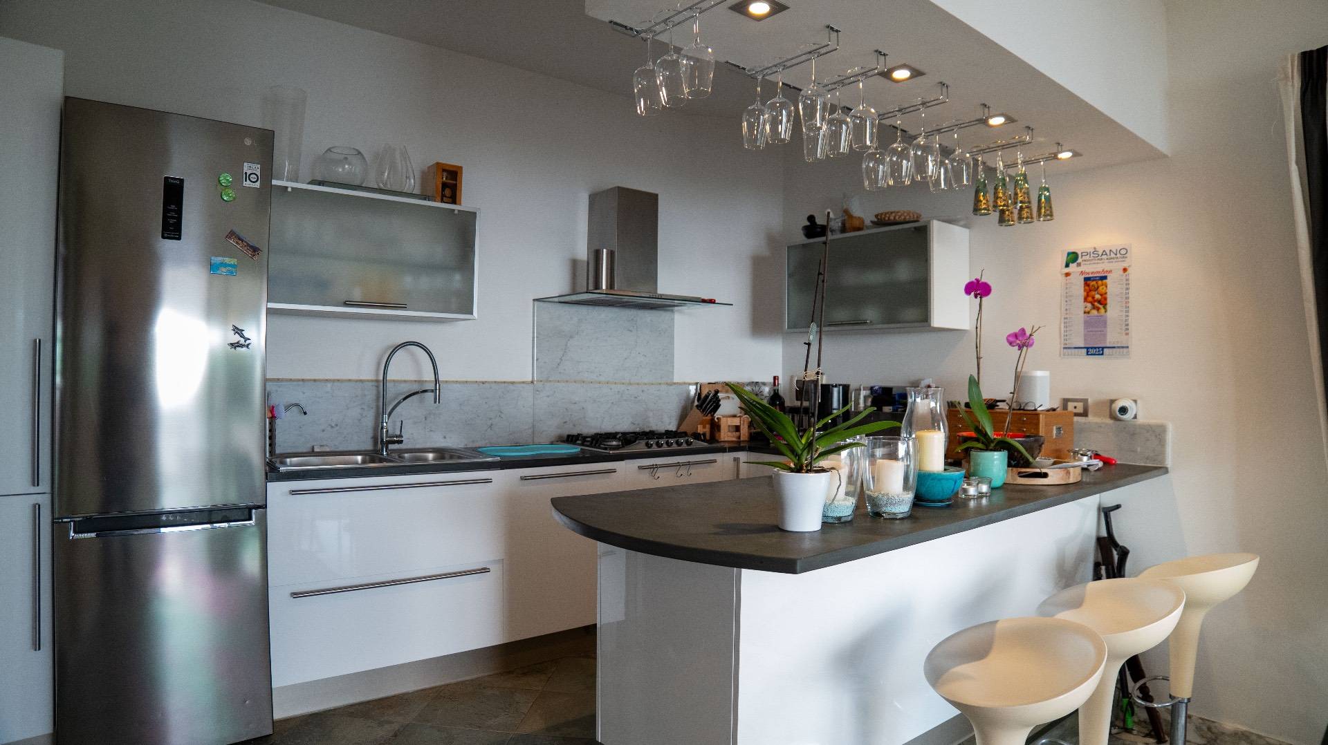La cucina con sala da pranzo, collegata da una grande portafinestra, conduce direttamente al terrazzo e al giardino fronte mare, perfetti per pranzi allaperto e momenti di relax.