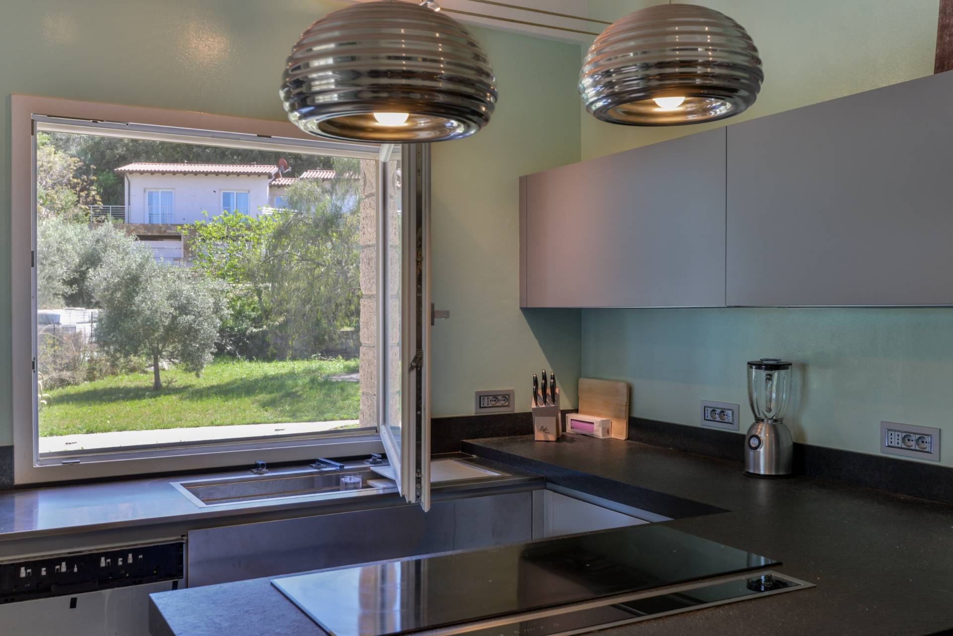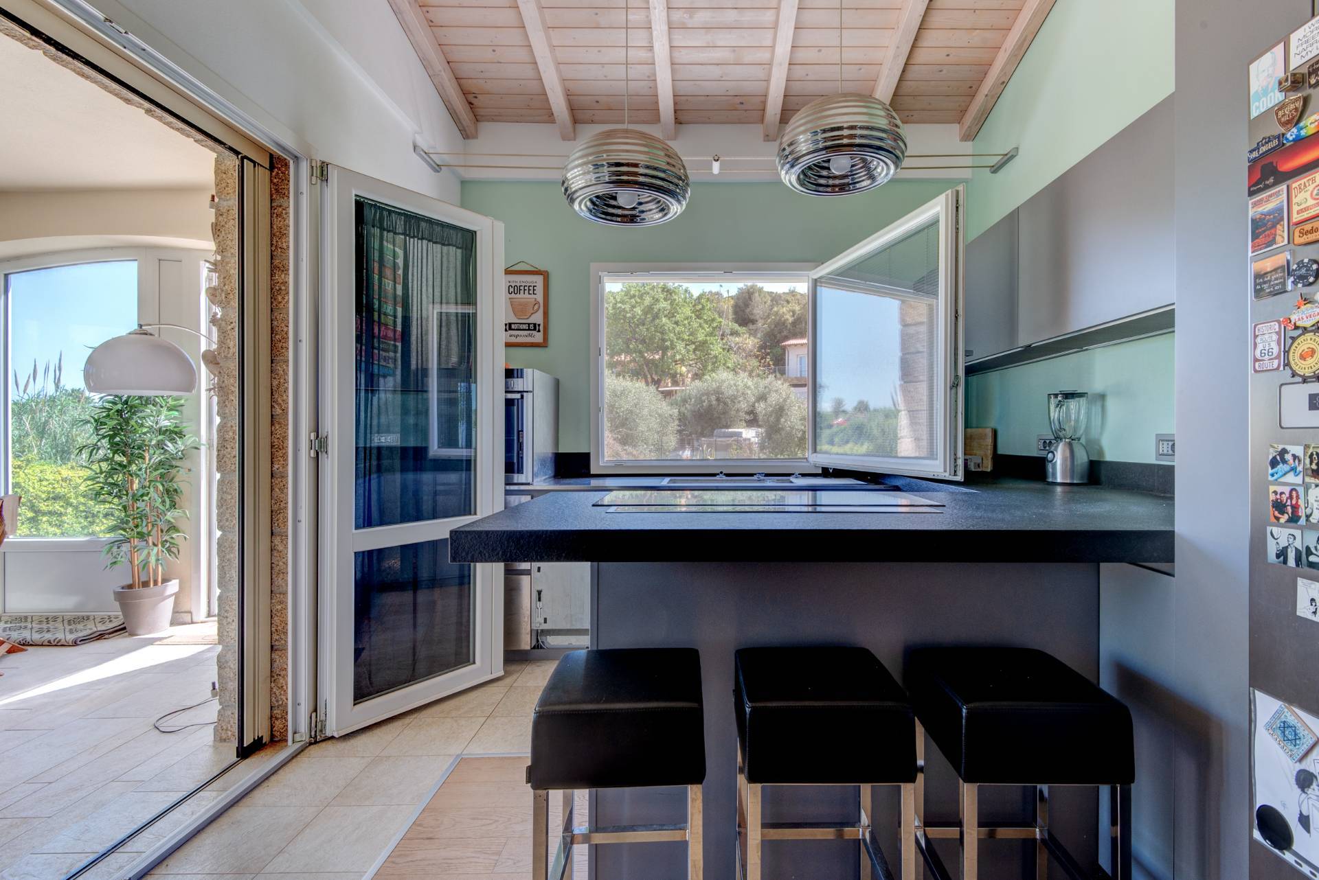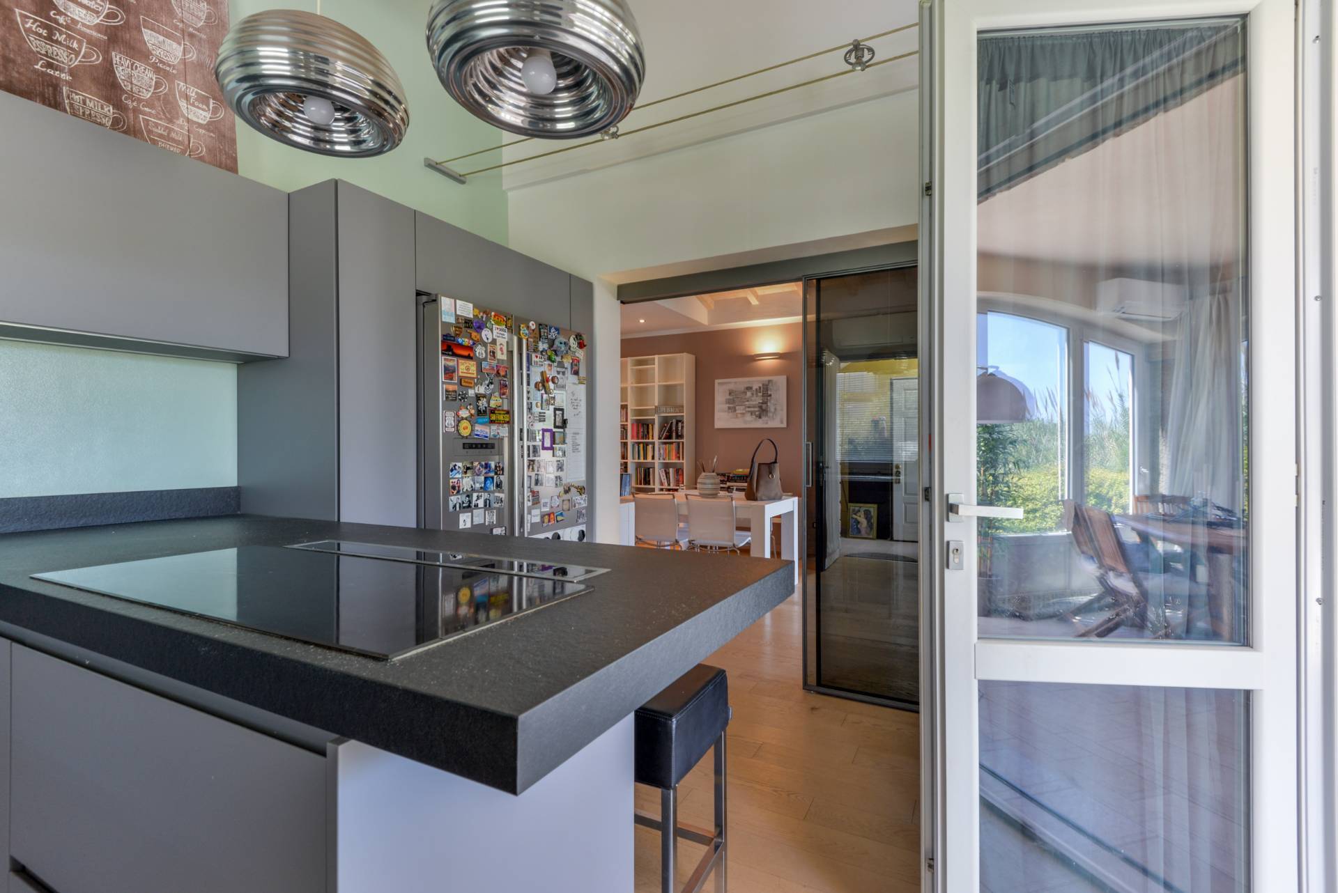 La cucina abitabile, moderna e di design, si integra perfettamente con lambiente ed collegata a un raffinato portico.