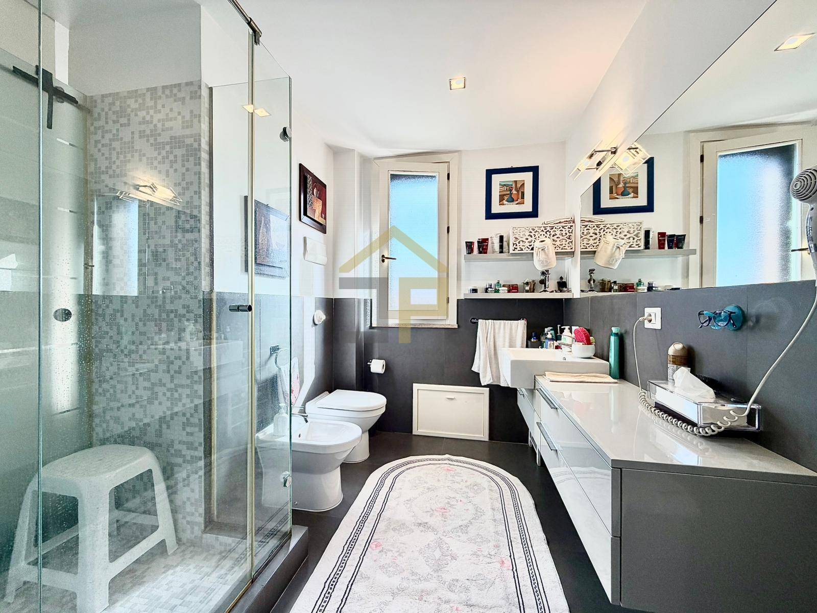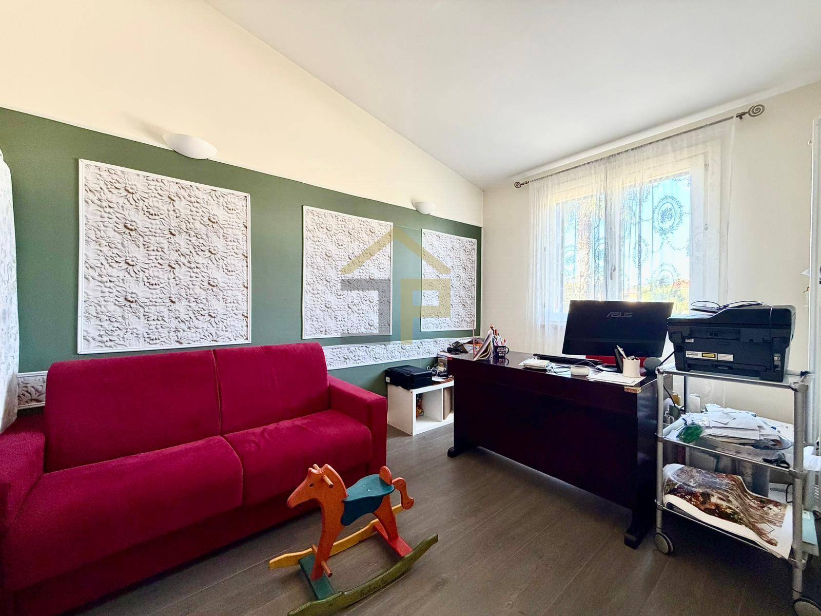 La zona giorno al piano terra comprende inoltre uno studio/camera e due bagni finemente rifiniti.