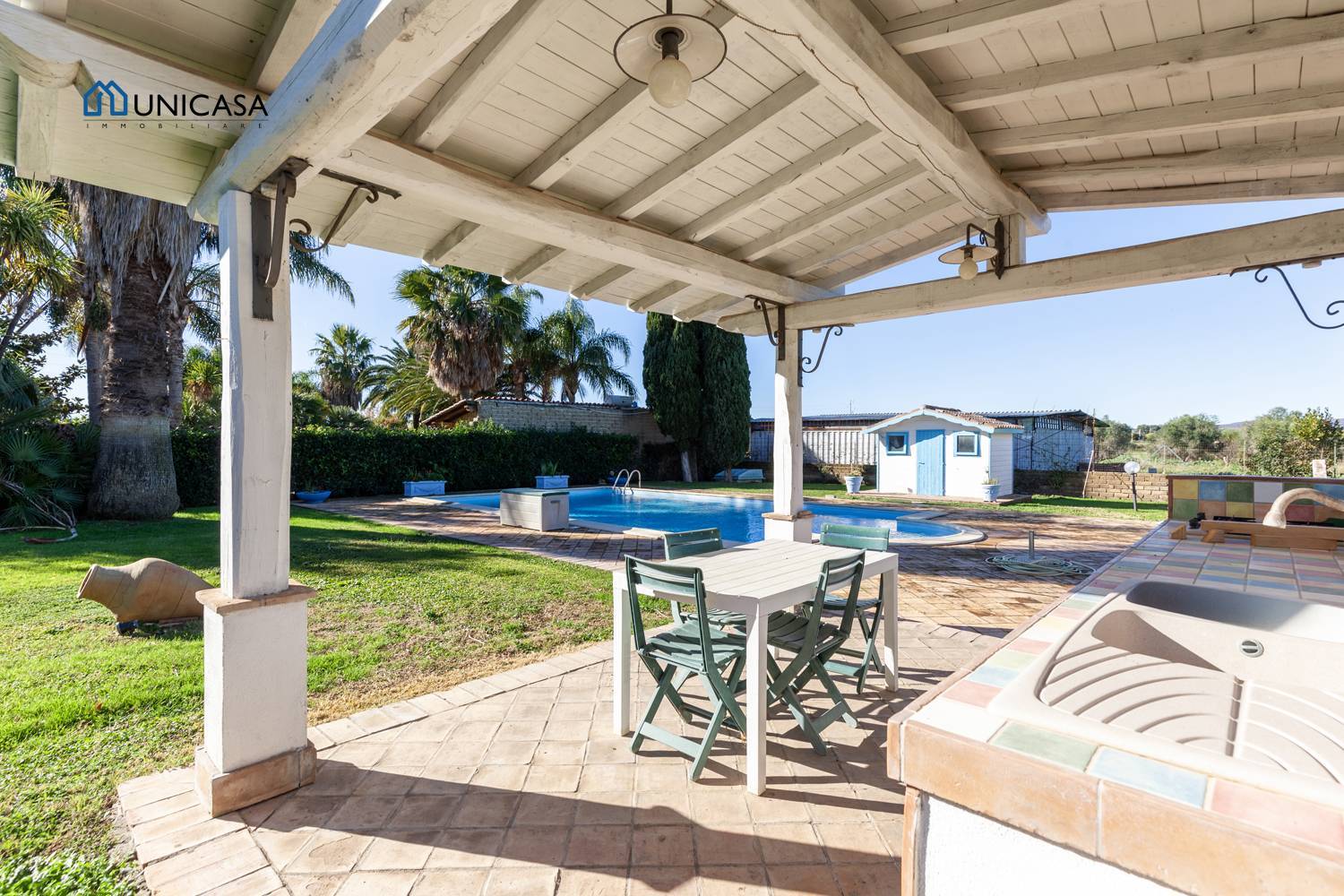 Intorno alla villa c' un bellissimo porticato, ove sul retro sono presenti una piscina circondata da prato verde e una pergola adatta per condividere momenti in famiglia.