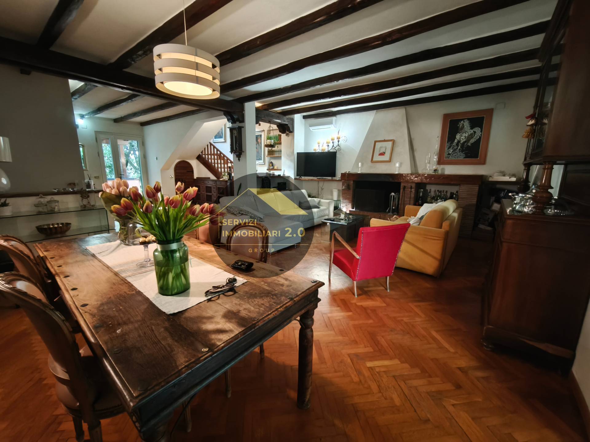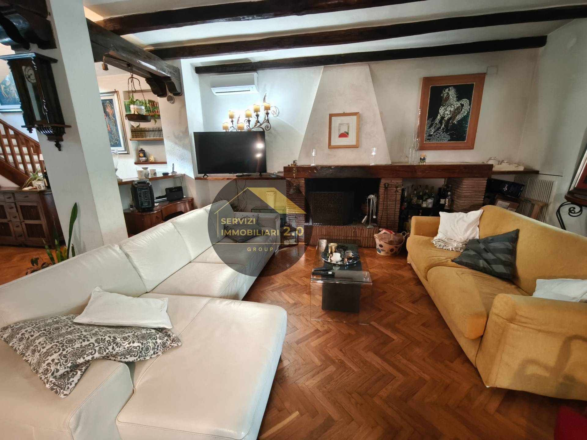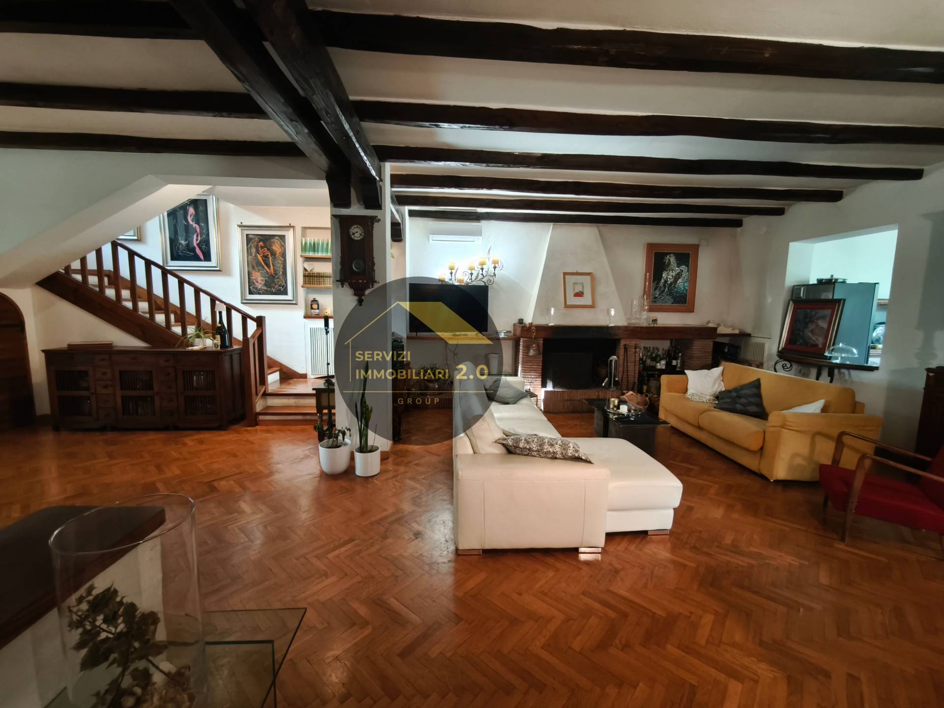 ° Distribuzione internaPiano Terra Ampio salone triplo con camino e travi a vista, ambiente caldo e rappresentativo, perfetto per accogliere famiglia e ospiti.