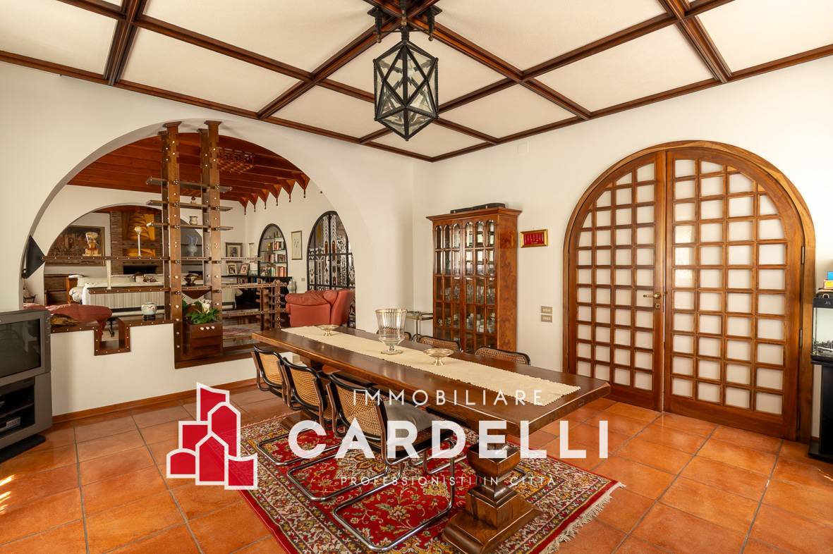 La zona giorno completamente open space, con numerosi dettagli architettonici di pregio, un'oasi di pace nel parco.