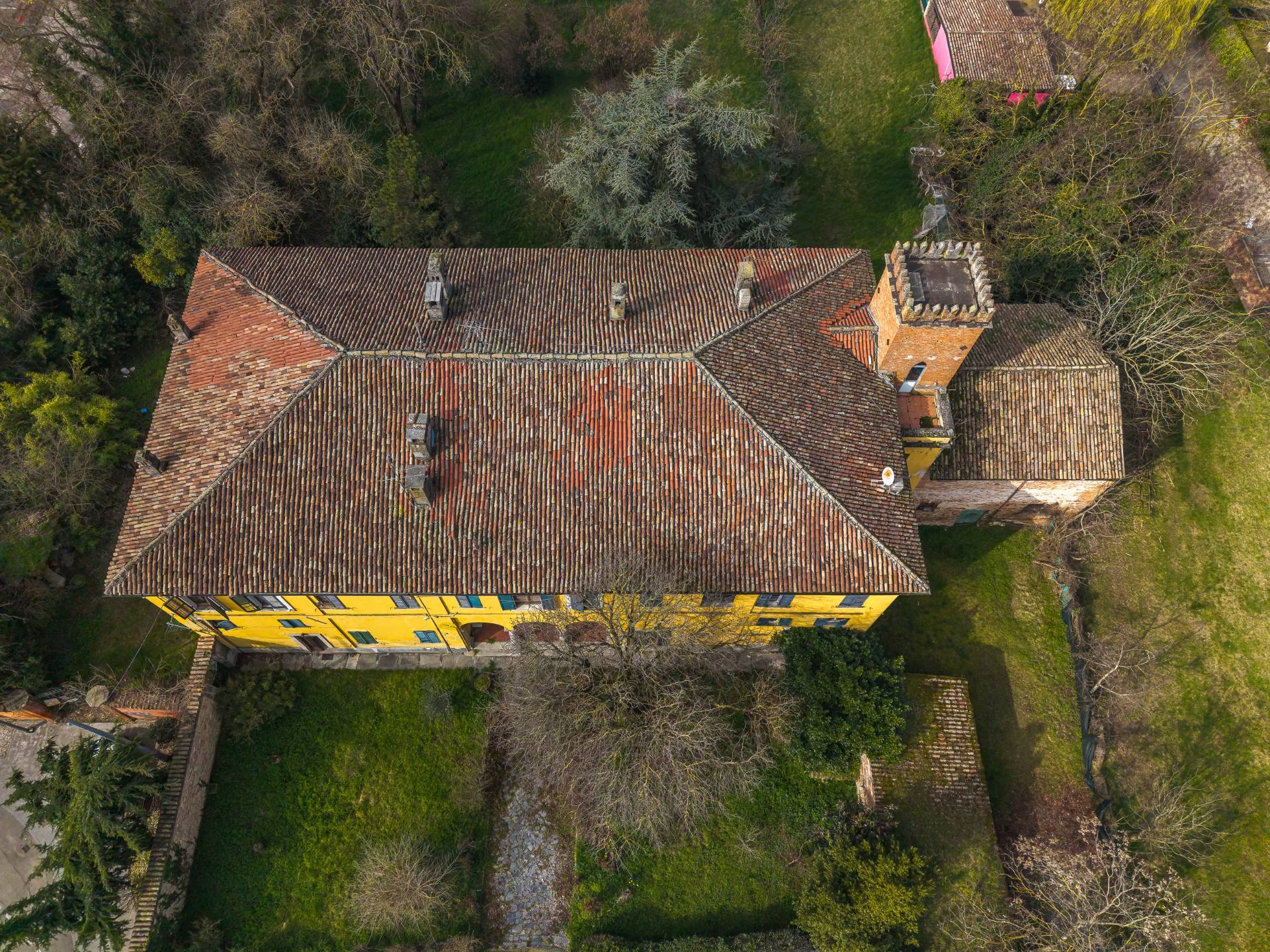A impreziosire ulteriormente larea esterna vi la presenza di una pianta di particolare interesse storico e botanico, lArancio degli Osagi, elemento raro e distintivo che contribuisce ad accrescere il valore identitario e il fascino della propriet.
