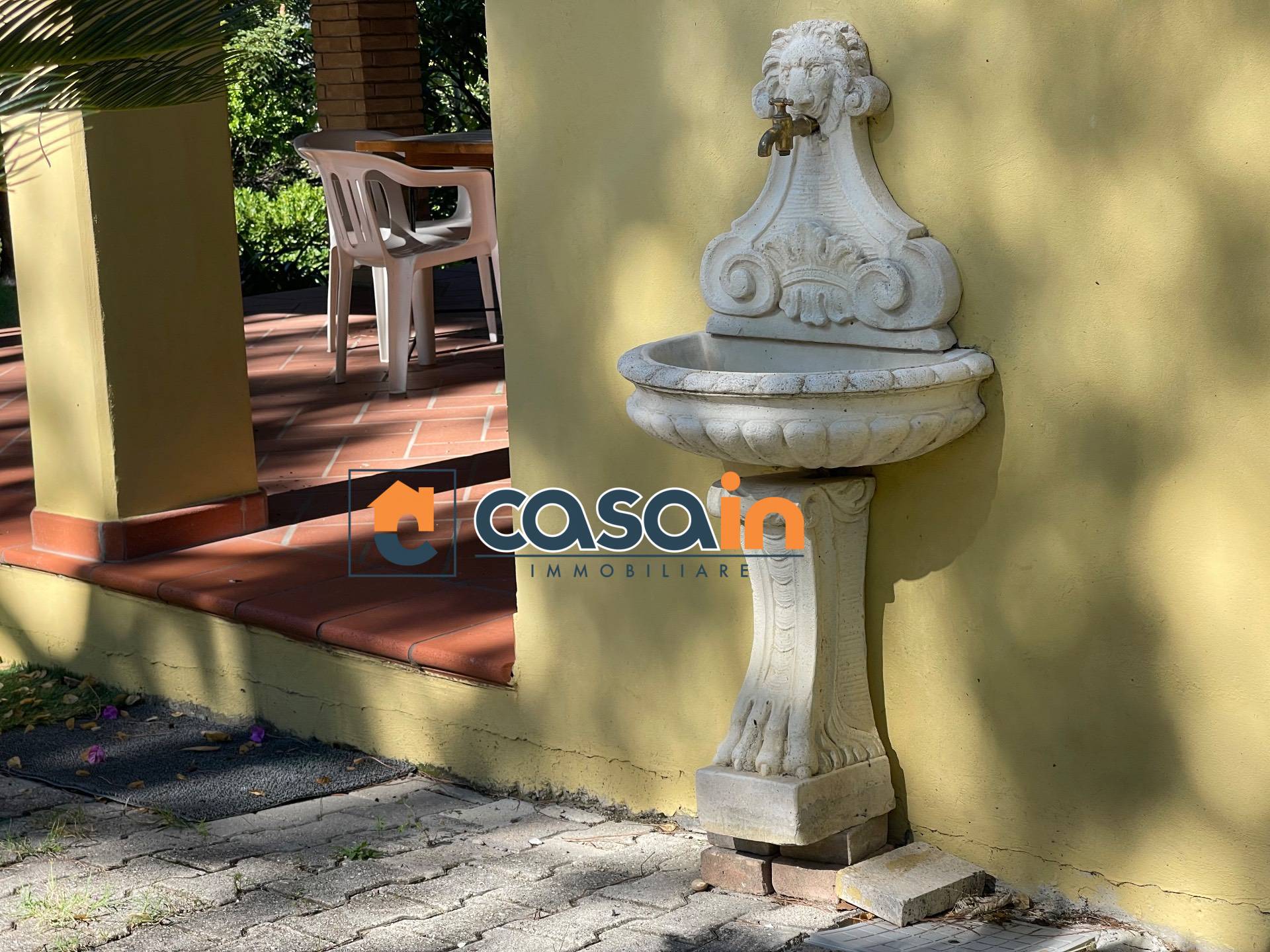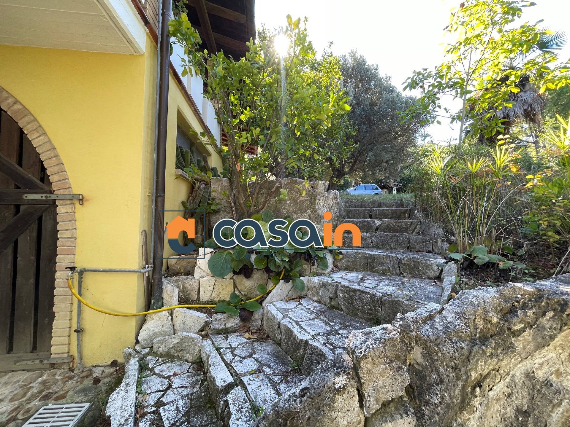 La propriet completamente delimitata da recinzione o siepi, dotata di cancello elettrico all'ingresso, disposta su tre livelli: piano terra ampio e accogliente soggiorno con camino, cucina abitabile e luminosa, un bagno di servizio e un doppio portico con tettoia in legno, uno vista mare esposto ad est e l'altro all'ingresso principale.