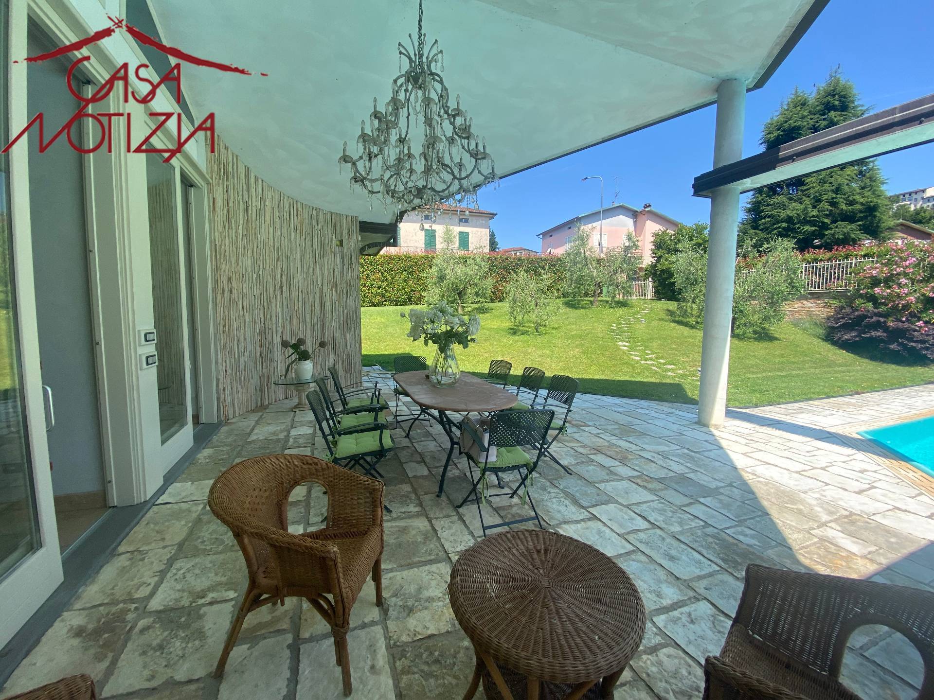 L'immobile risulta molto luminoso grazie all'ottima esposizione e alle grandi superfici vetrate dalle quali possiamo godere di splendidi affacci sulla bella piscina e sul giardino.