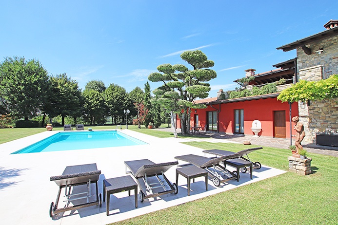 In fronte alla casa principale ed affacciata sull'ampio parco si trova una grande piscina con prendisole e trampolino, dotata di area doccia esterna oltre che di area di servizio interna e di area interrata di circa 80 mq dedicata a cantina vini e locali di deposito attrezzi.