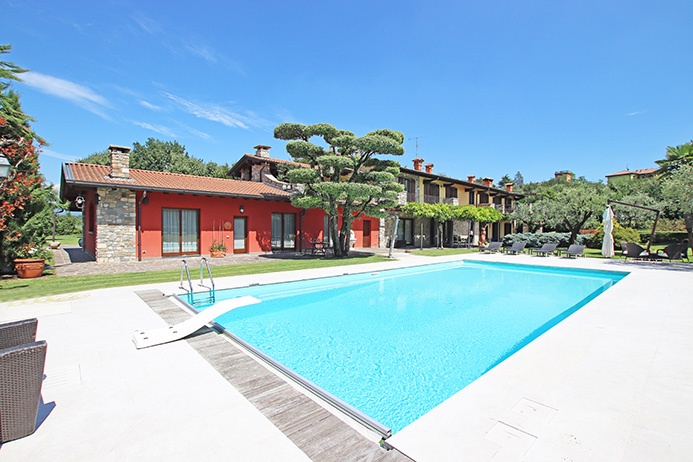 In fronte alla casa principale ed affacciata sull'ampio parco si trova una grande piscina con prendisole e trampolino, dotata di area doccia esterna oltre che di area di servizio interna e di area interrata di circa 80 mq dedicata a cantina vini e locali di deposito attrezzi.