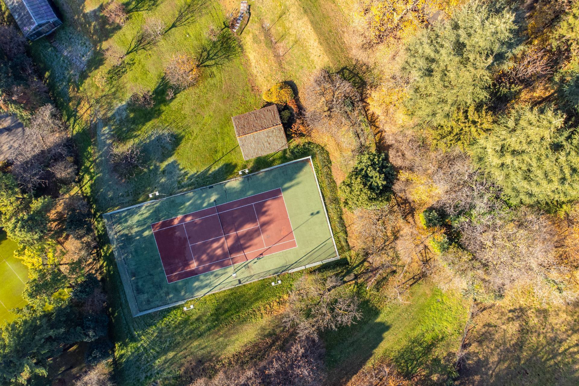 Questa propriet straordinaria comprende una splendida villa padronale, una cascina con scuderia in parte trasformata in dependance, e una serie di servizi esclusivi che includono una piscina panoramica con idromassaggio, un campo da tennis privato, un campo da calcio amatoriale e persino un eliporto.