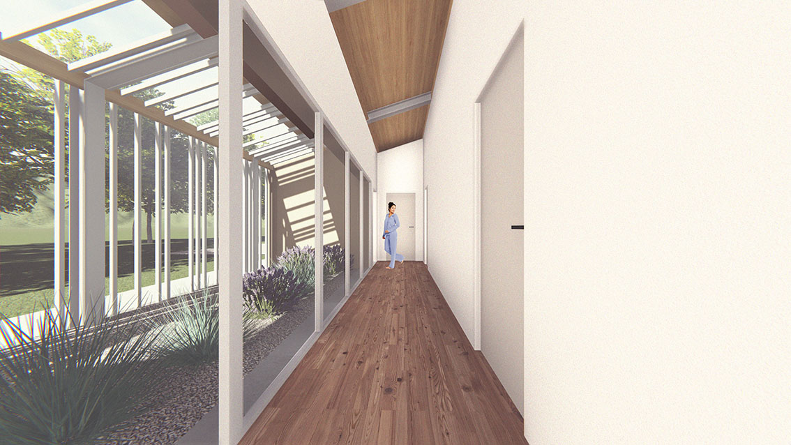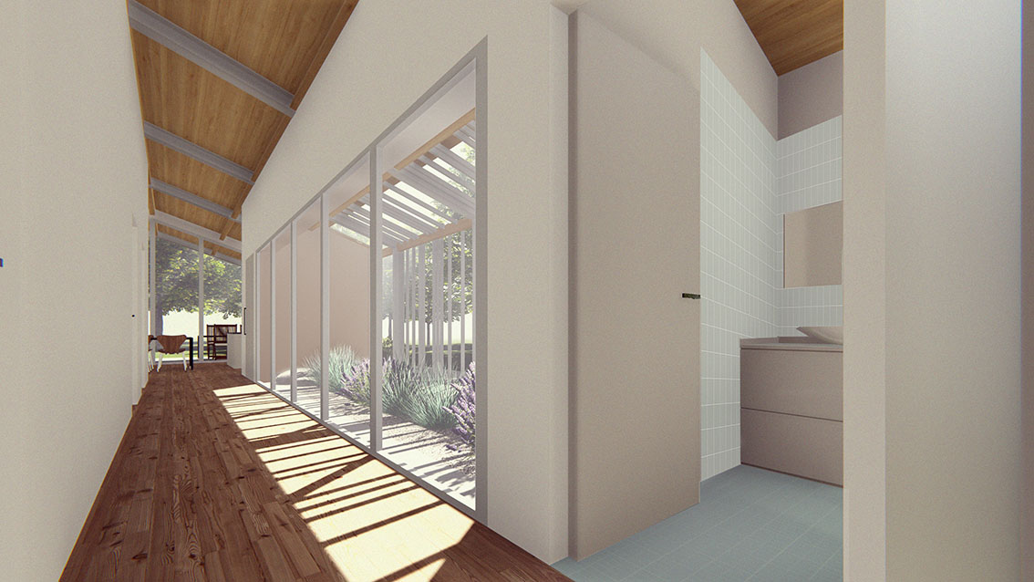 Questo spazio delimitato da una nuova pelle dell'involiucro caratterizzato da un piccolo giardino che ha lo scopo di introdurre gradualmente all'interno dello spazio abitativo mantenendo un continuo contatto con lo spazio esterno.