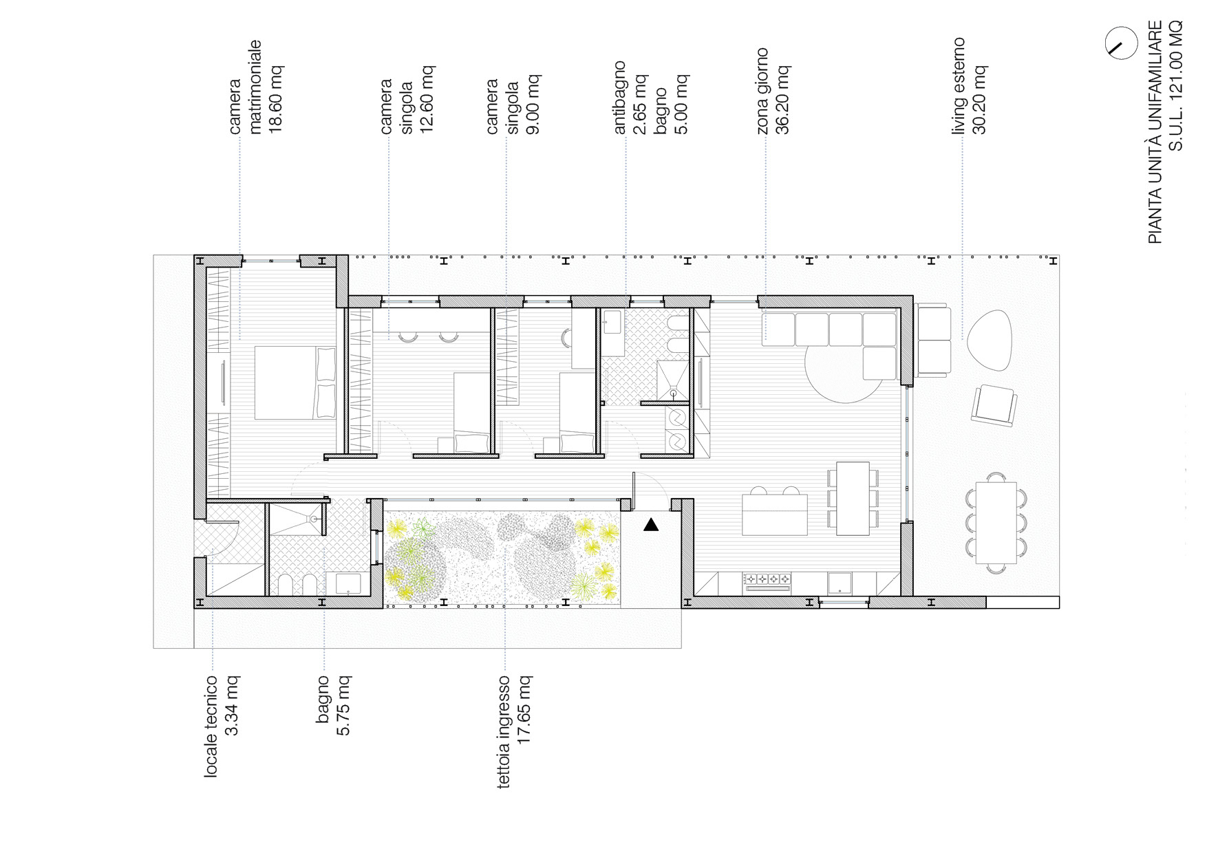 A sud viene inserita un'ampia zona giorno in cui sono collocate rispettivamente la zona cucina e la zona living.