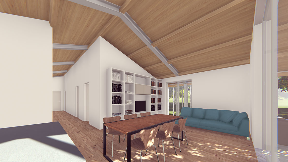 L'ambiente risulta molto luminoso in quanto presenta due lati finestrati e un'ampia vetrata sul prospetto sud, collegato con lo spazio esterno coperto da una grande tettoia.