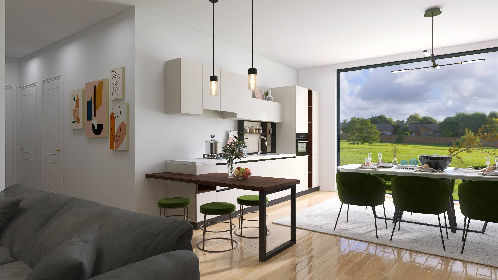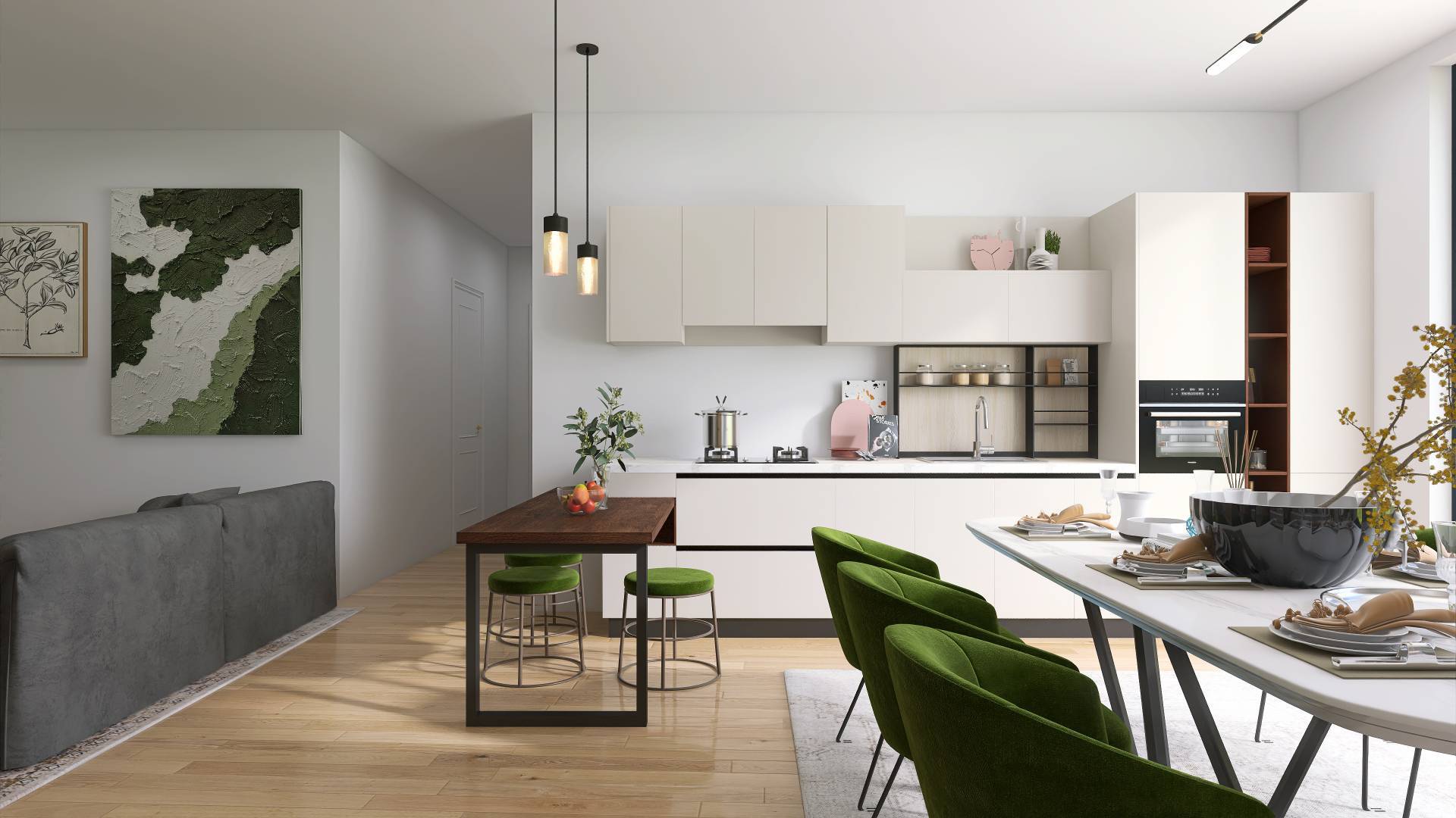 Lo spazio arricchito da un moderno angolo cottura, perfetto per preparare deliziosi pasti e cene con gli amici e la famiglia.